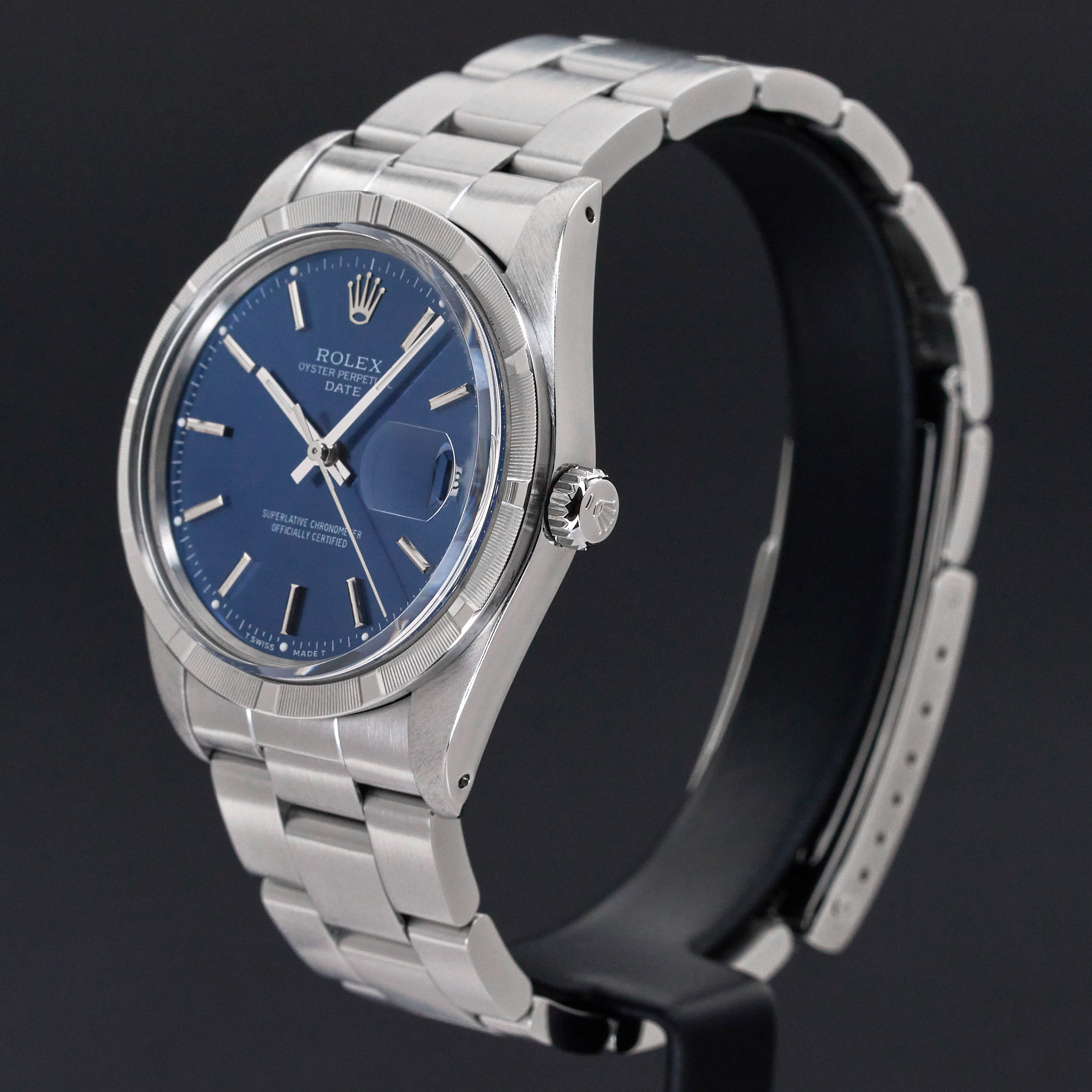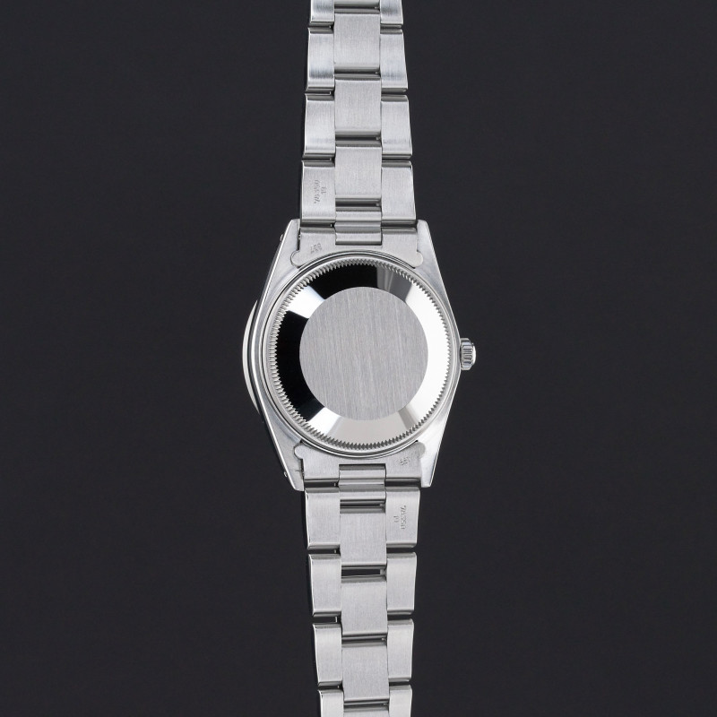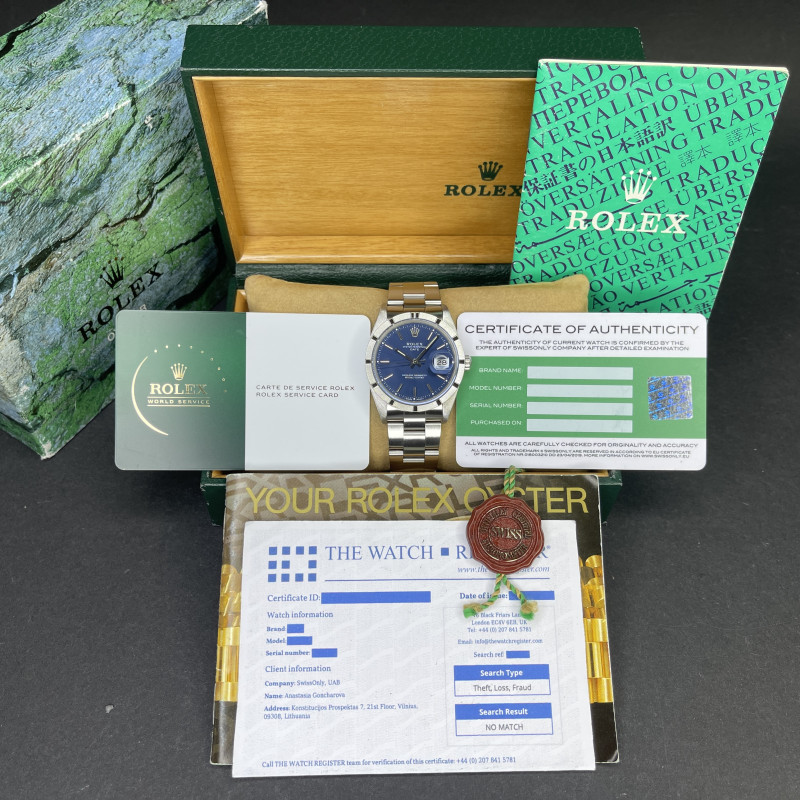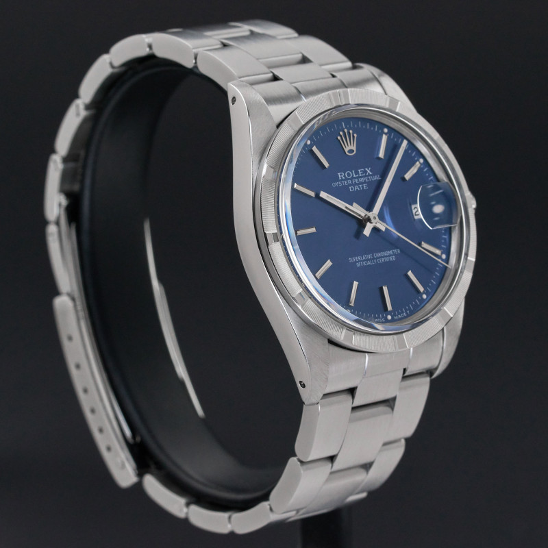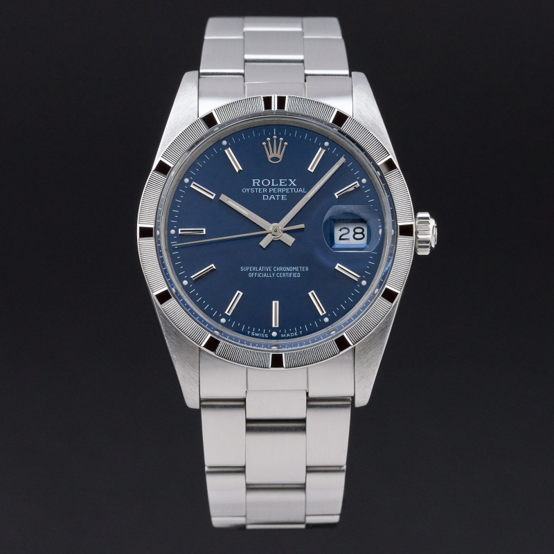 This Rolex Oyster Perpetual Date 15010 features a Blue dial and is crafted from stainless steel, with a production year of 1988.