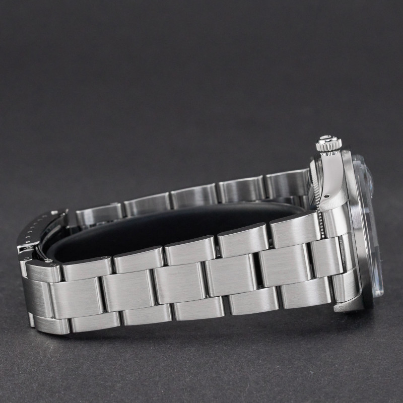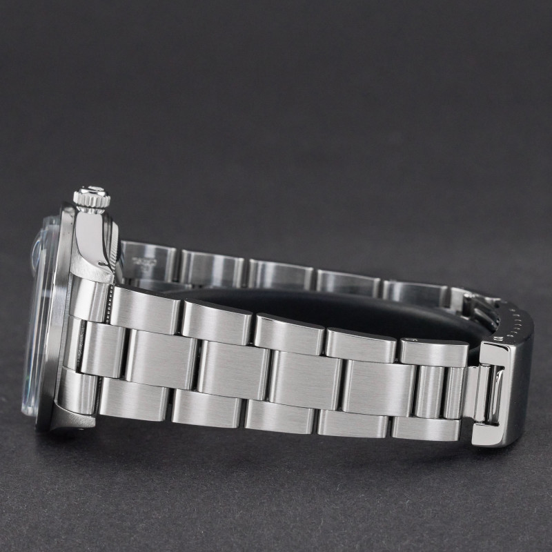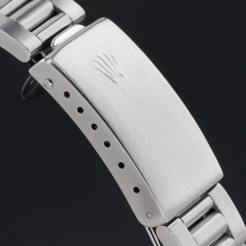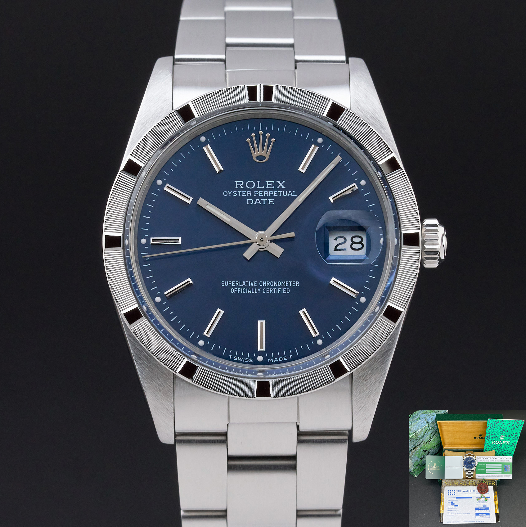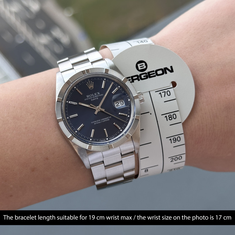 This Rolex Oyster Perpetual Date 15010 features a Blue dial and is crafted from stainless steel, with a production year of 1988.