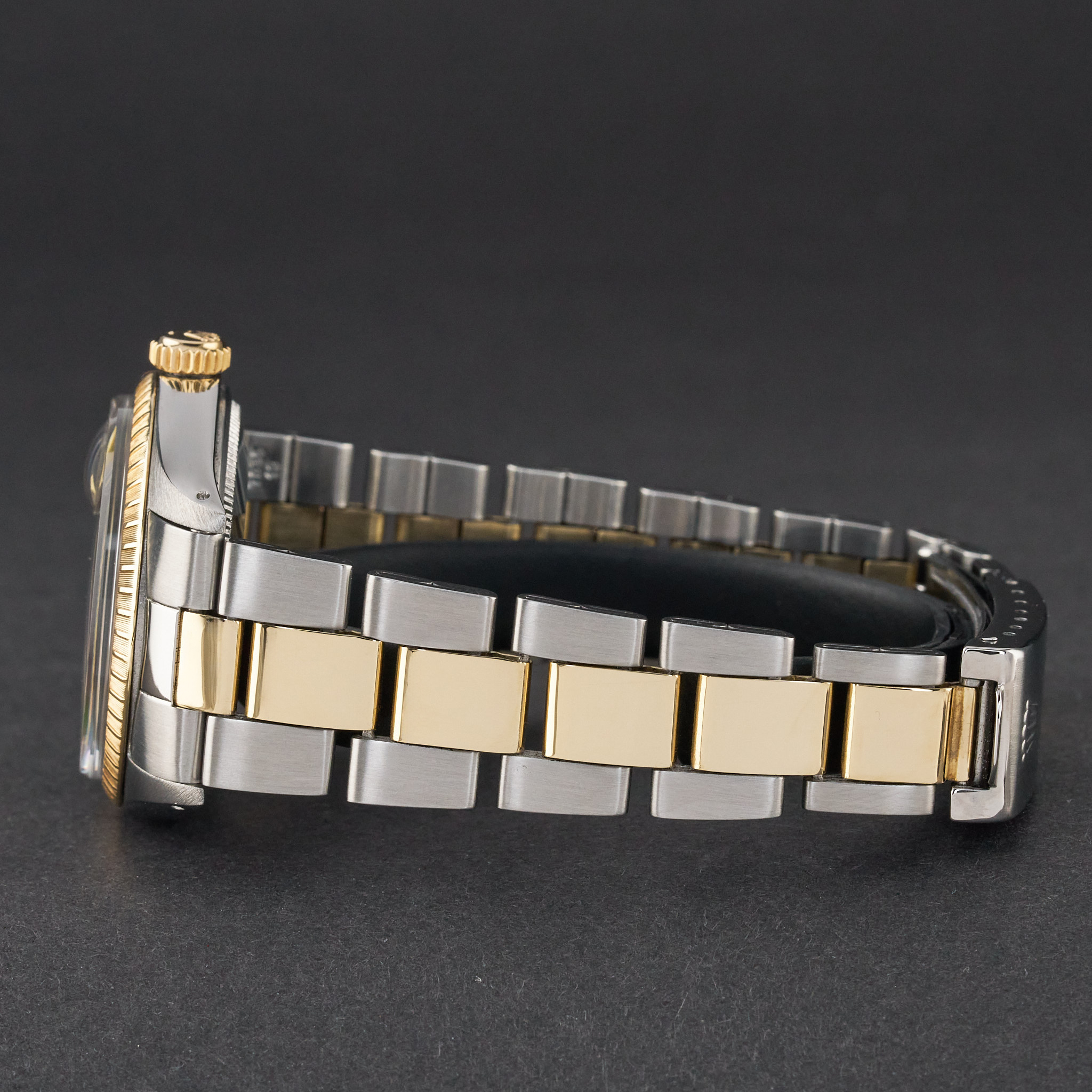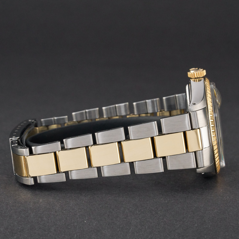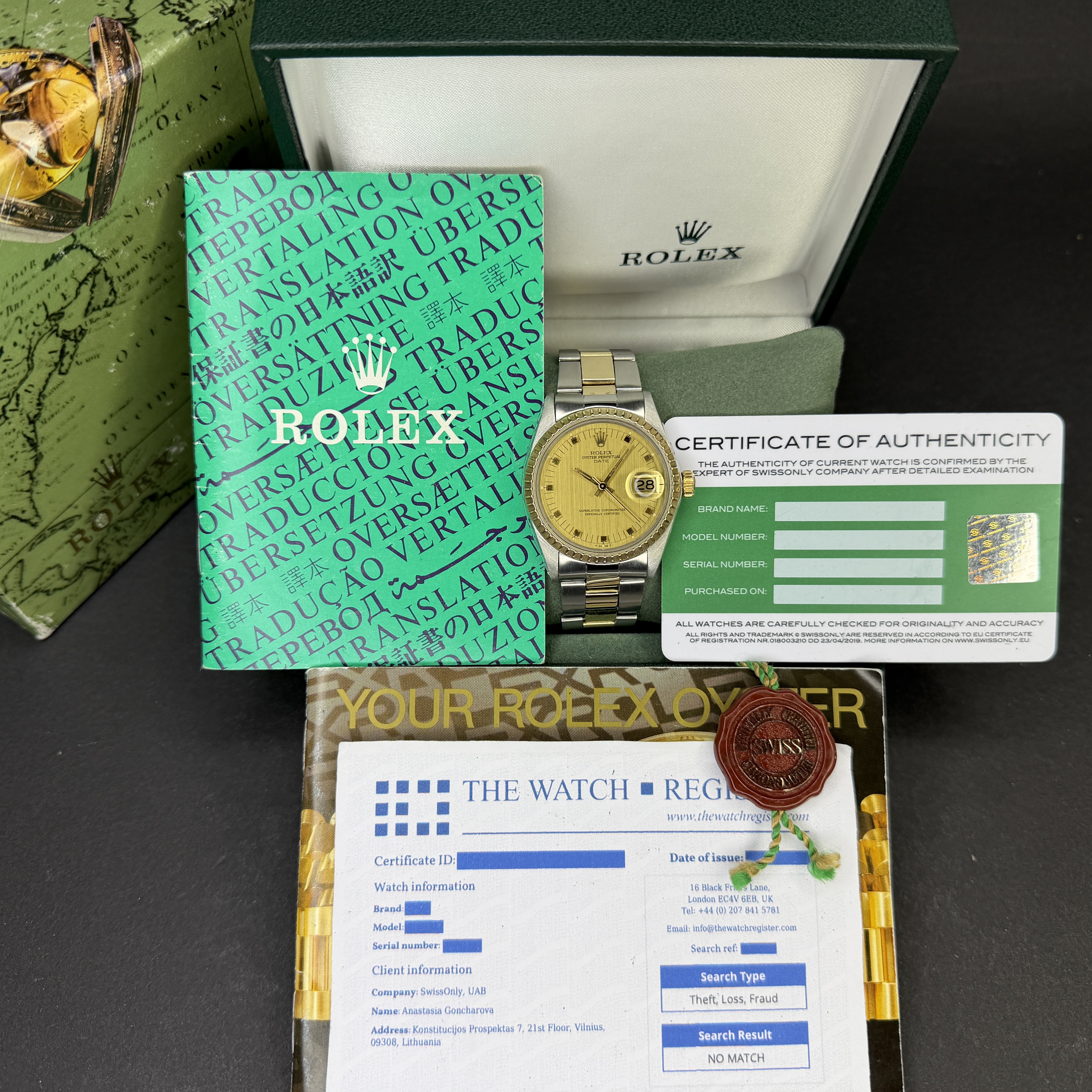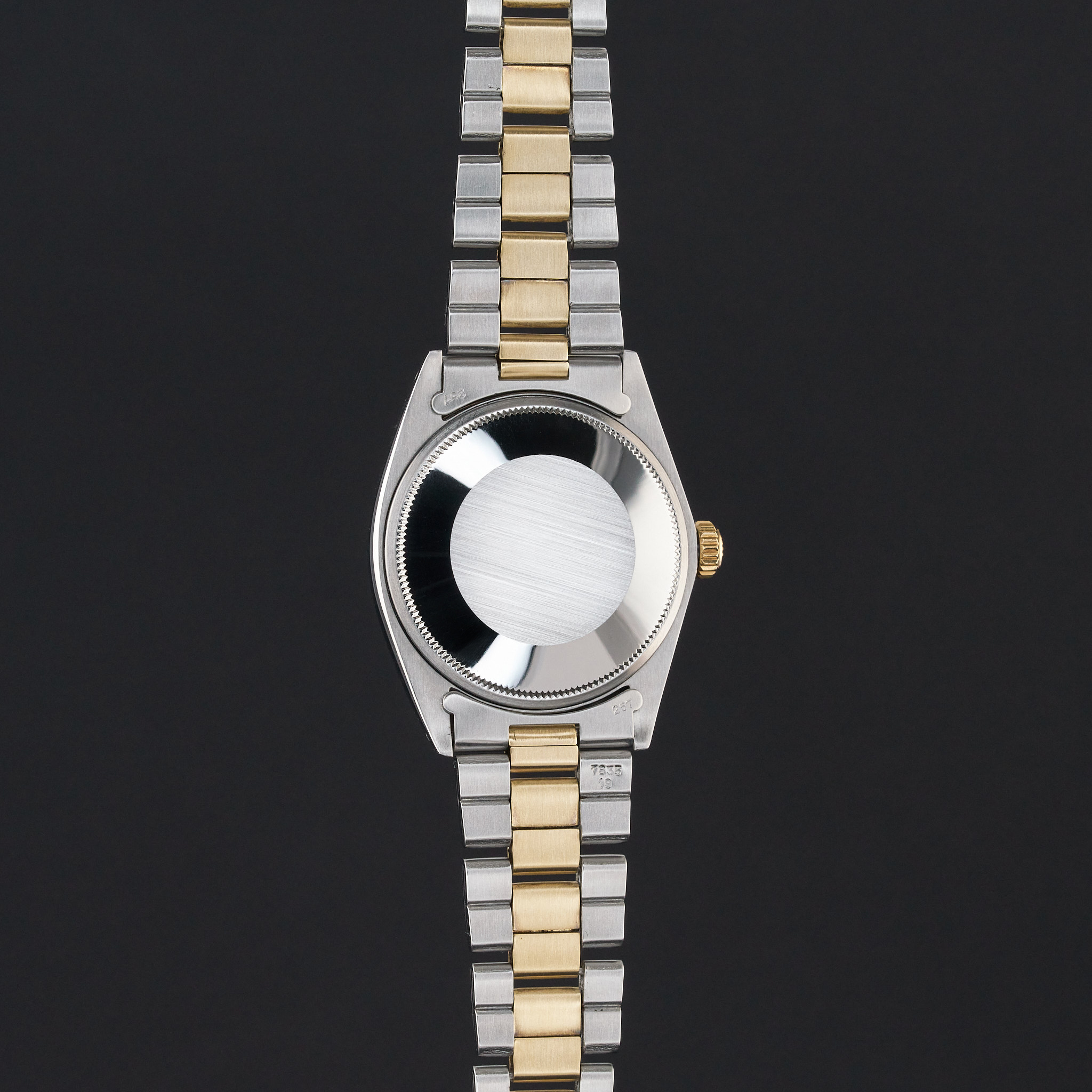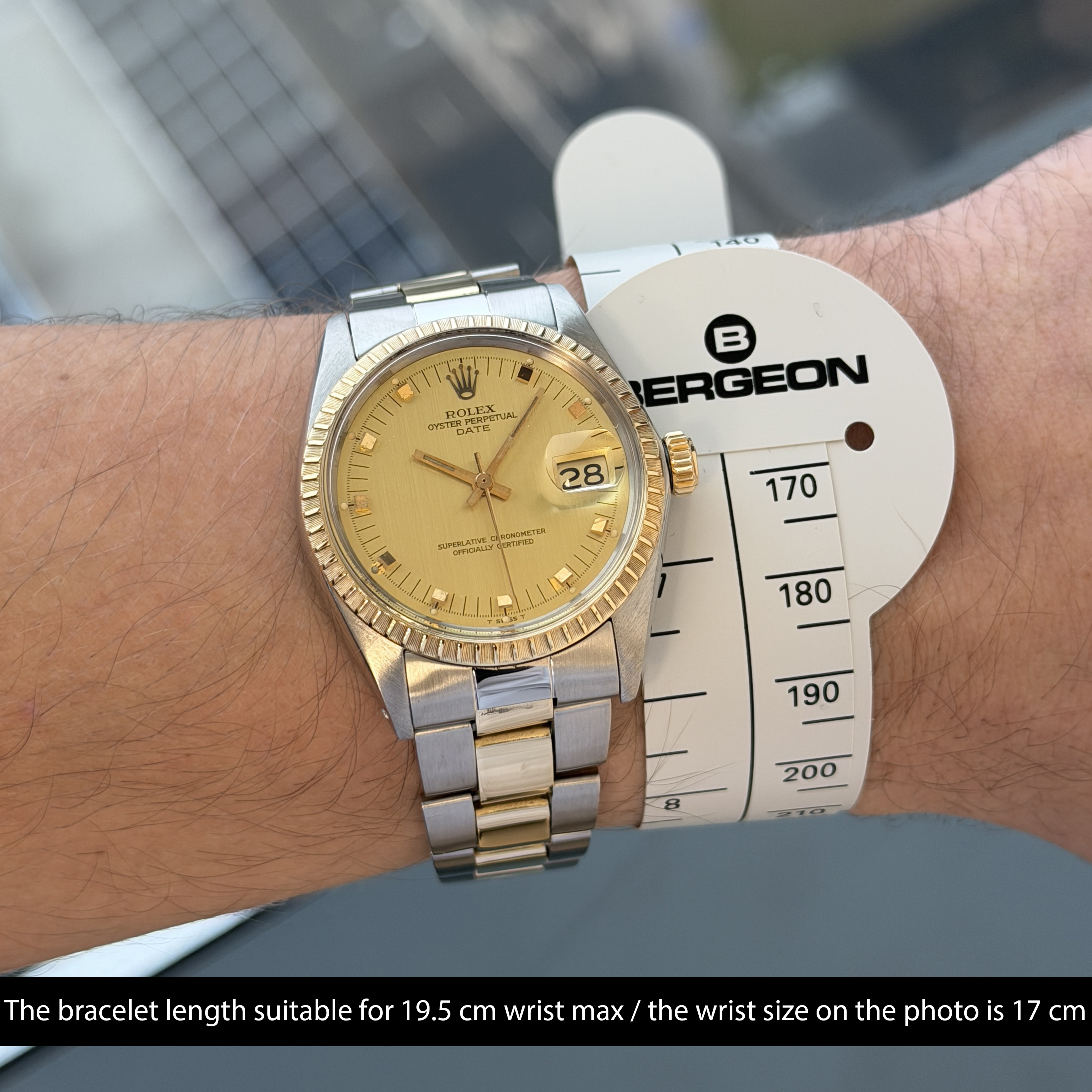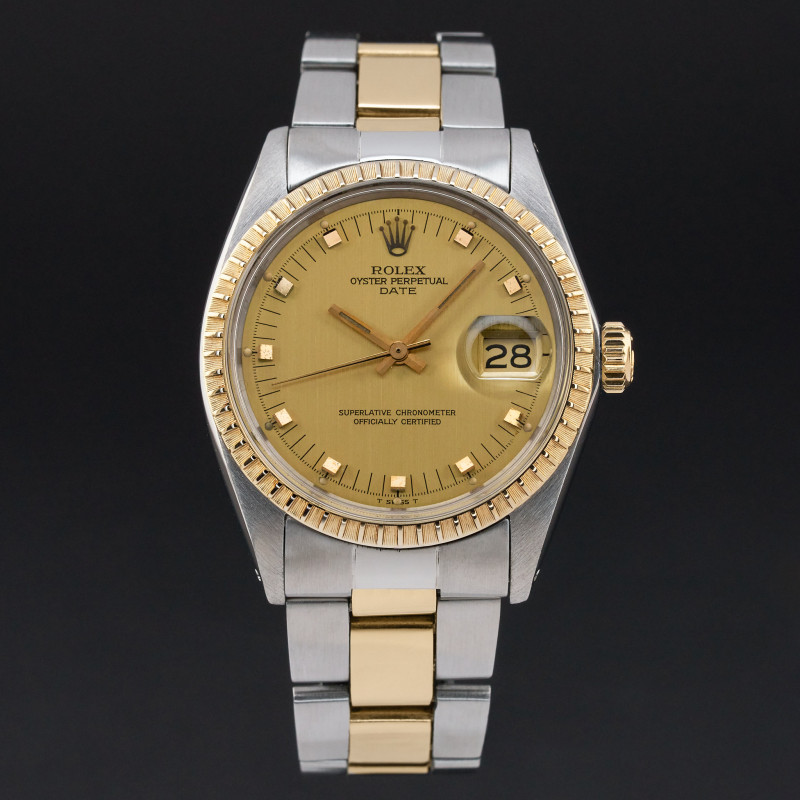 This Rolex Oyster Perpetual Date 1505 features a Champagne dial and is crafted from 18K yellow gold and stainless steel, with a production year of 1970.