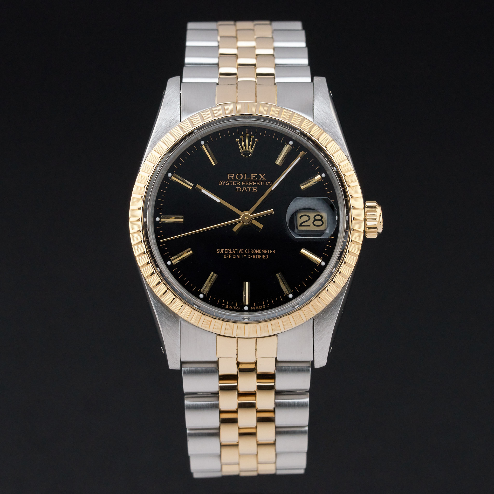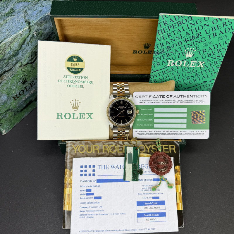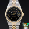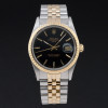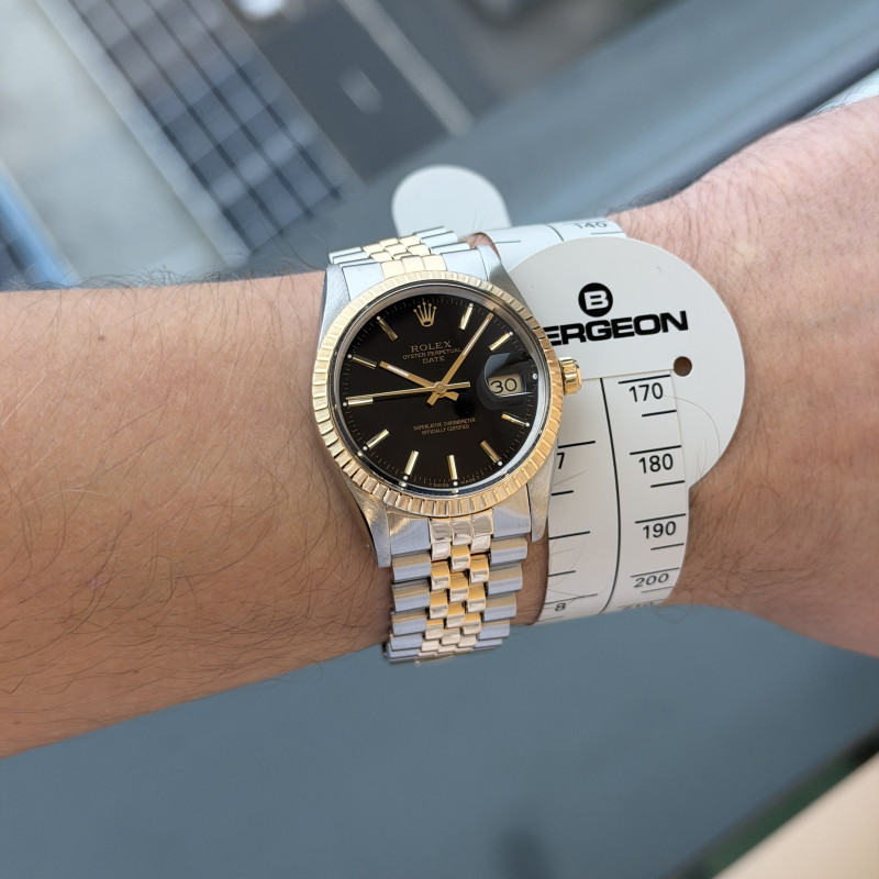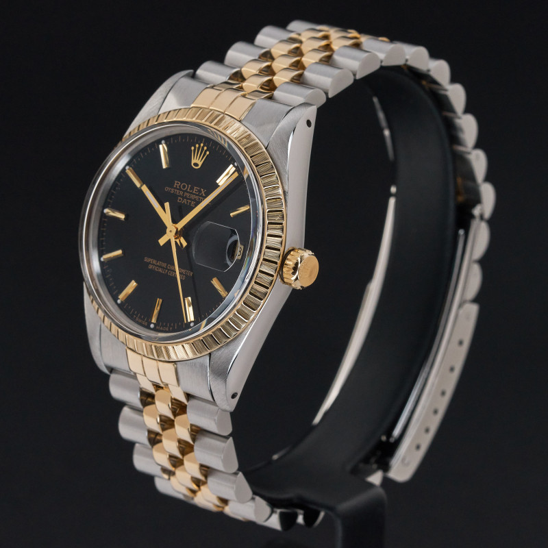 This Rolex Oyster Perpetual Date 15053 features a Black dial and is crafted from 18K yellow gold and stainless steel, with a production year of 1986.