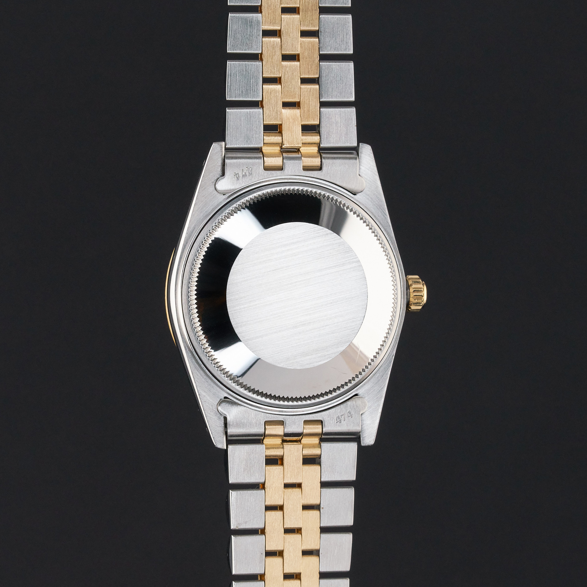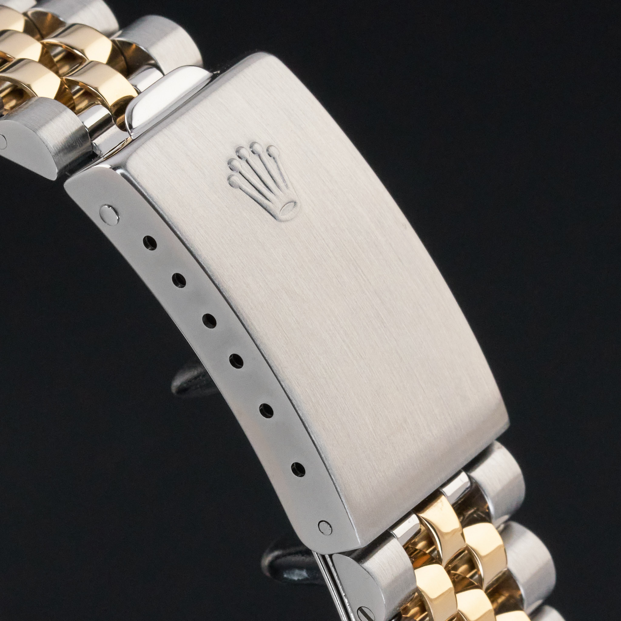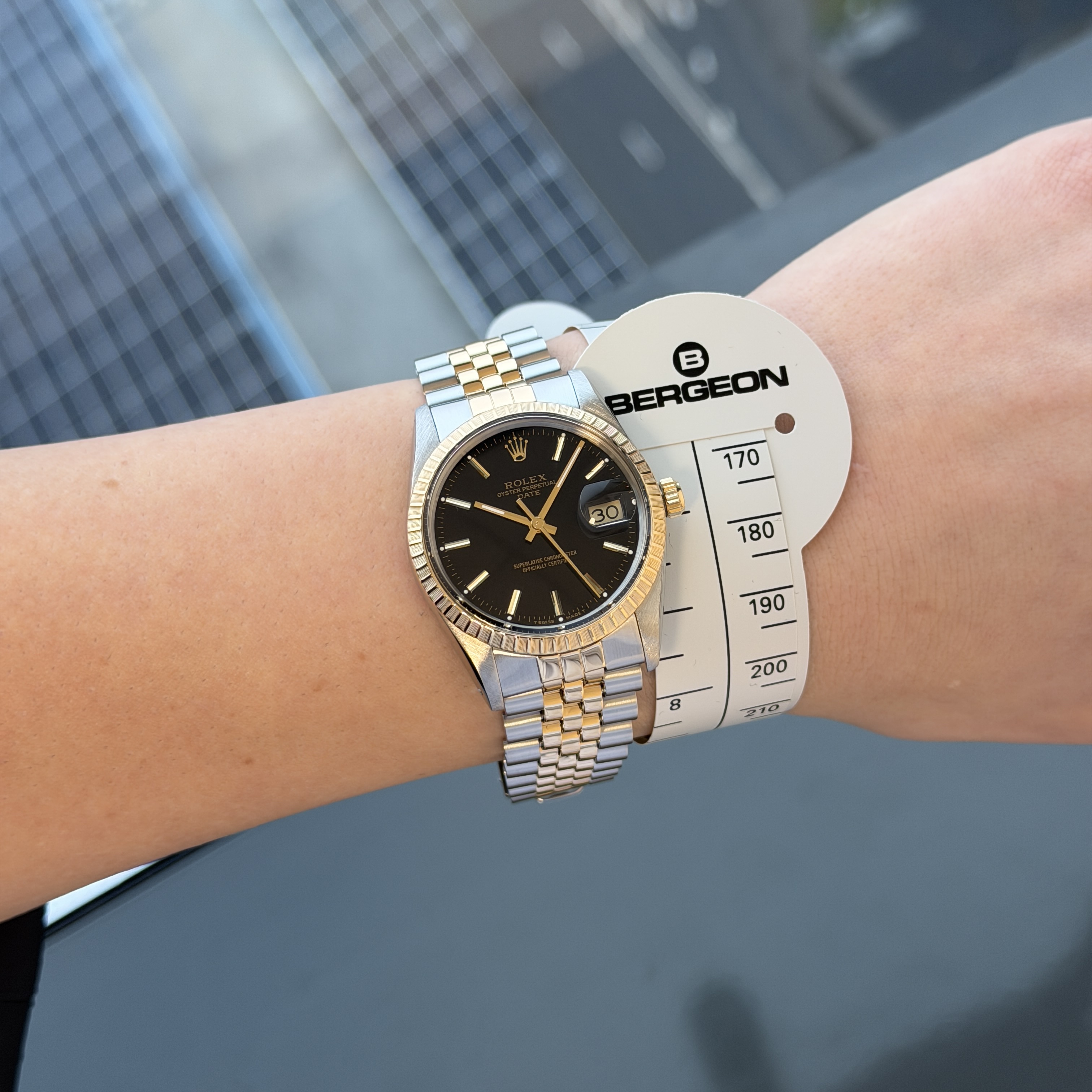 This Rolex Oyster Perpetual Date 15053 features a Black dial and is crafted from 18K yellow gold and stainless steel, with a production year of 1986.