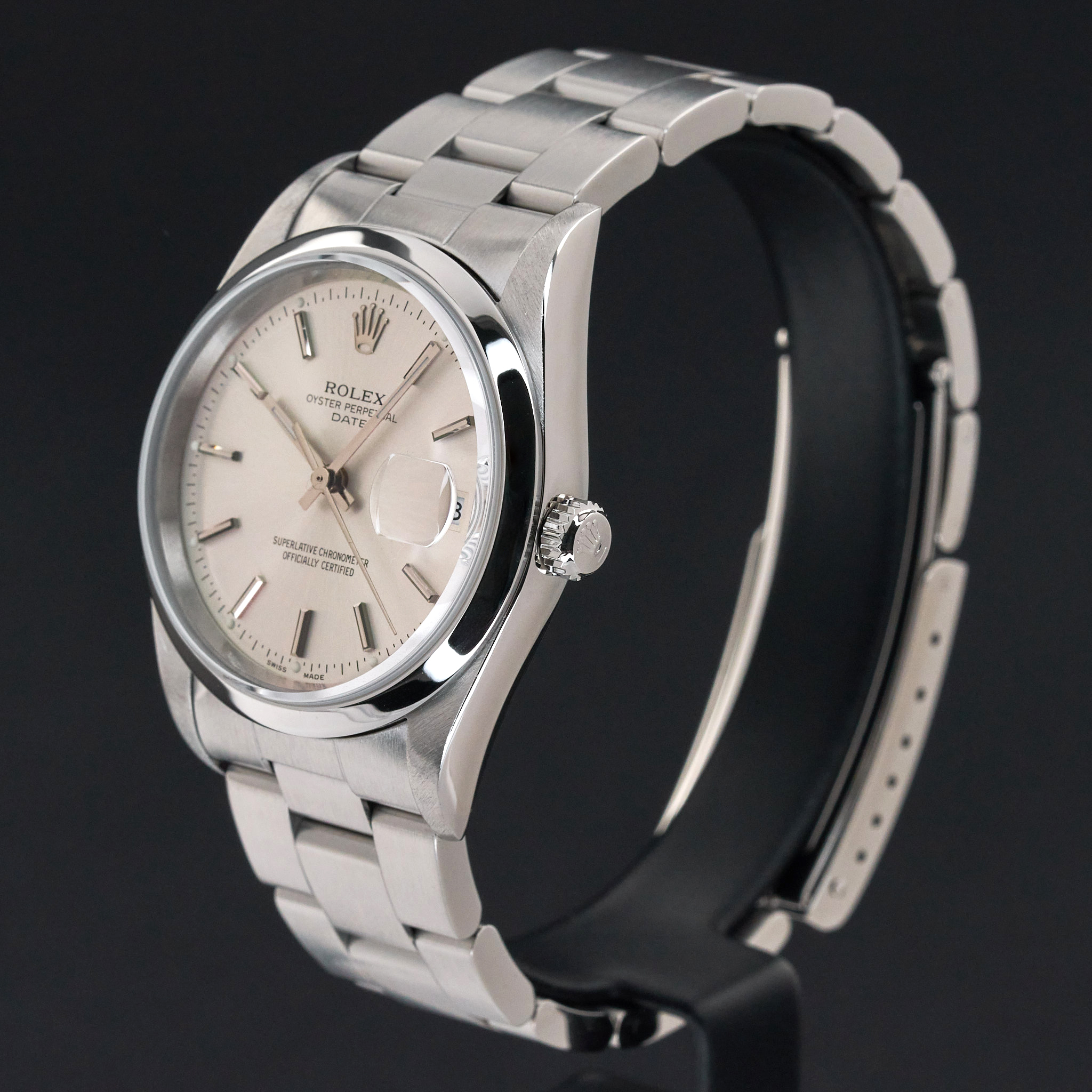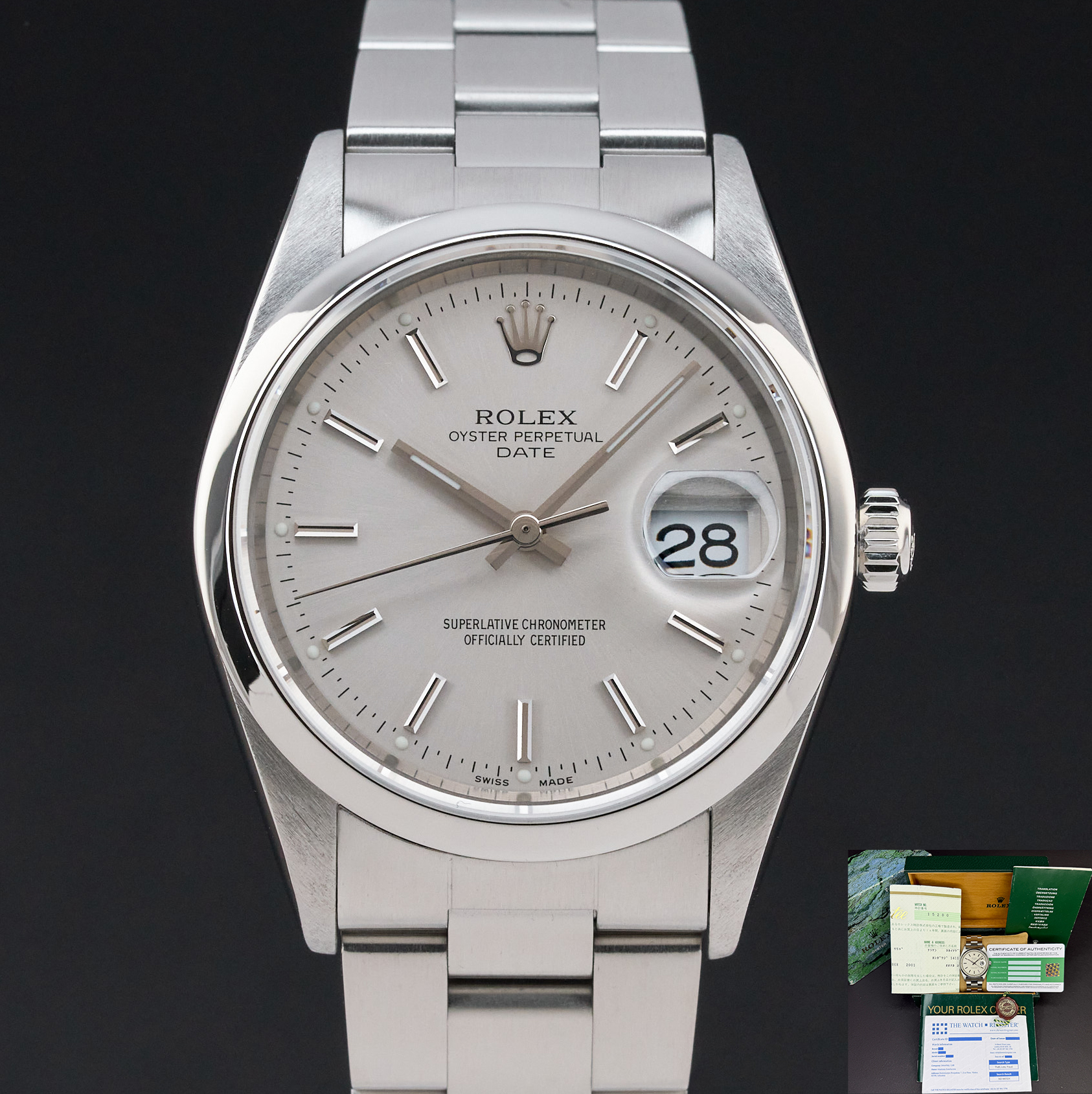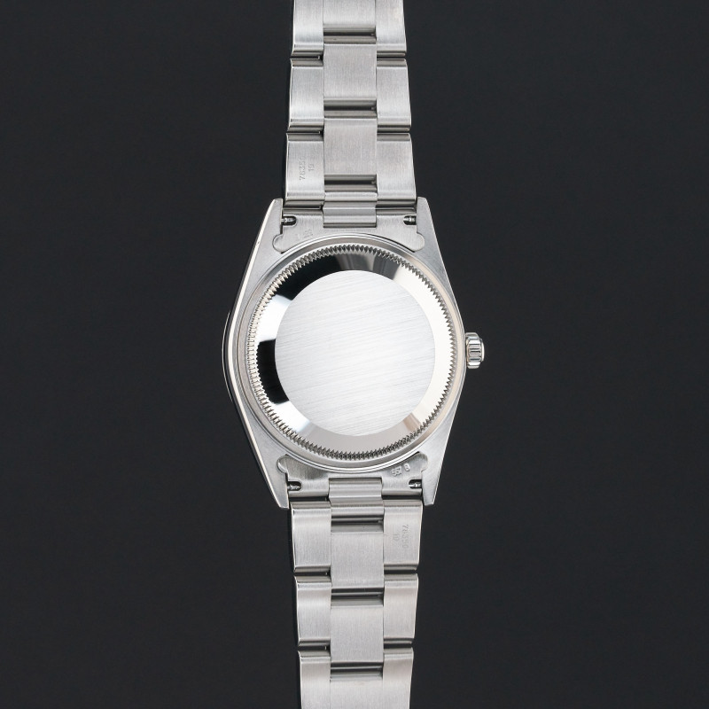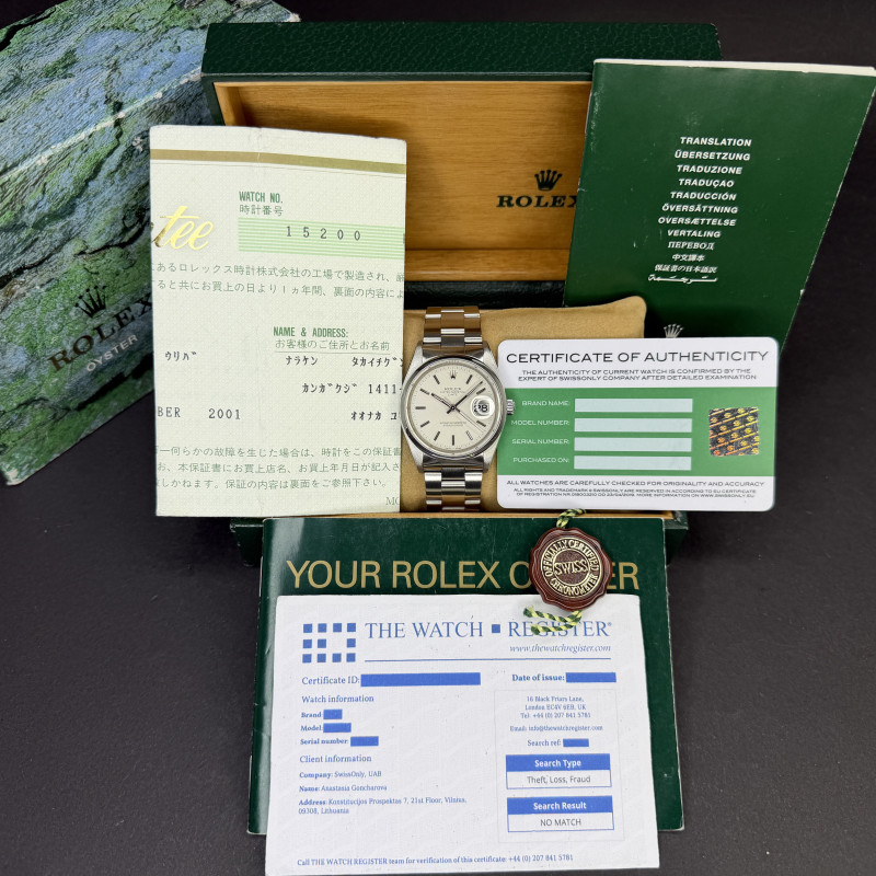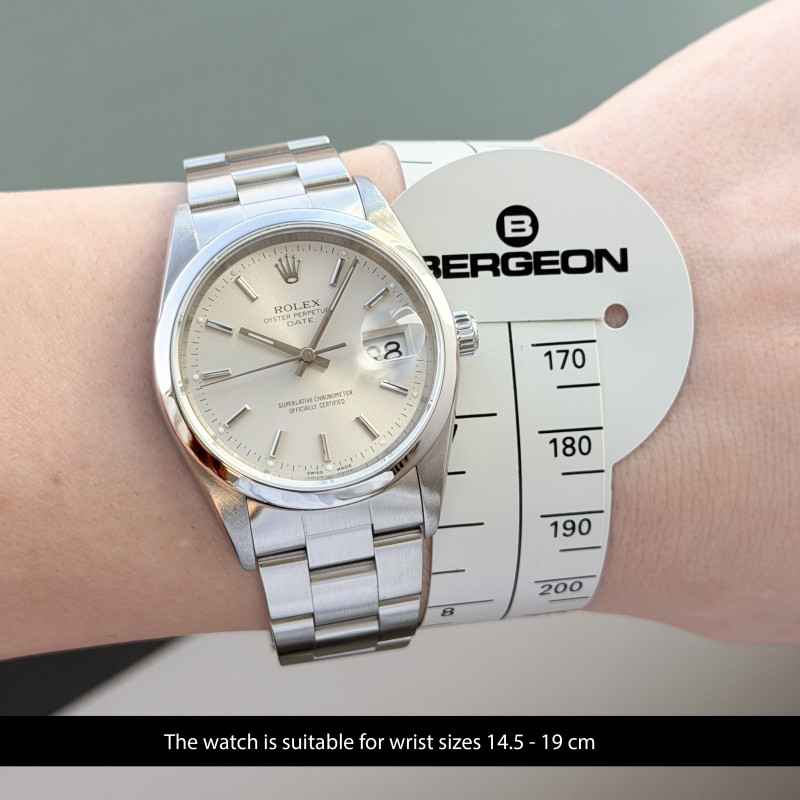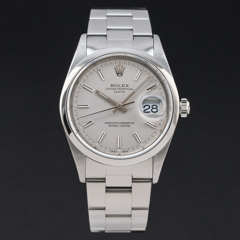 This Rolex Oyster Perpetual Date 15200 features a Silver dial and is crafted from stainless steel, with a production year of 2000.