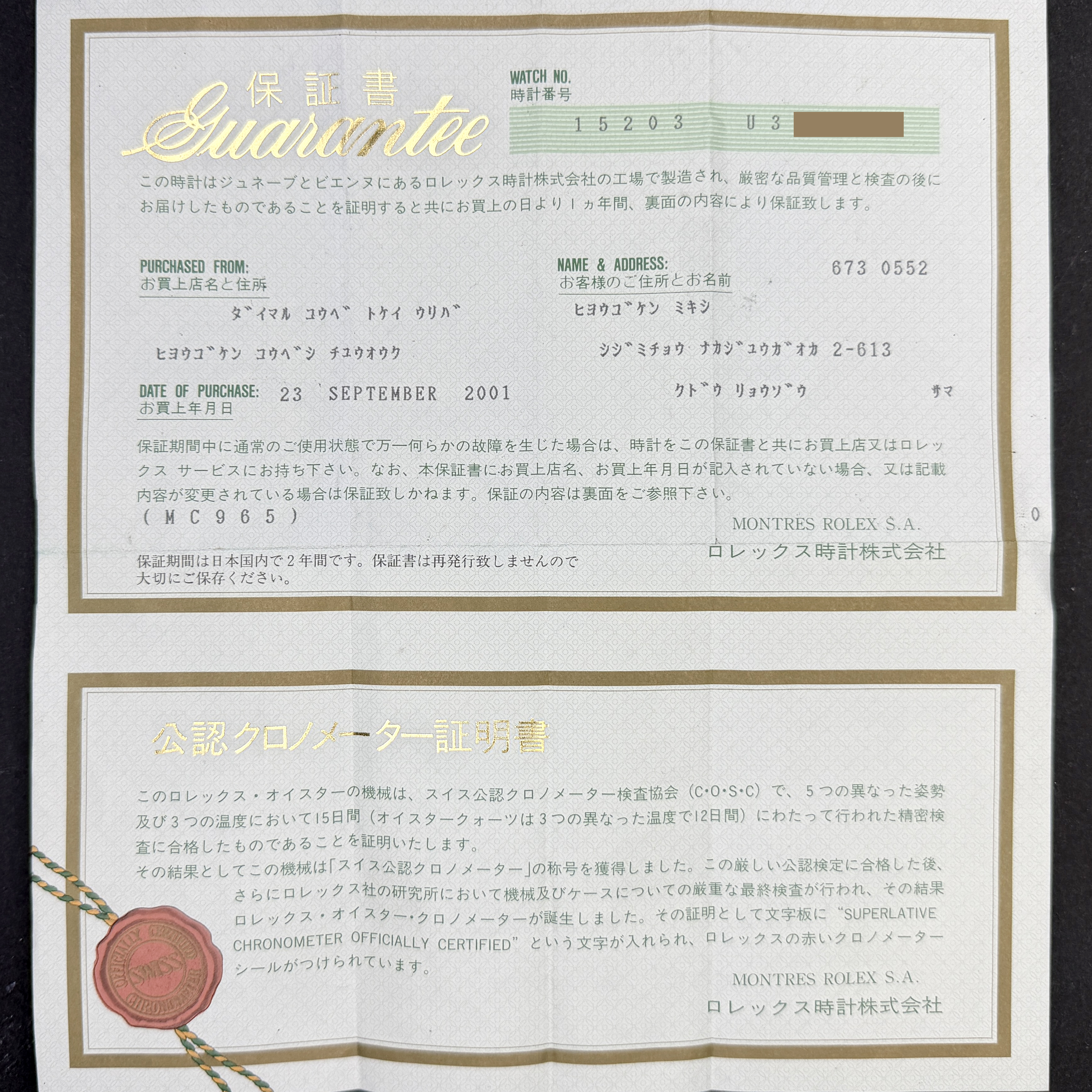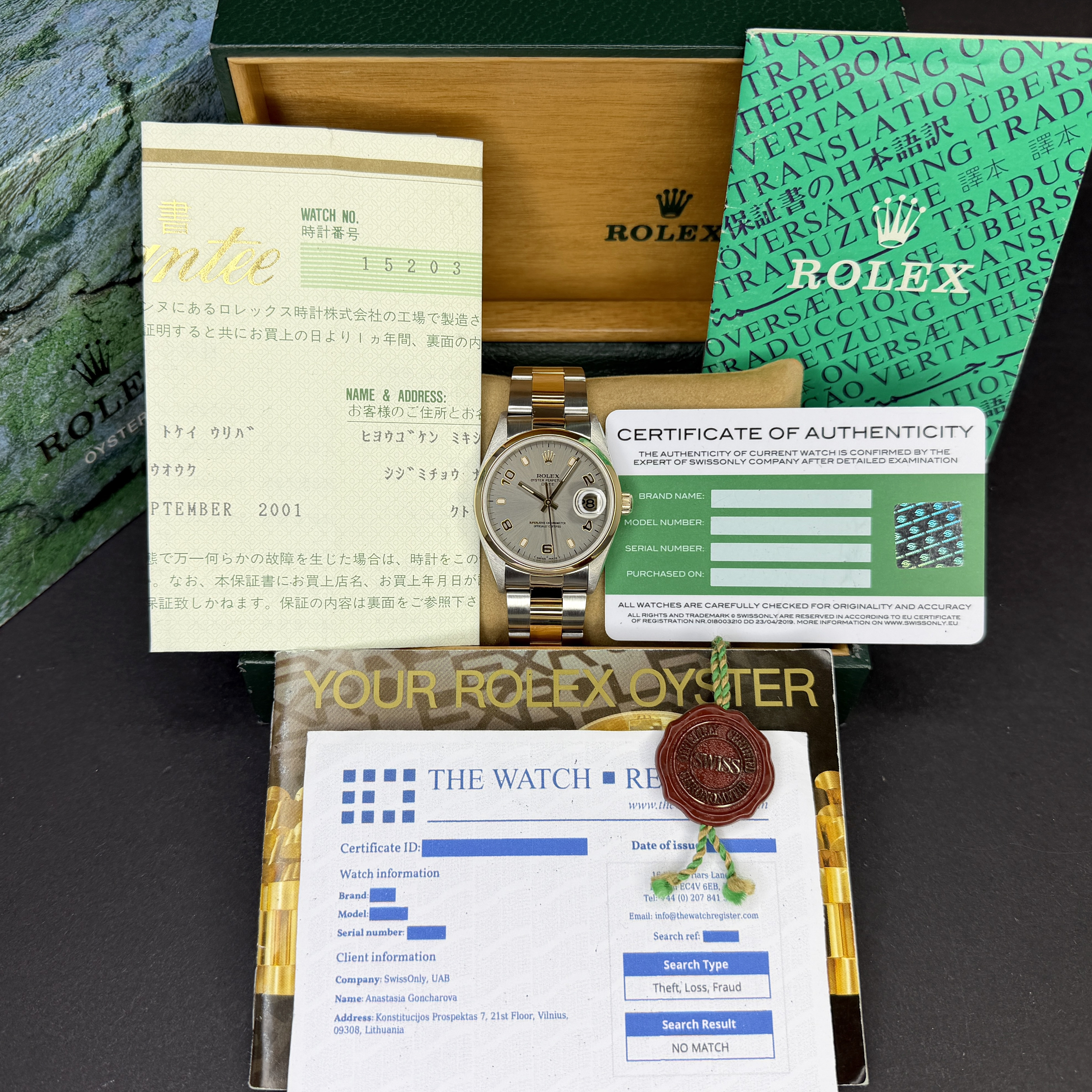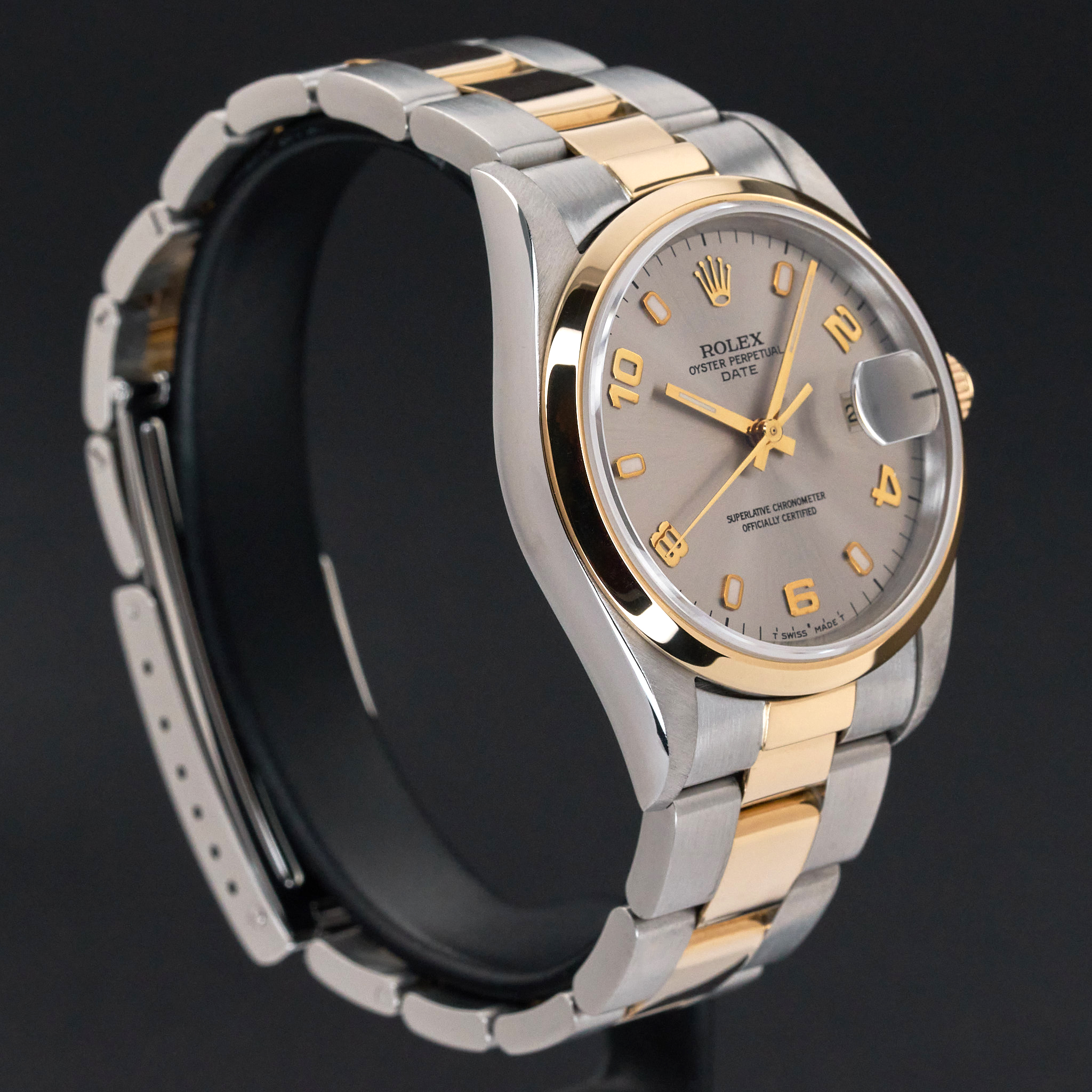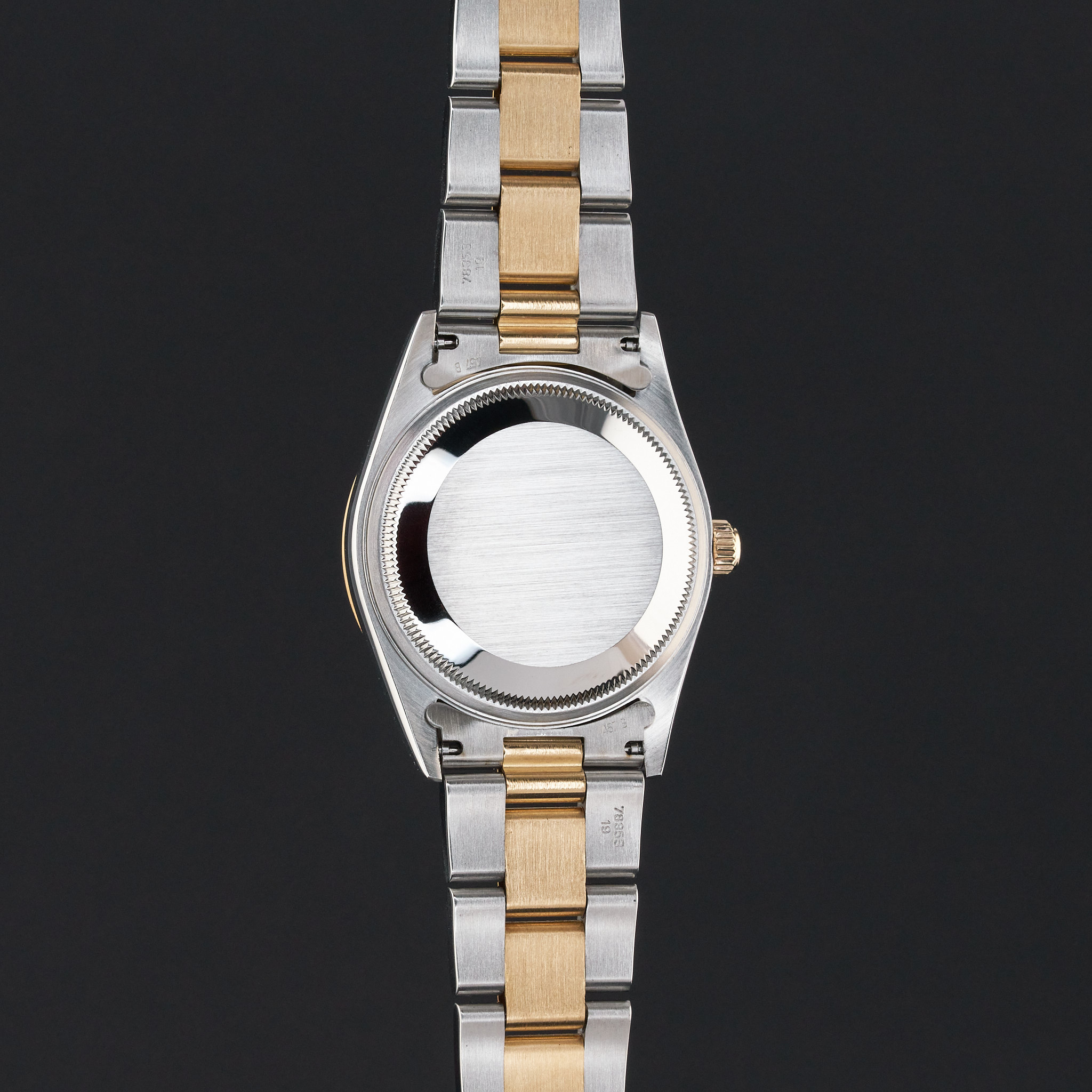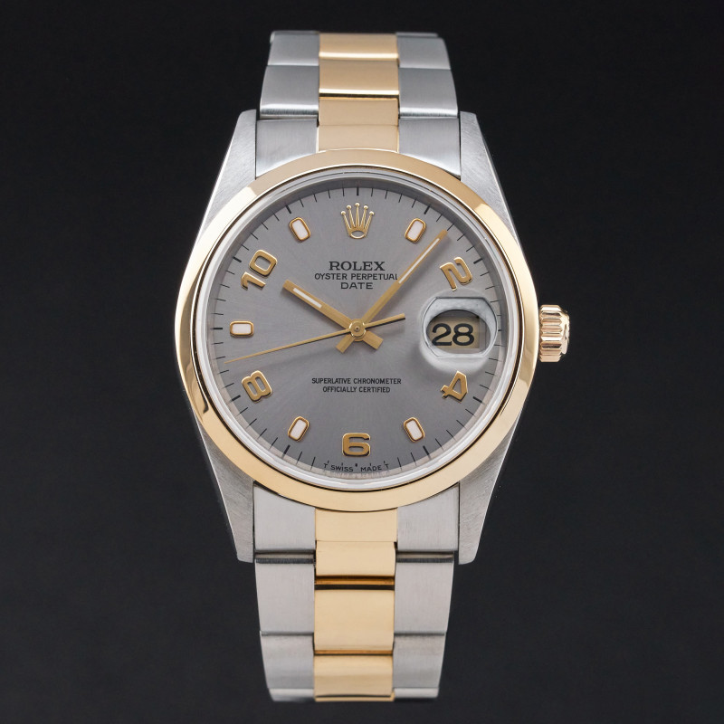 This Rolex Oyster Perpetual Date 15203 features a Grey Arabic dial and is crafted from 18K yellow gold and stainless steel, with a production year of 1997.