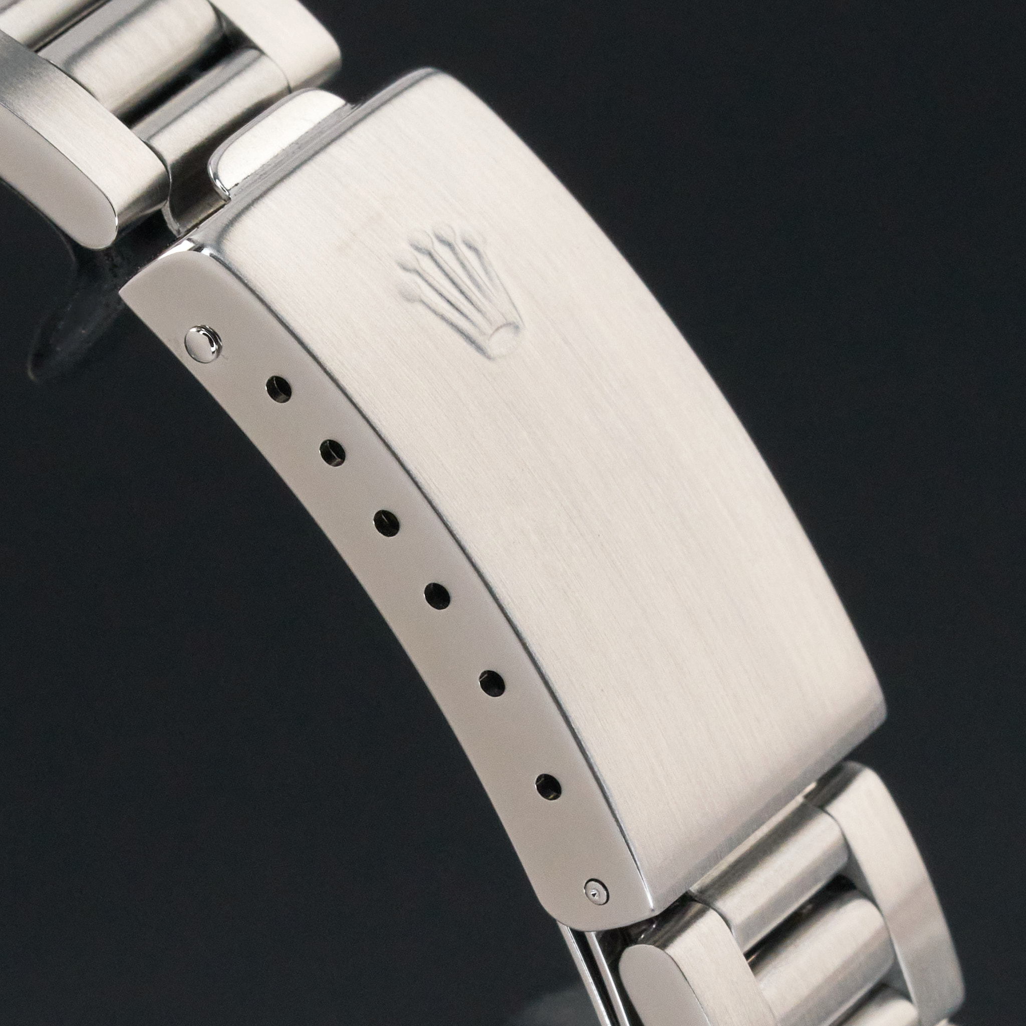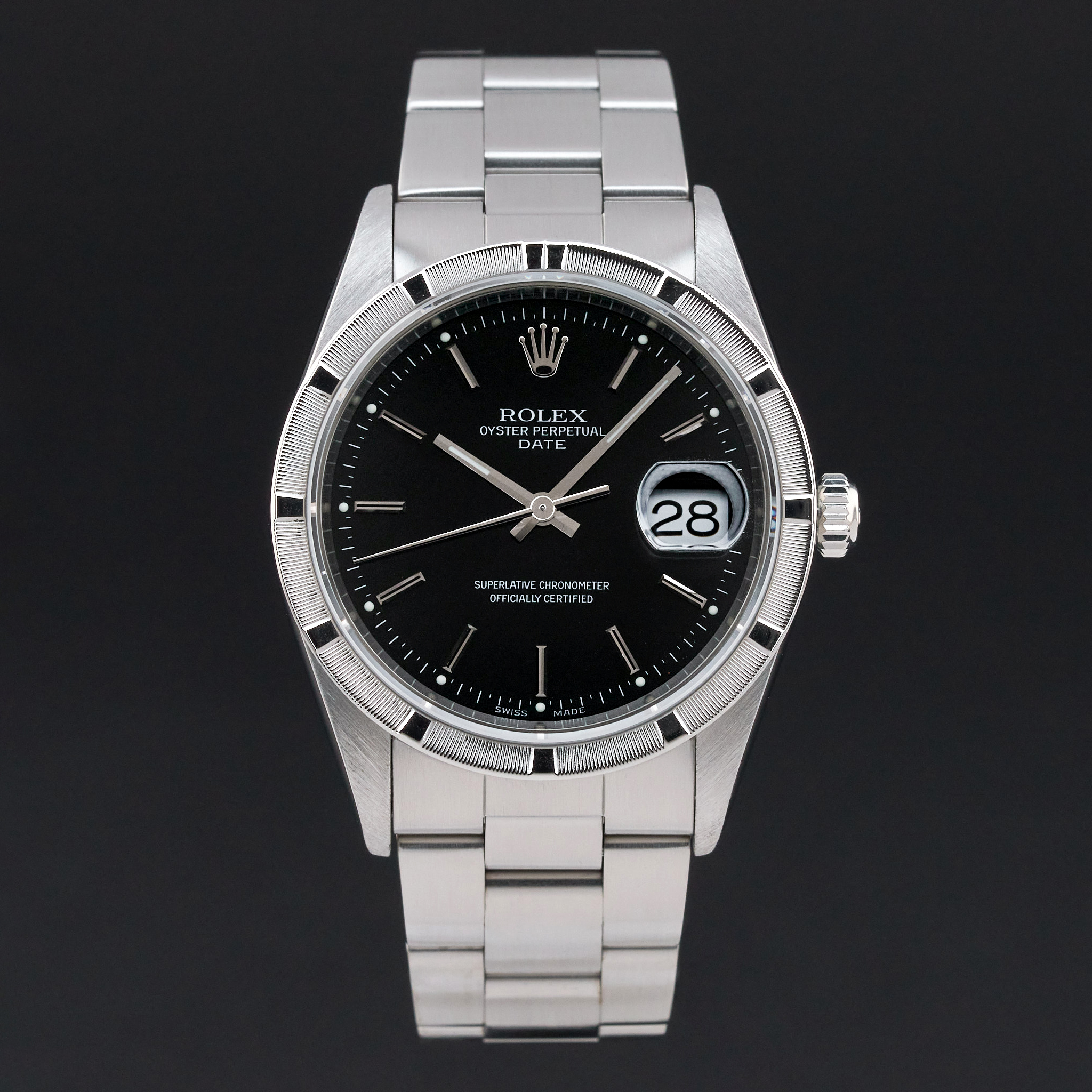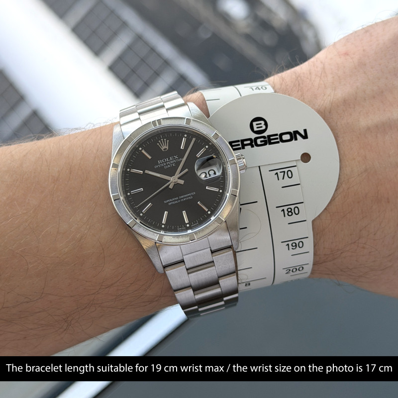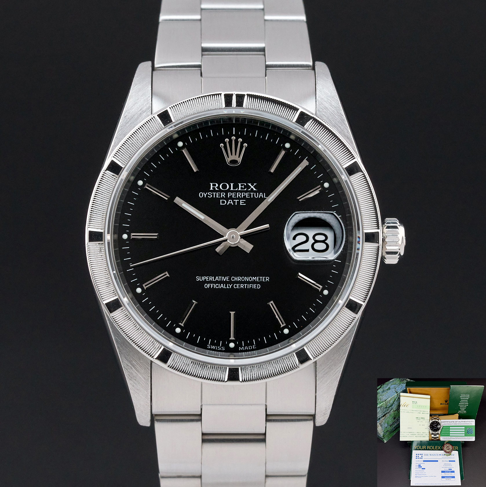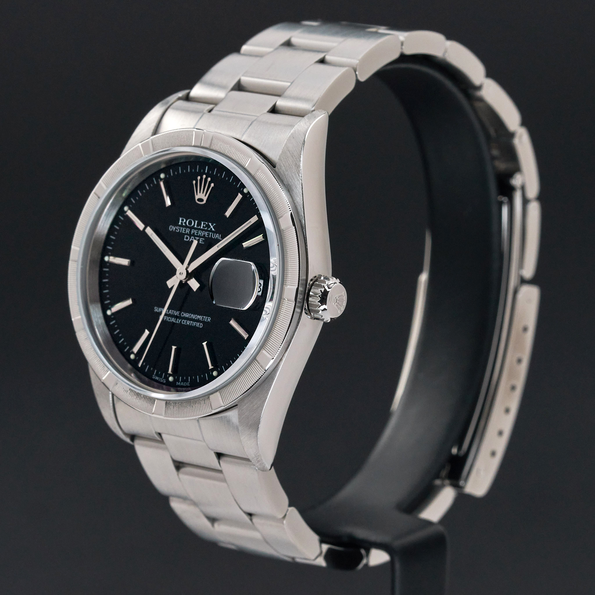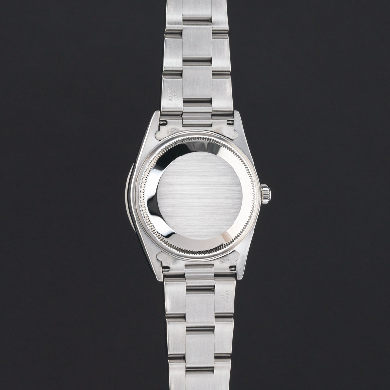 This Rolex Oyster Perpetual Date 15210 features a Black dial and is crafted from stainless steel, with a production year of 2001.