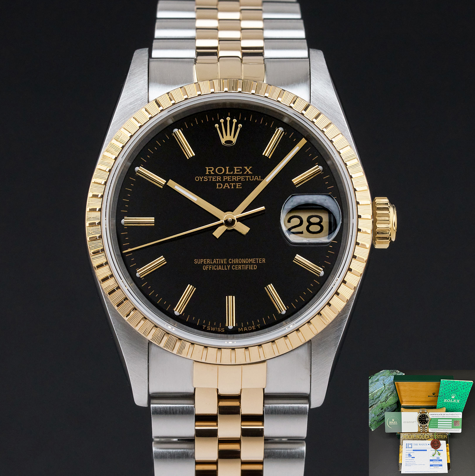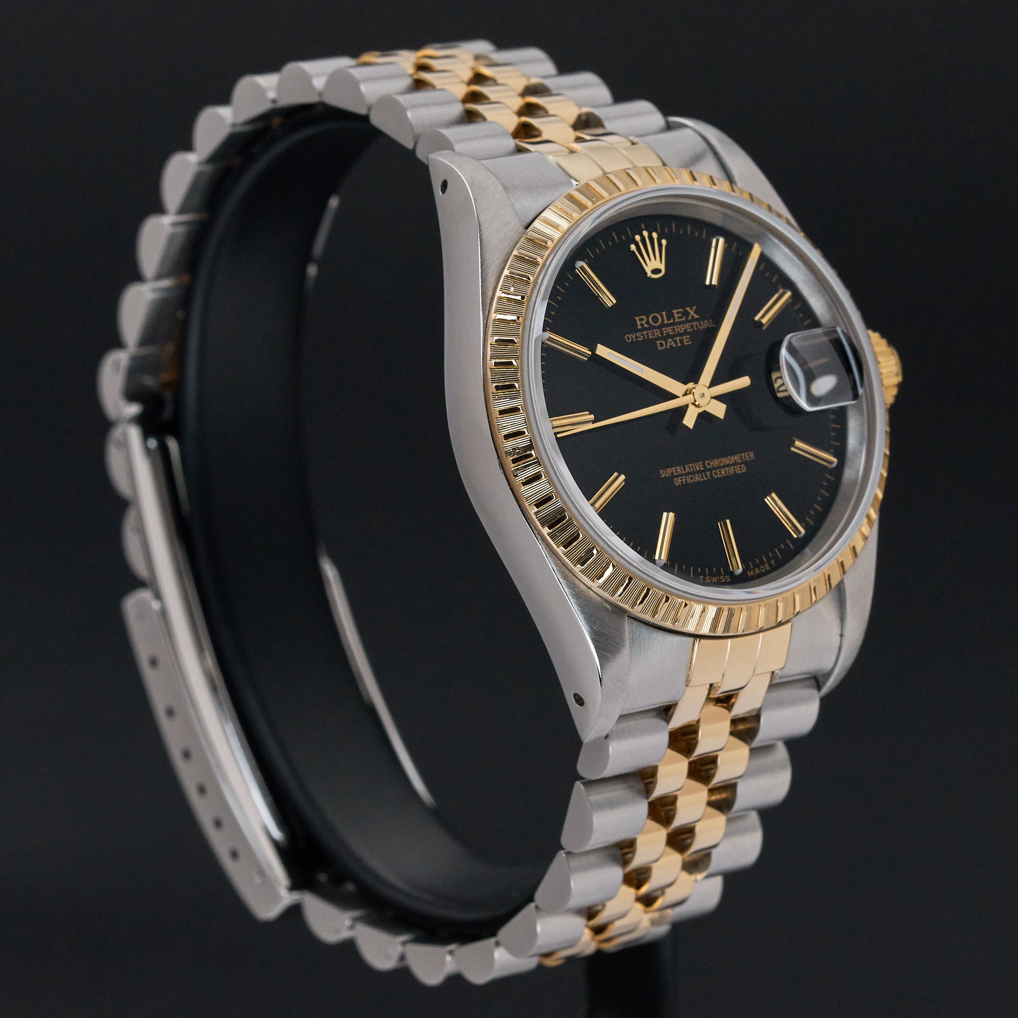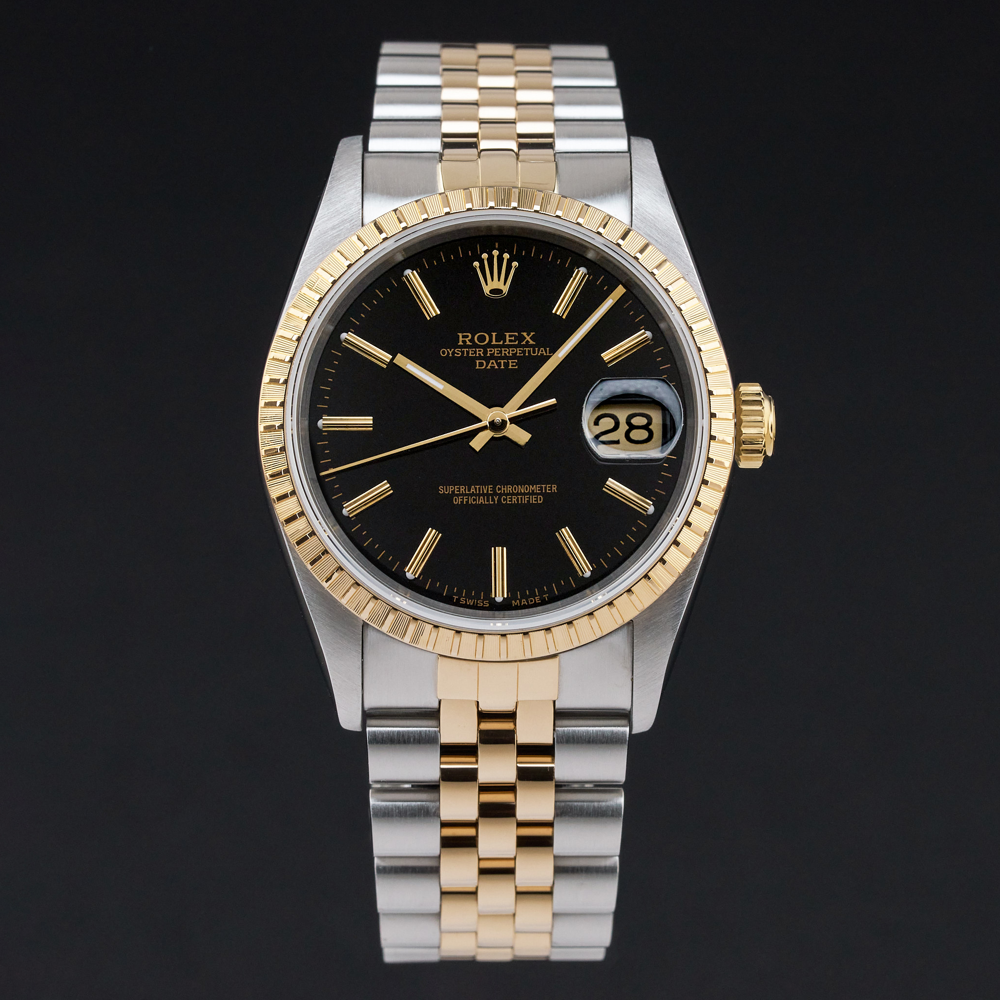 This Rolex Oyster Perpetual Date 15223 features a Black dial and is crafted from 18K yellow gold and stainless steel, with a production year of 1990.
