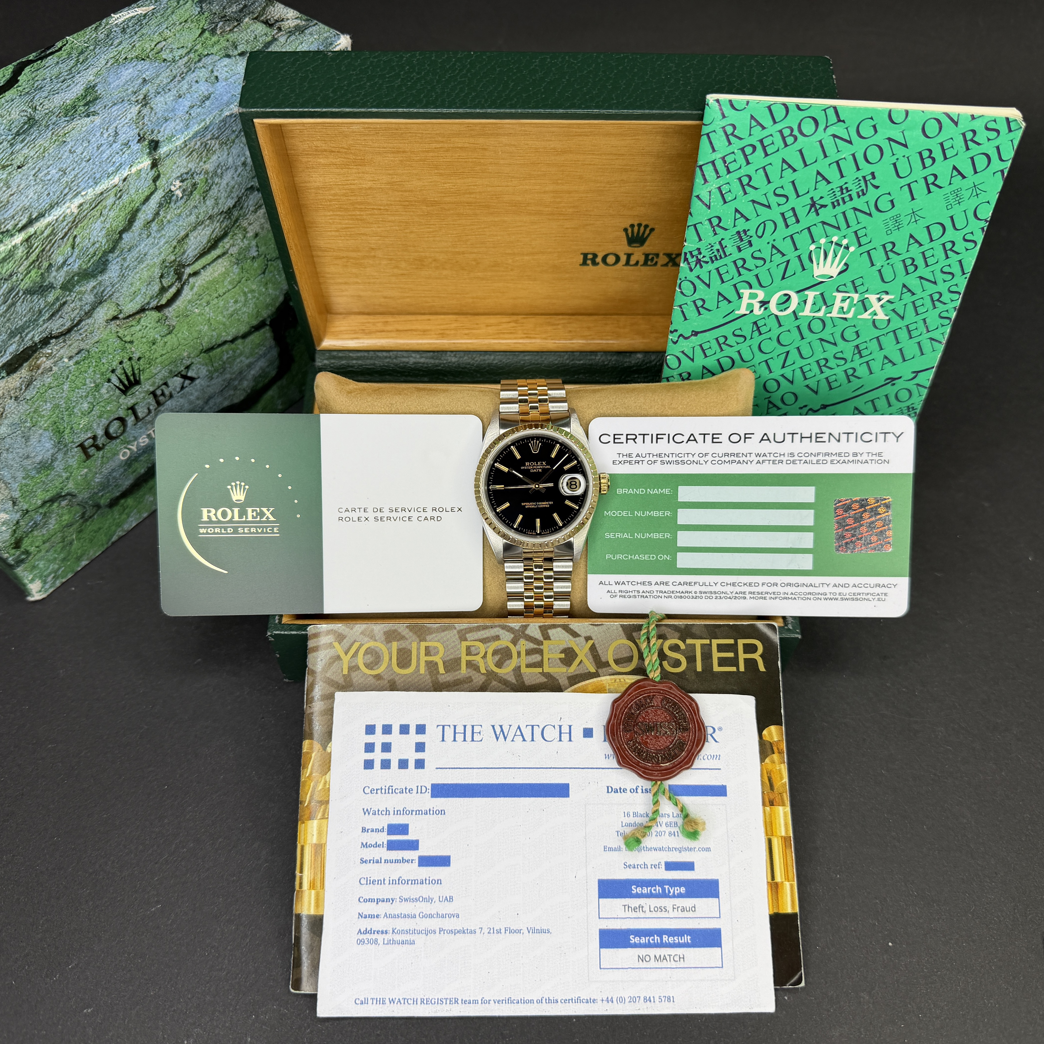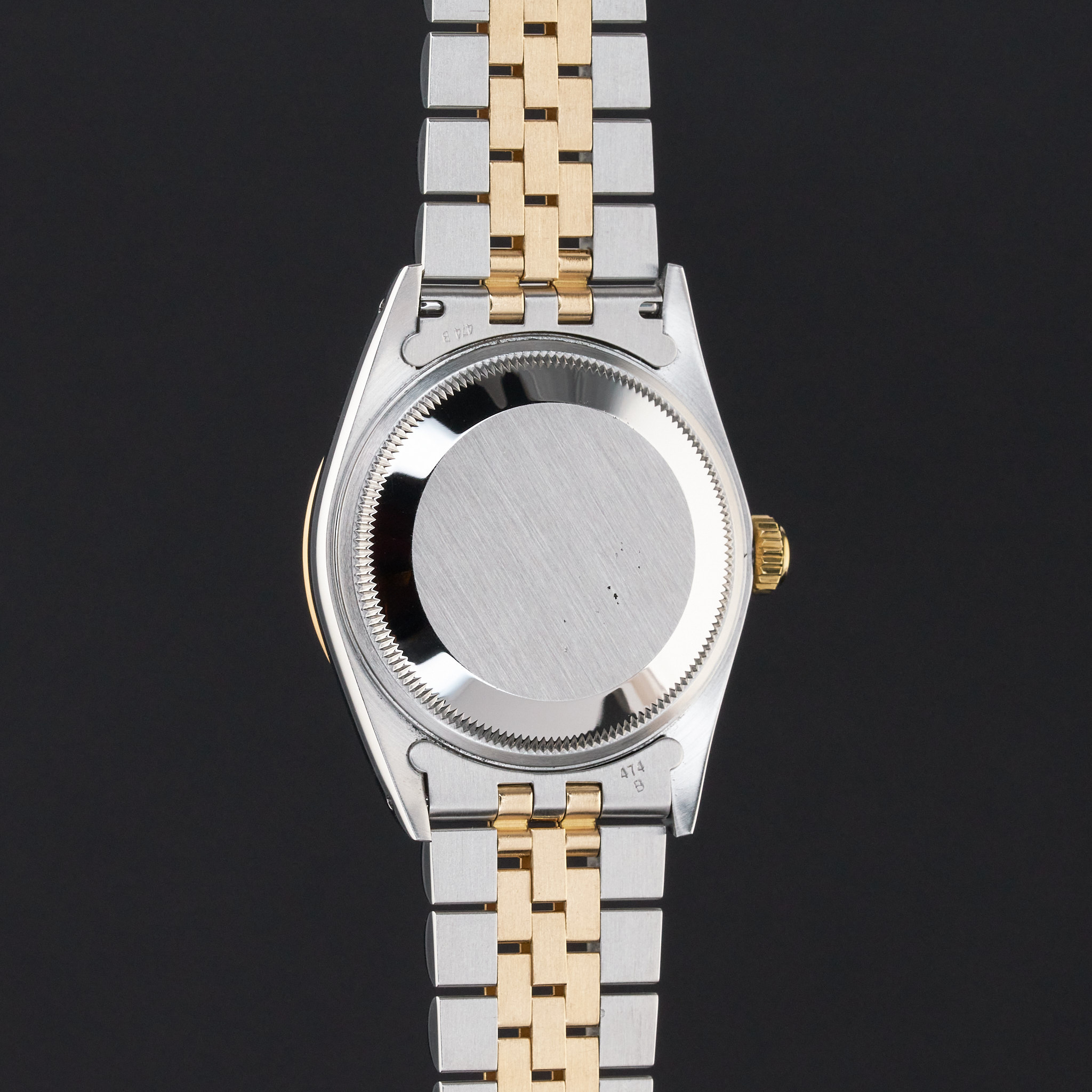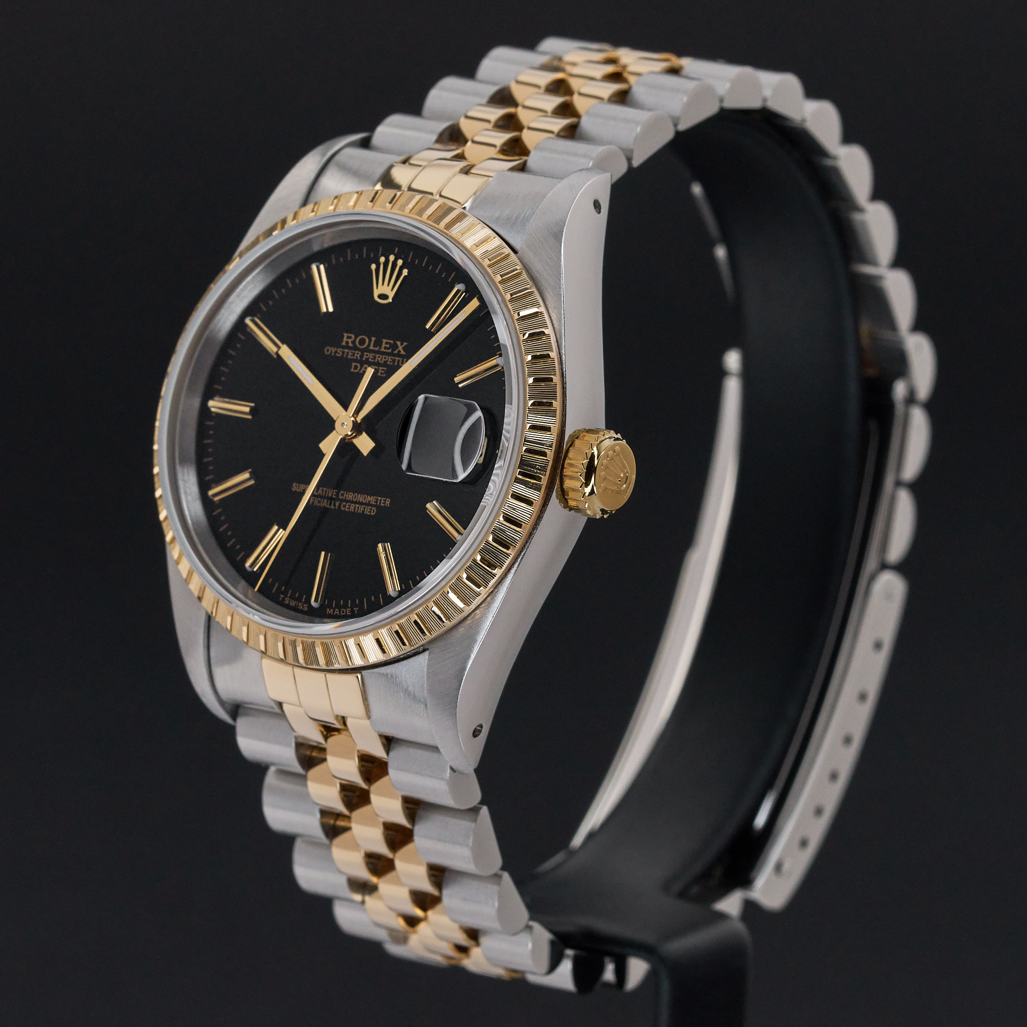 This Rolex Oyster Perpetual Date 15223 features a Black dial and is crafted from 18K yellow gold and stainless steel, with a production year of 1990.