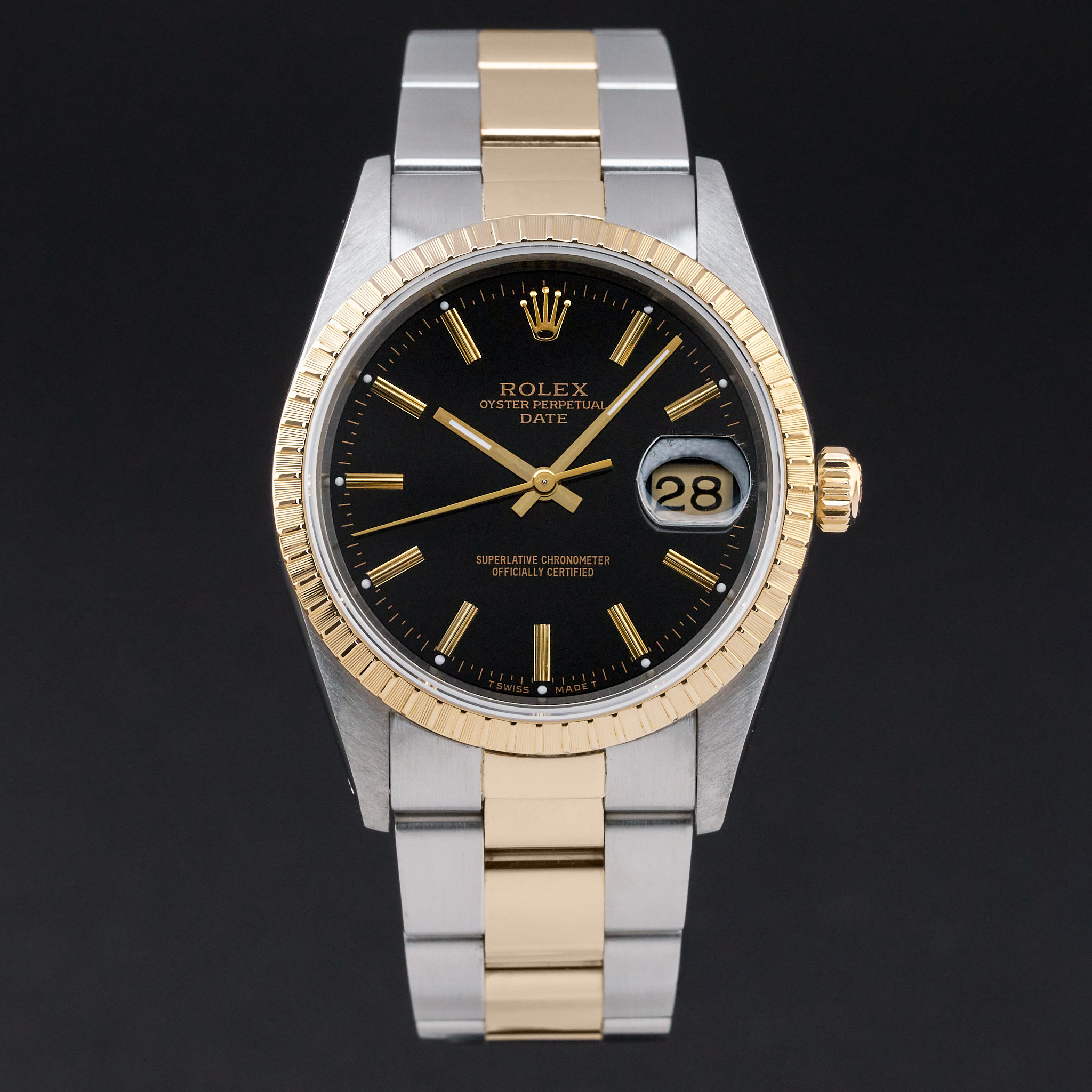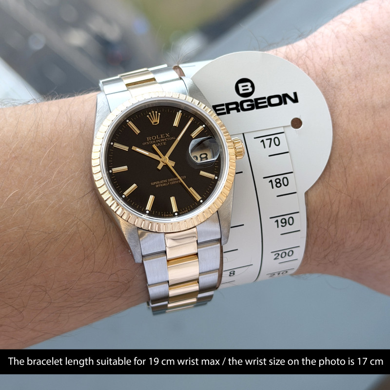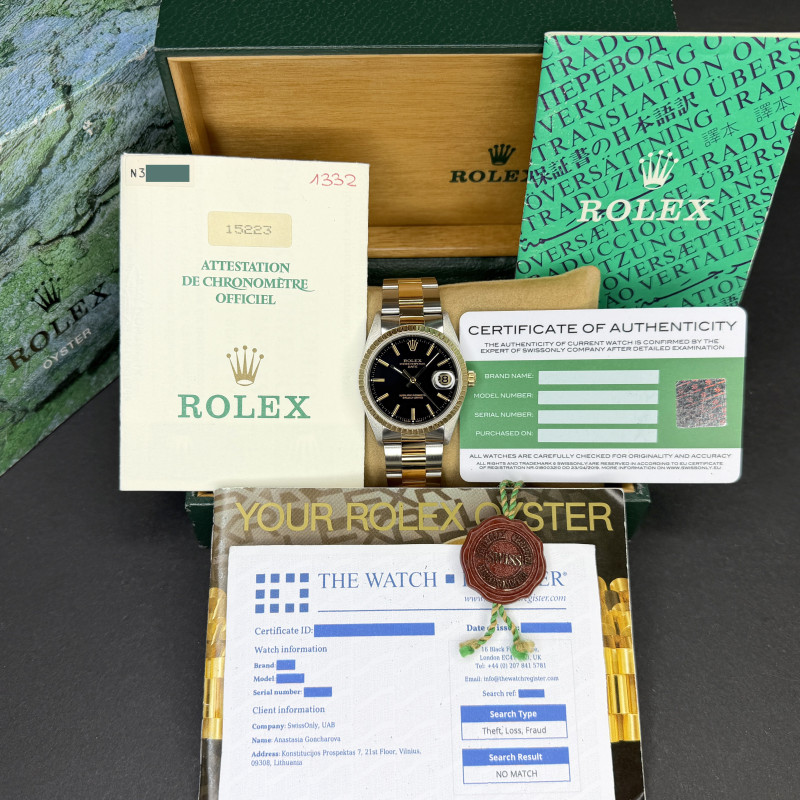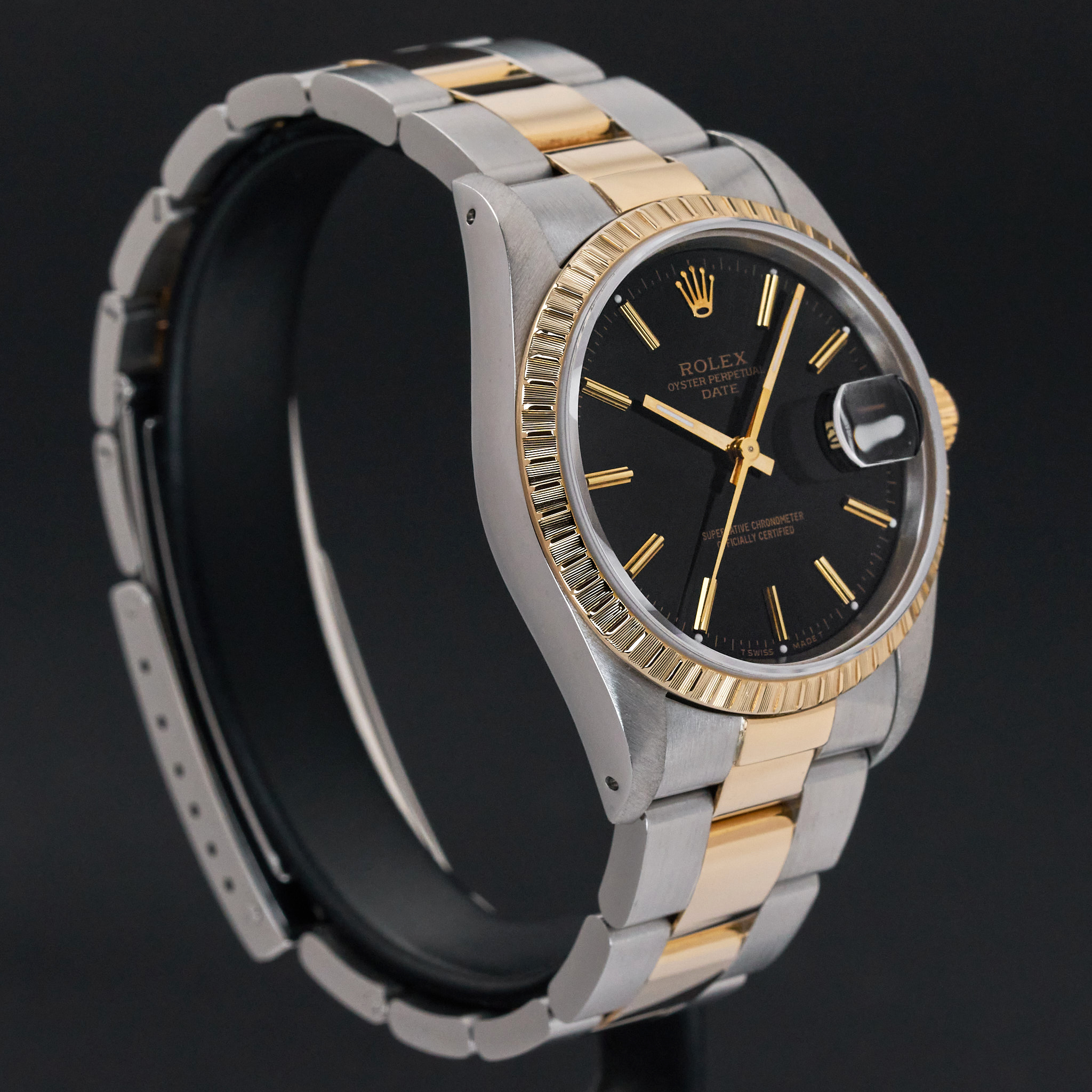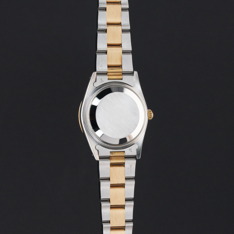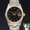 This Rolex Oyster Perpetual Date 15223 features a Black dial and is crafted from 18K yellow gold and stainless steel, with a production year of 1991.