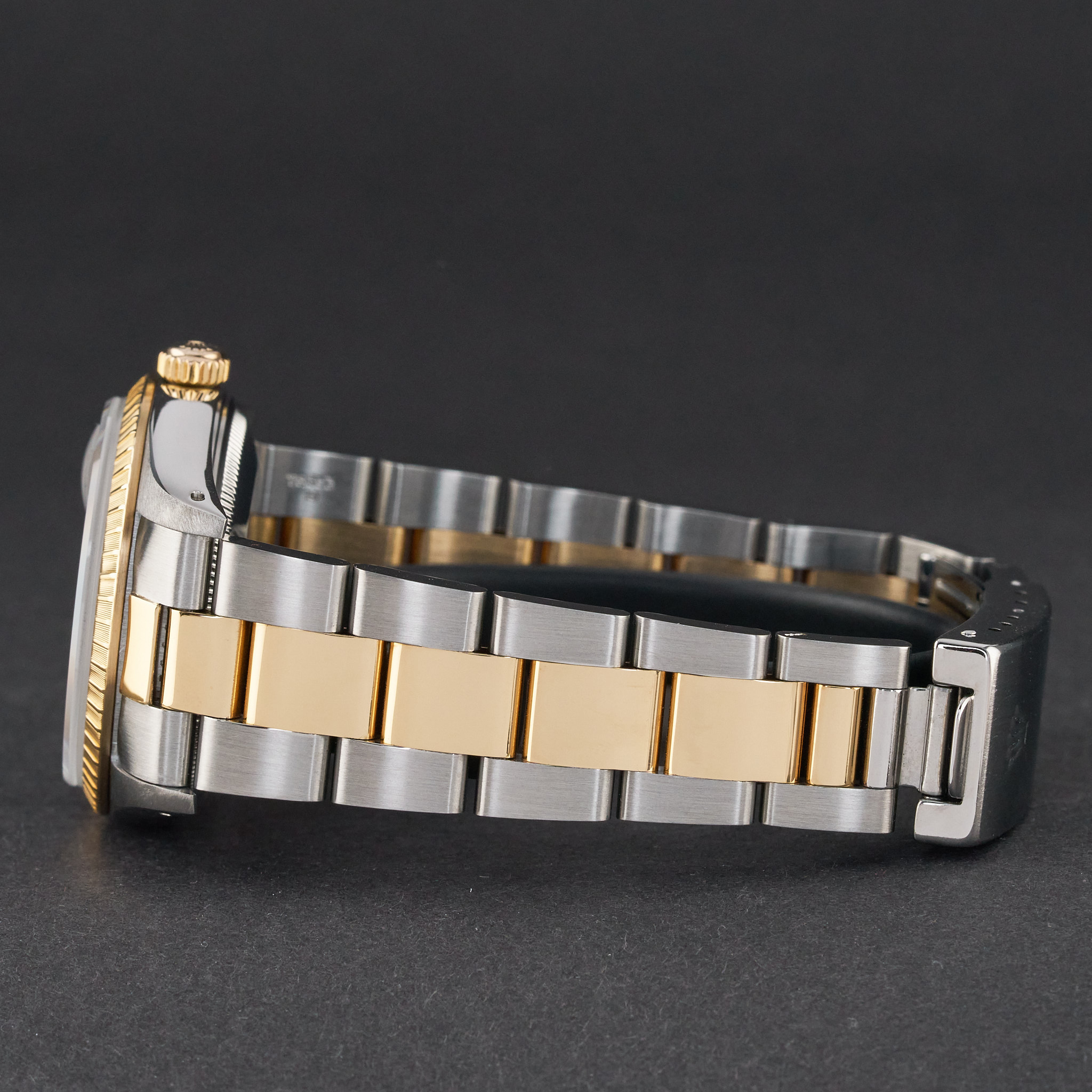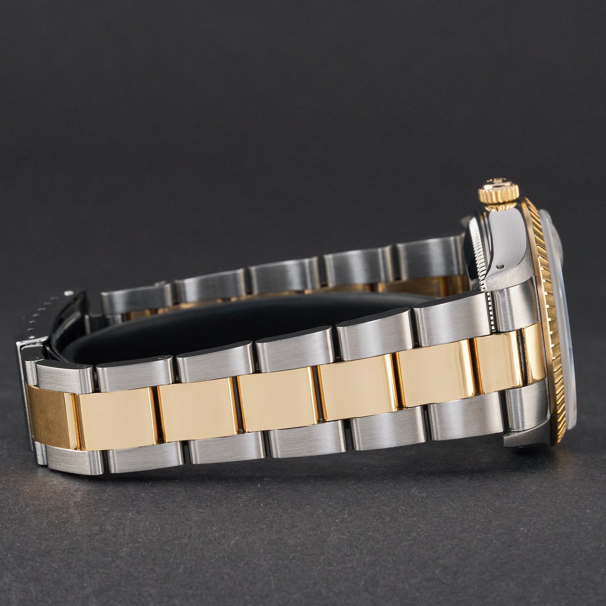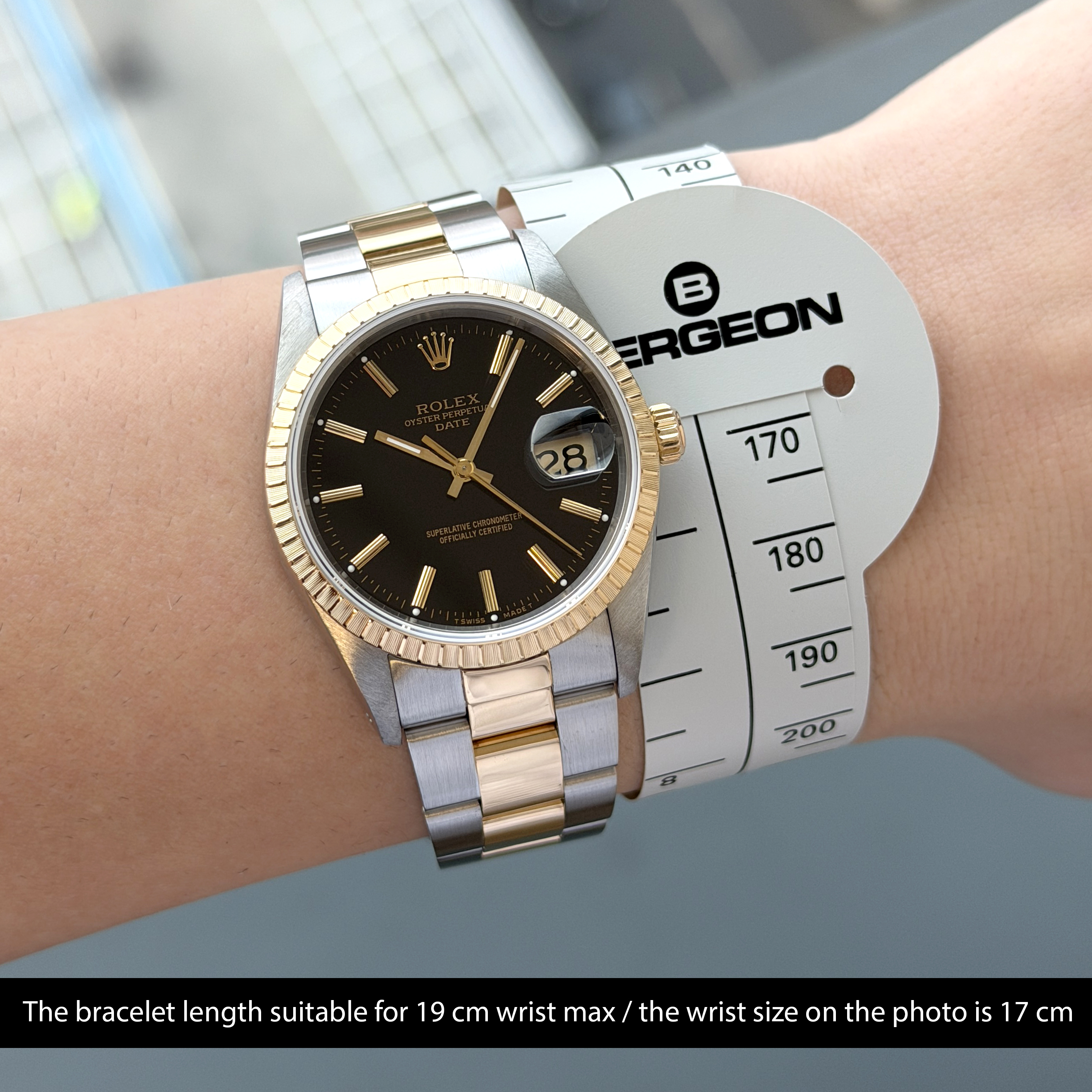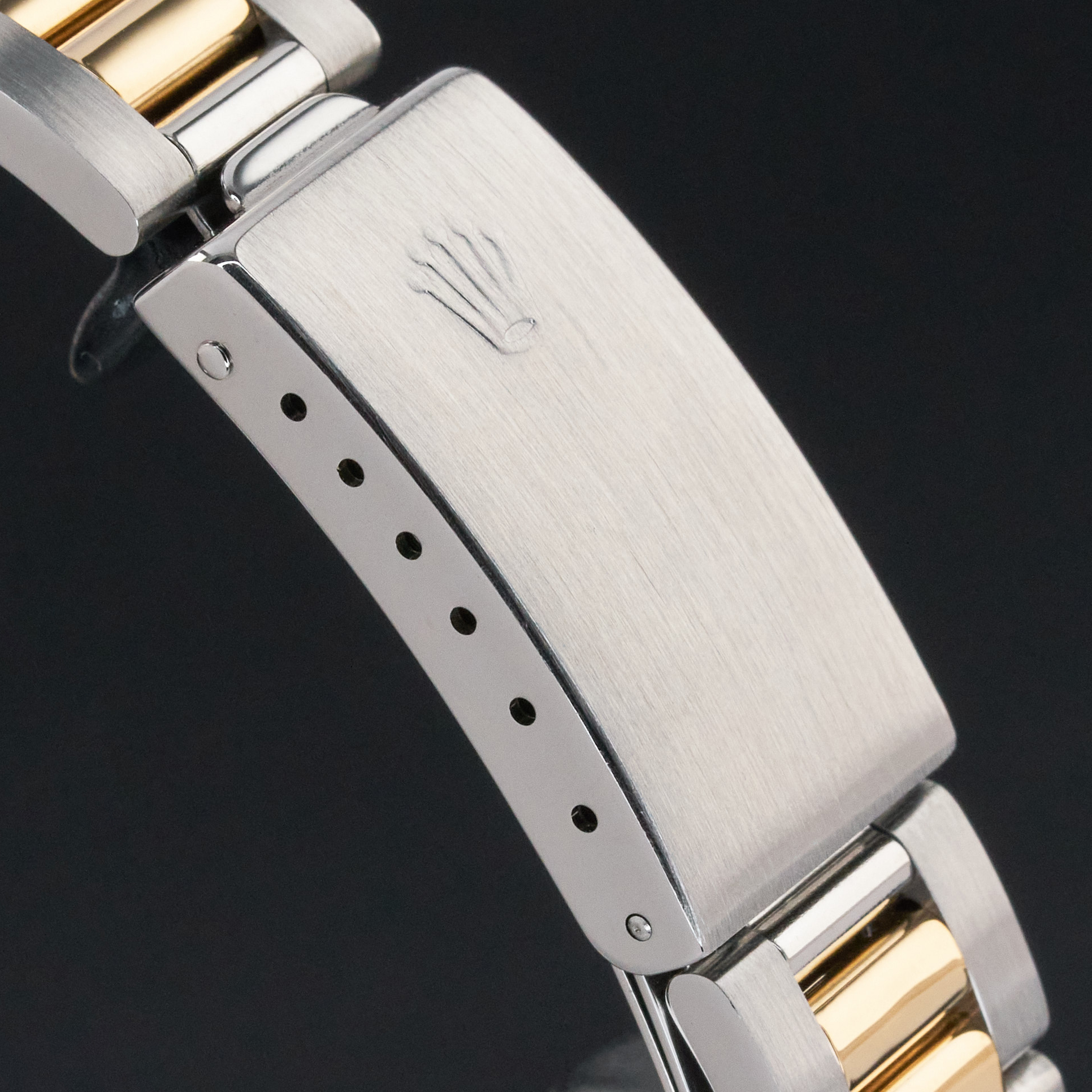 This Rolex Oyster Perpetual Date 15223 features a Black dial and is crafted from 18K yellow gold and stainless steel, with a production year of 1991.
