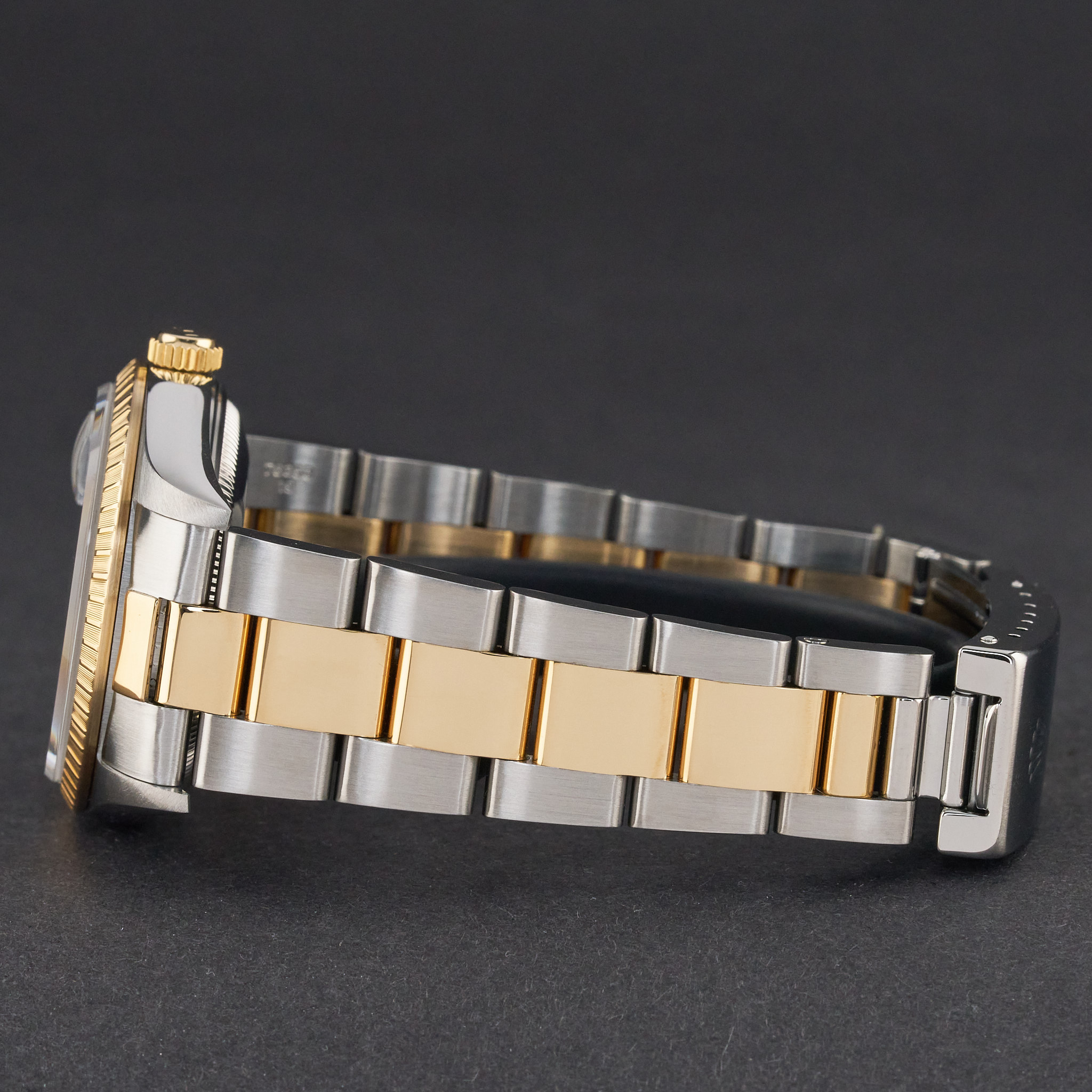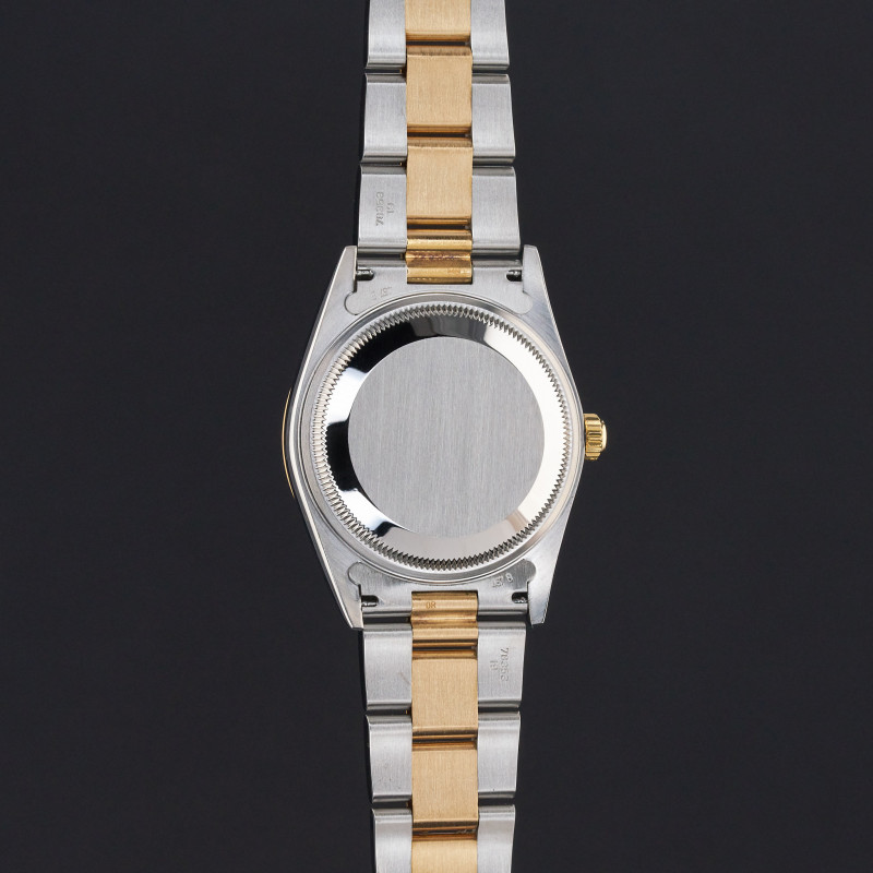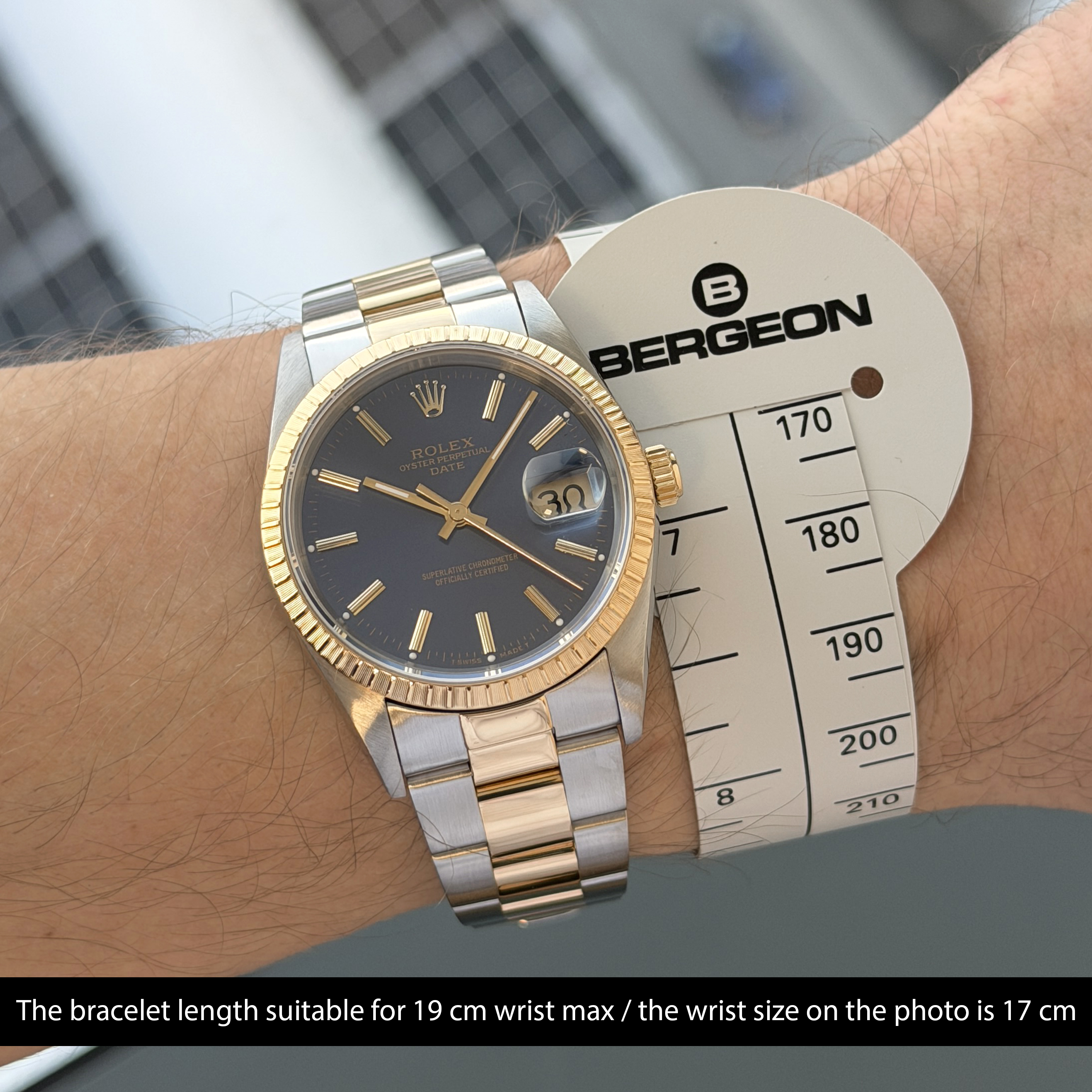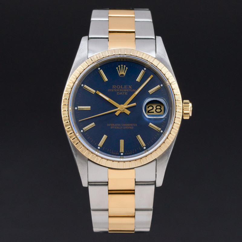 This Rolex Oyster Perpetual Date 15223 features a Blue dial and is crafted from 18K yellow gold and stainless steel, with a production year of 1993.