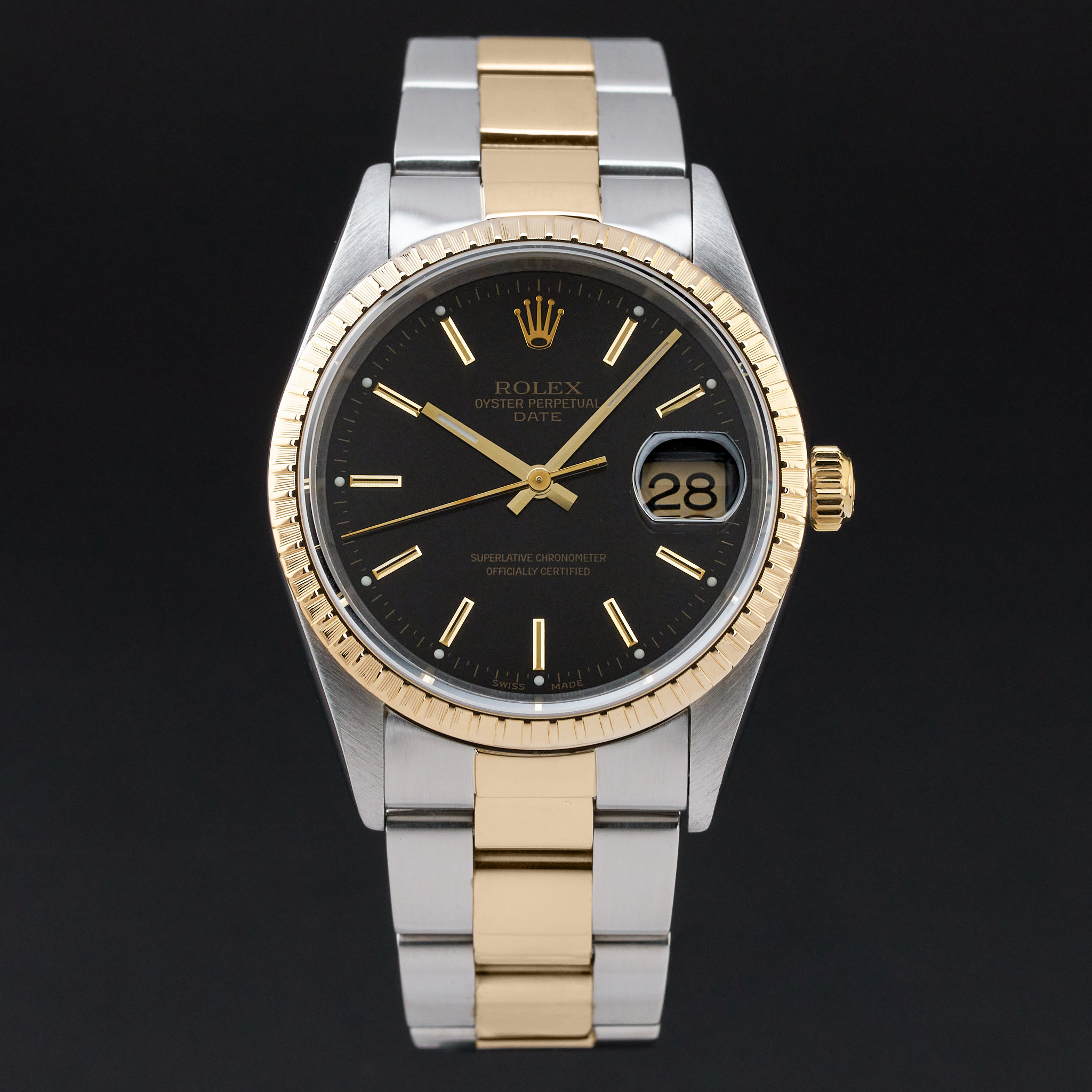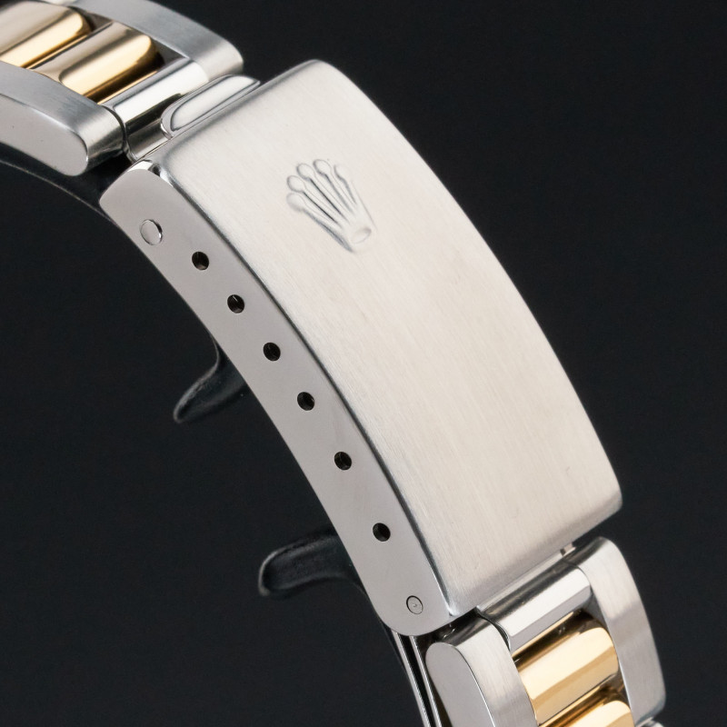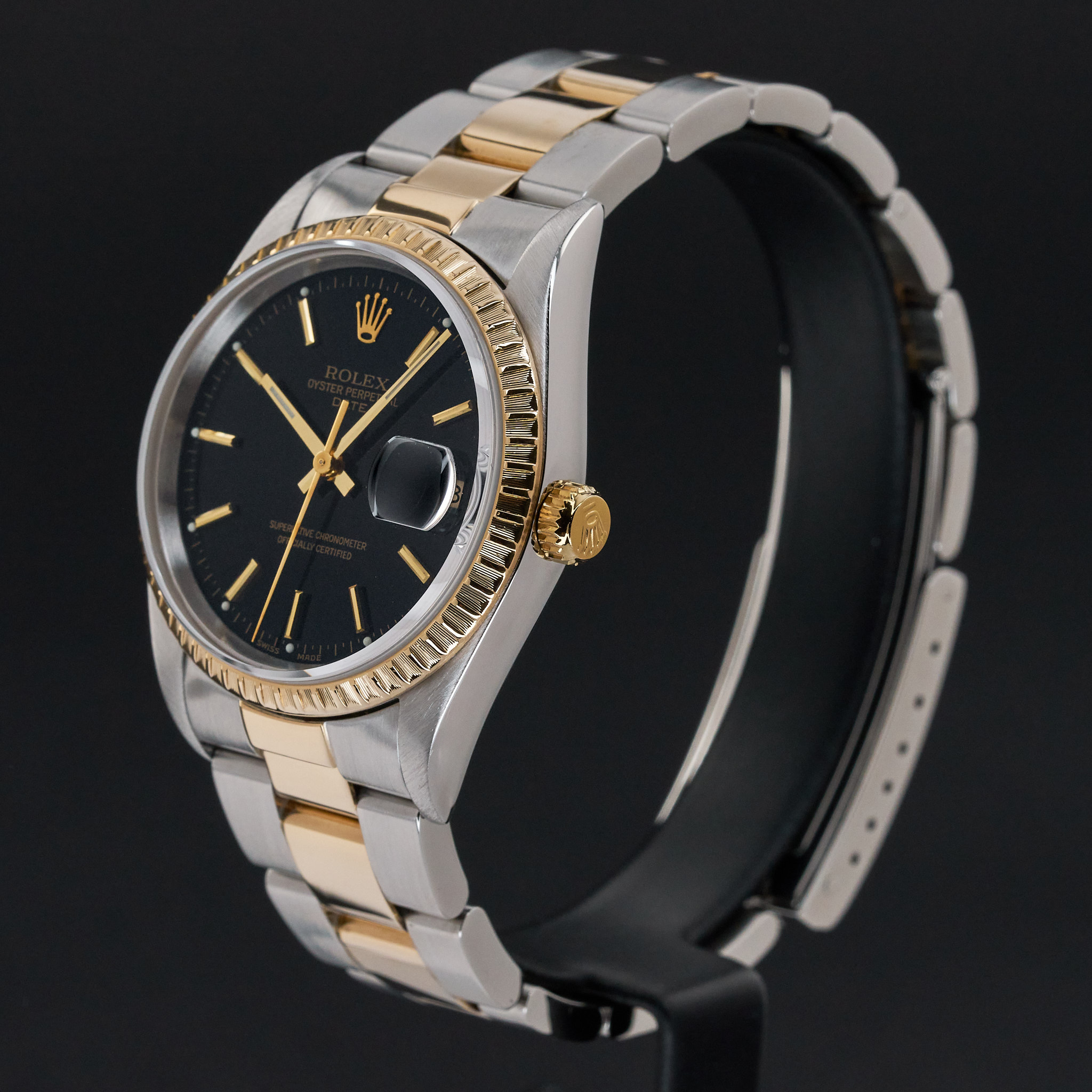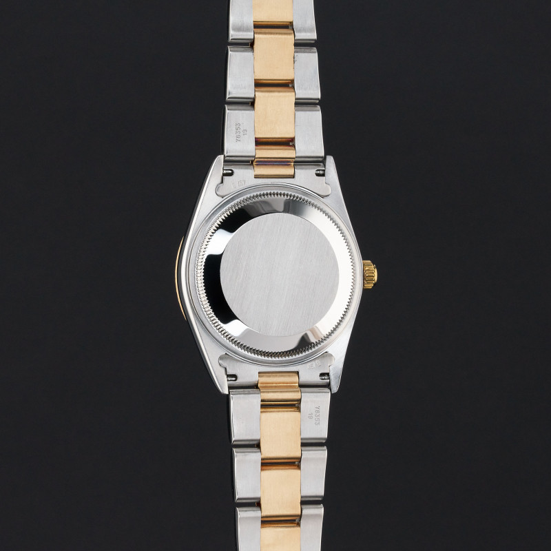 This Rolex Oyster Perpetual Date 15223 features a Black dial and is crafted from 18K yellow gold and stainless steel, with a production year of 2000.