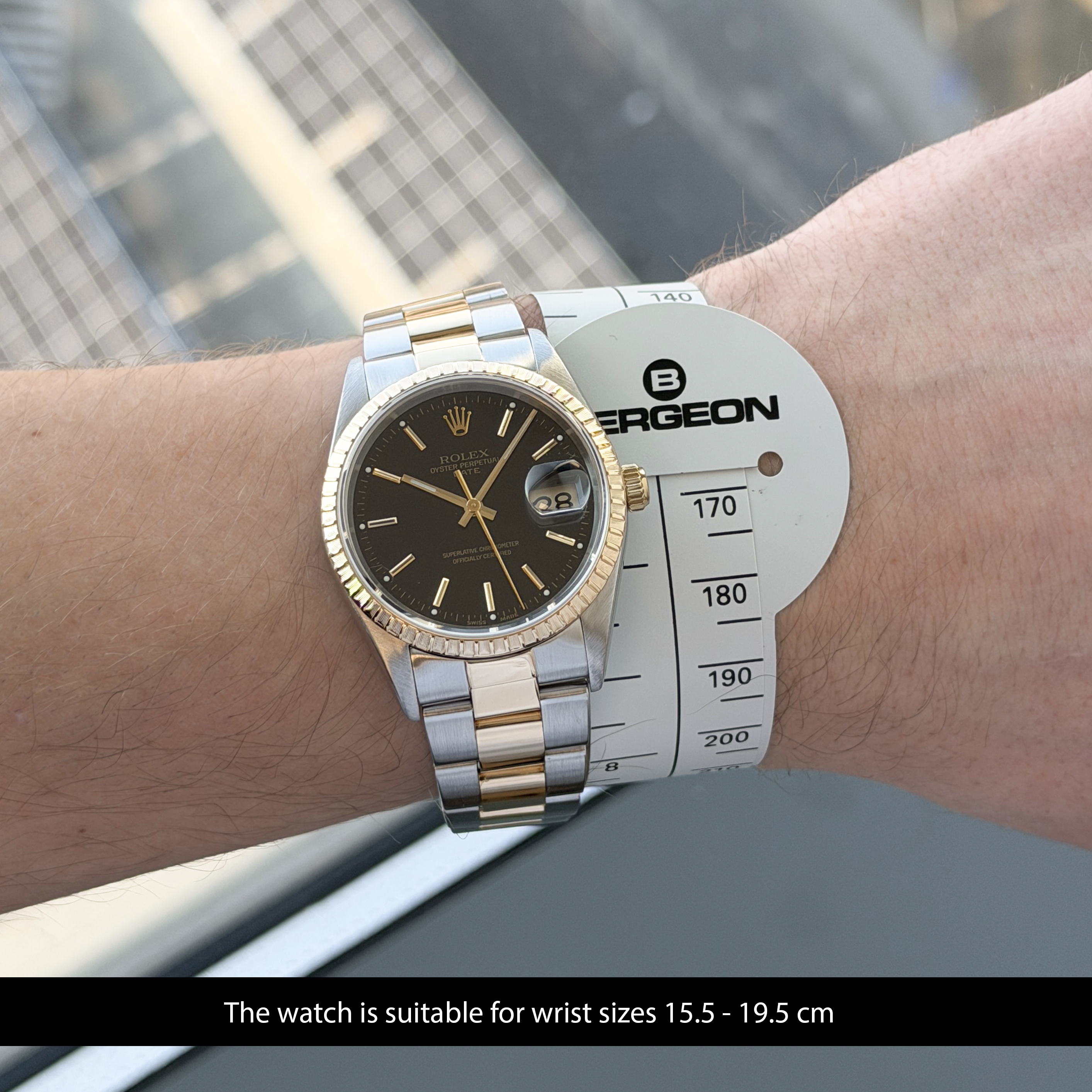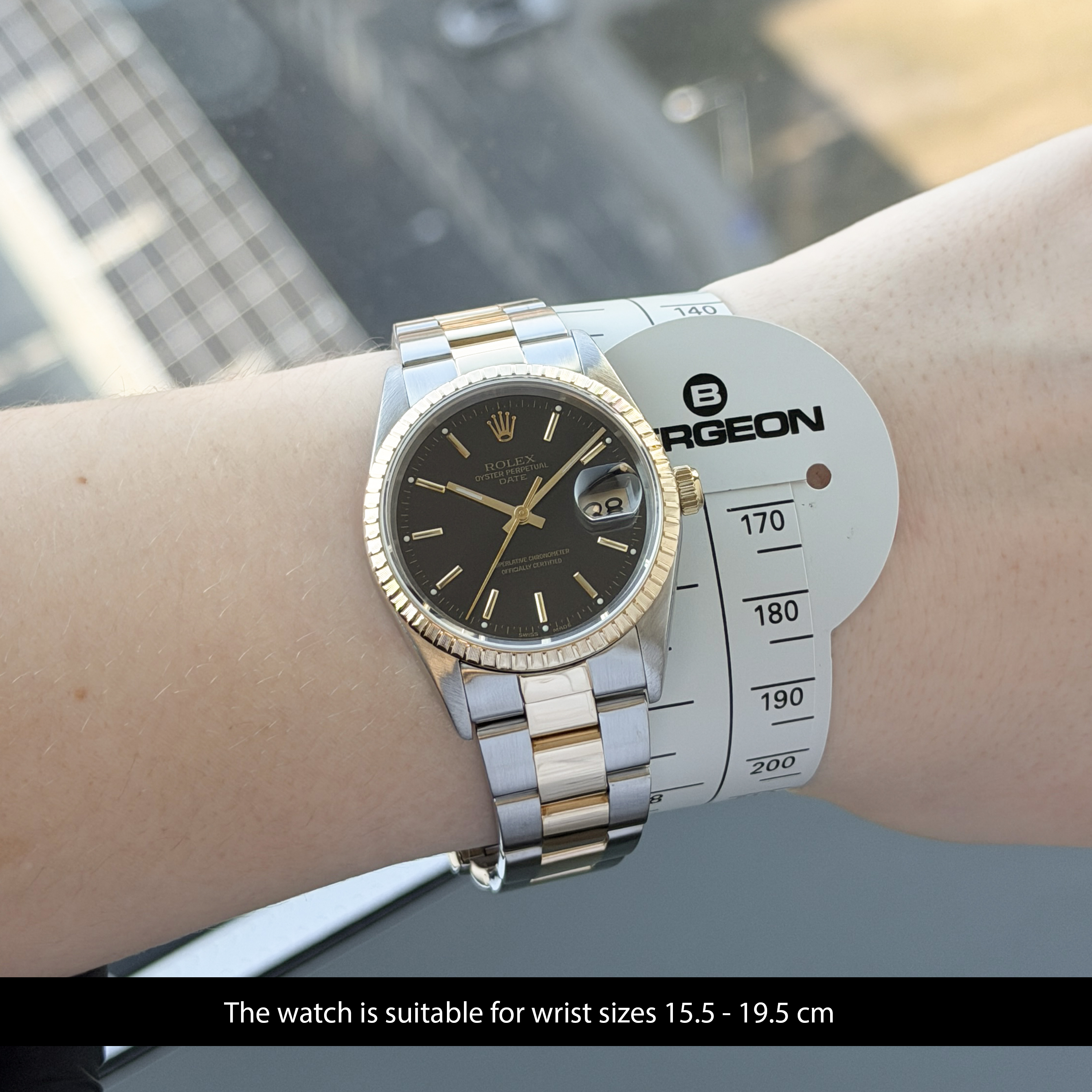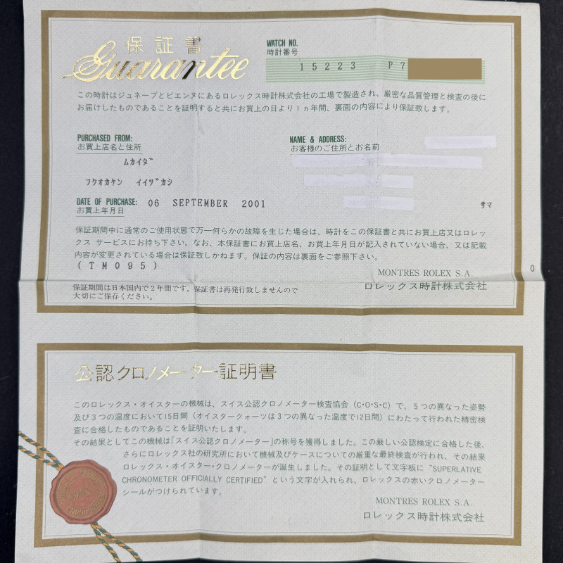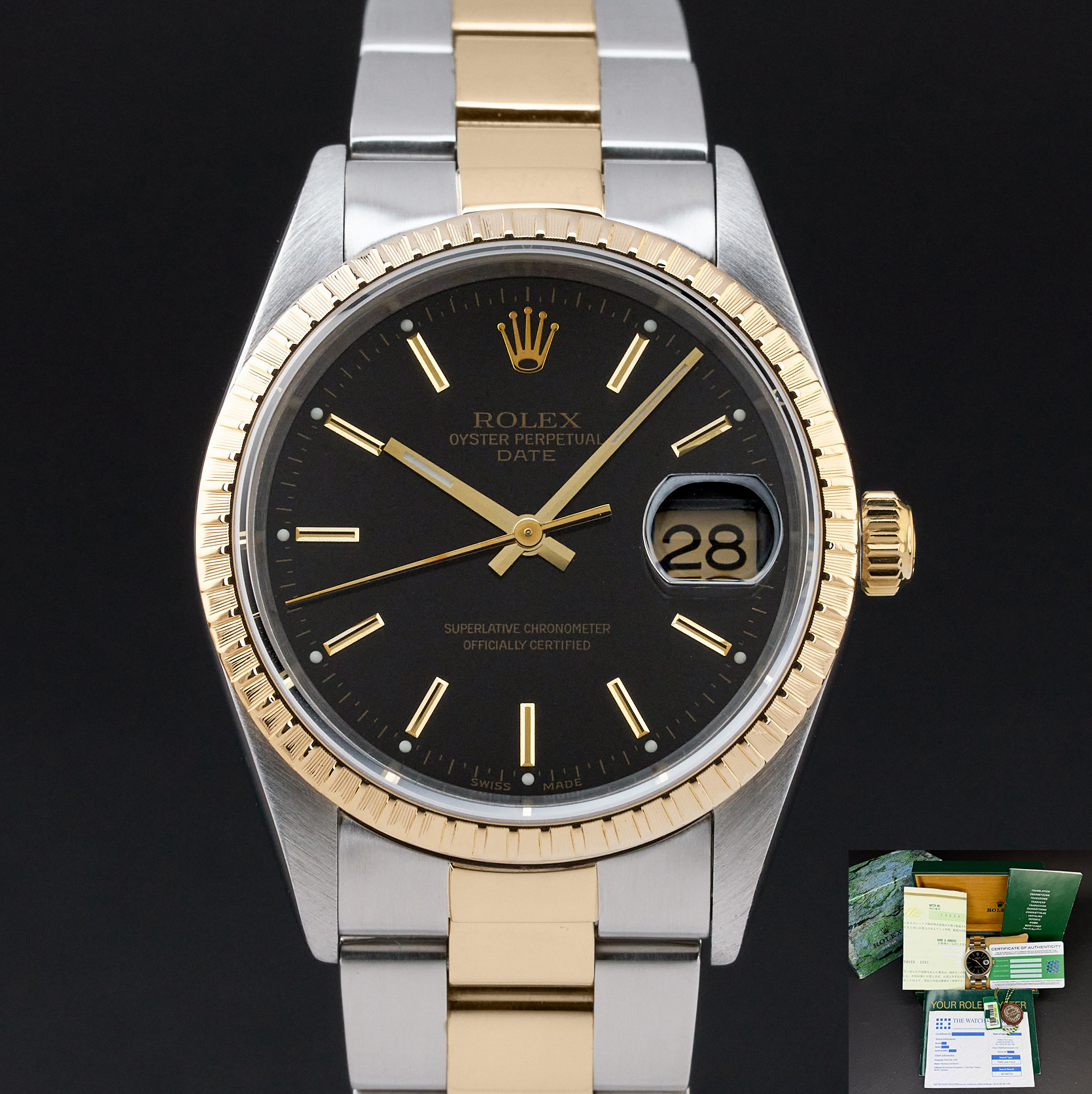 This Rolex Oyster Perpetual Date 15223 features a Black dial and is crafted from 18K yellow gold and stainless steel, with a production year of 2000.