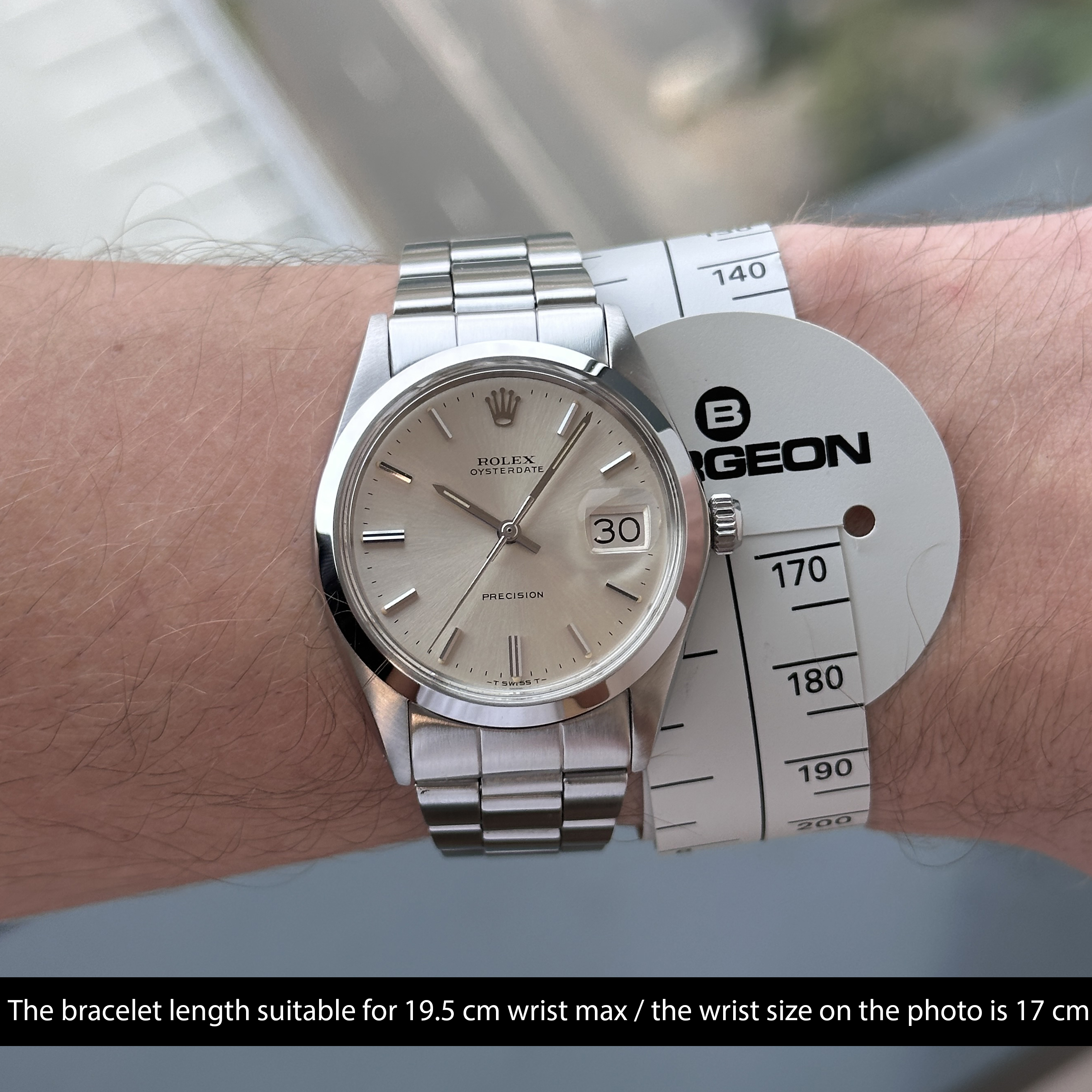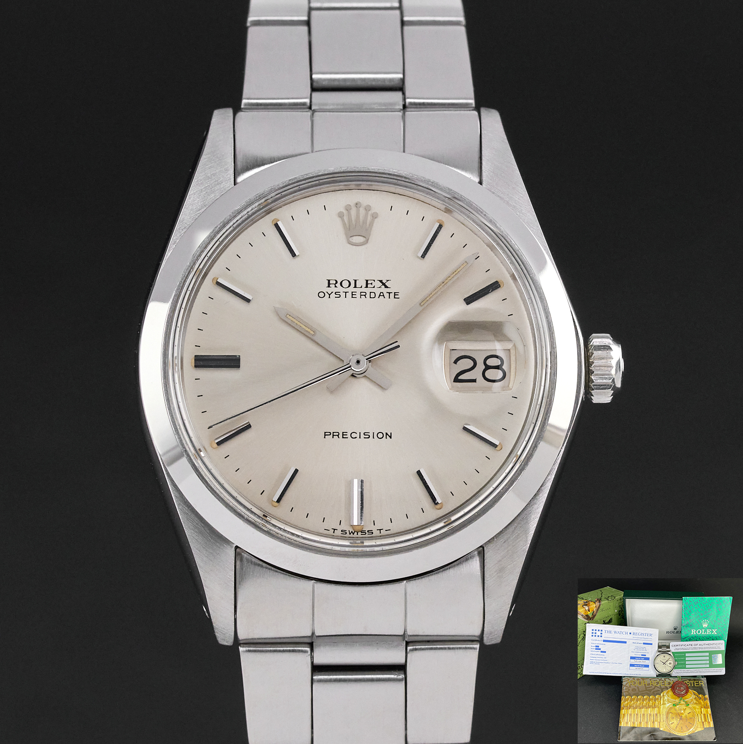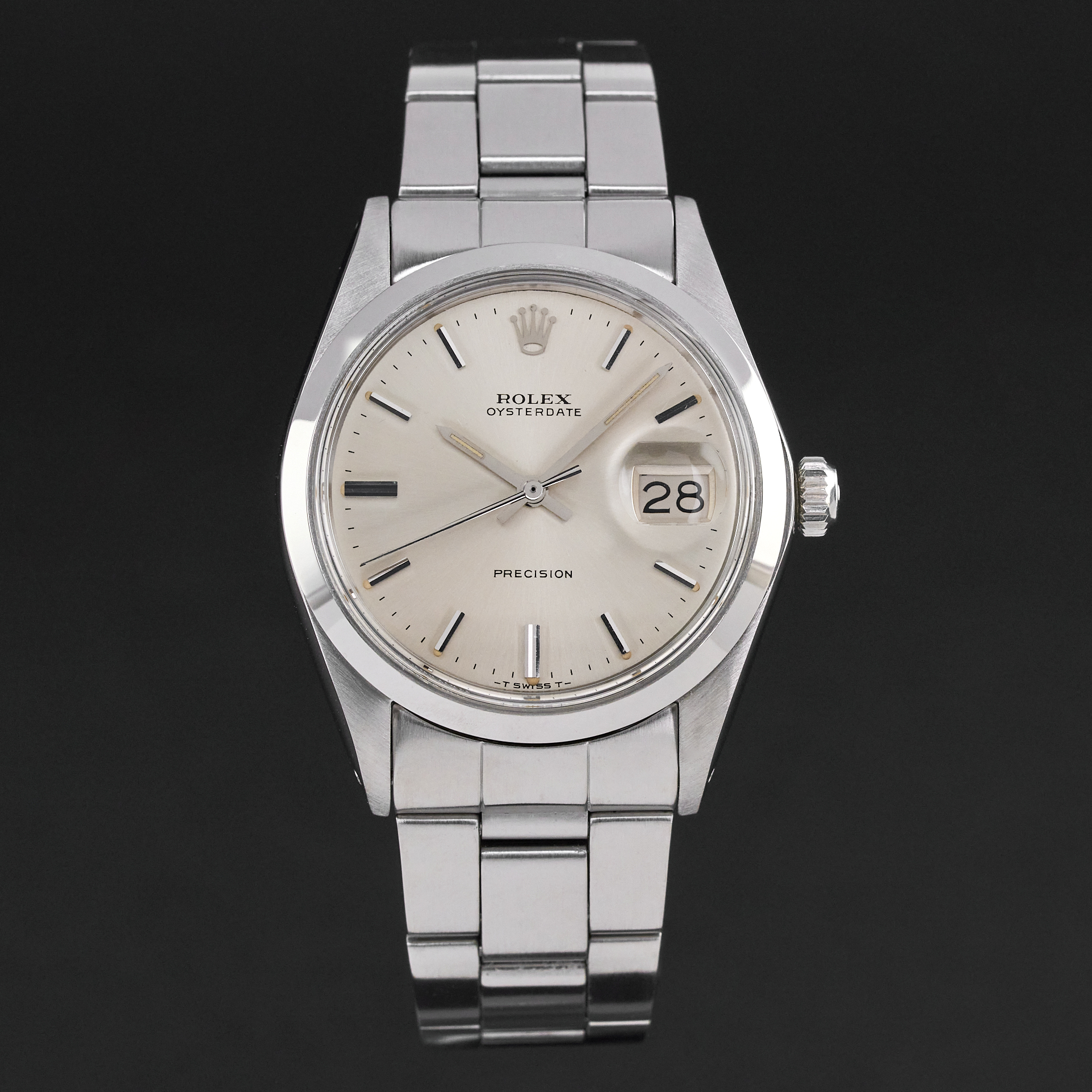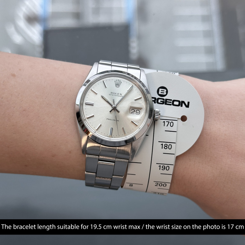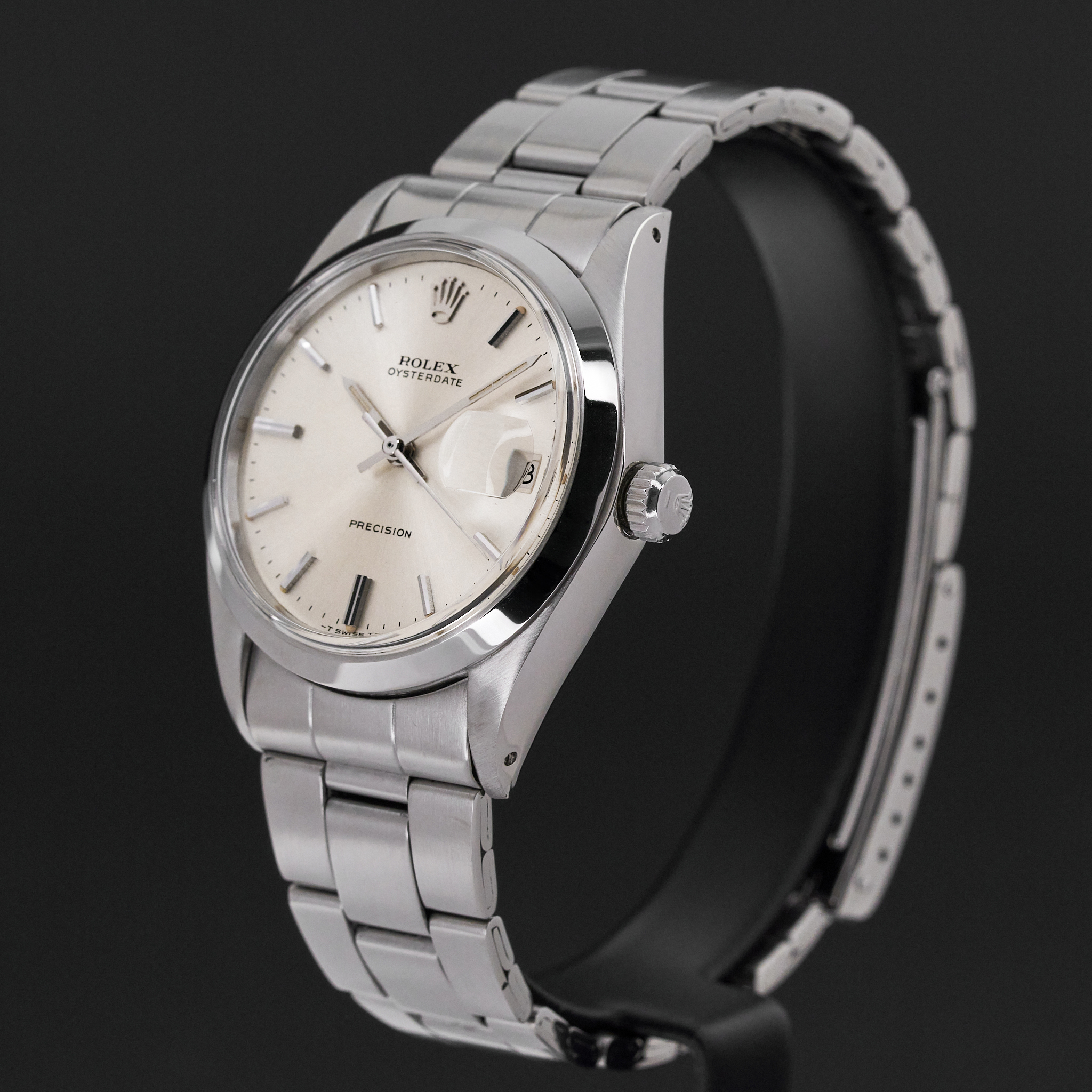 This Rolex Oysterdate Precision 6694 features a Silver dial and is crafted from stainless steel, with a production year of 1971.