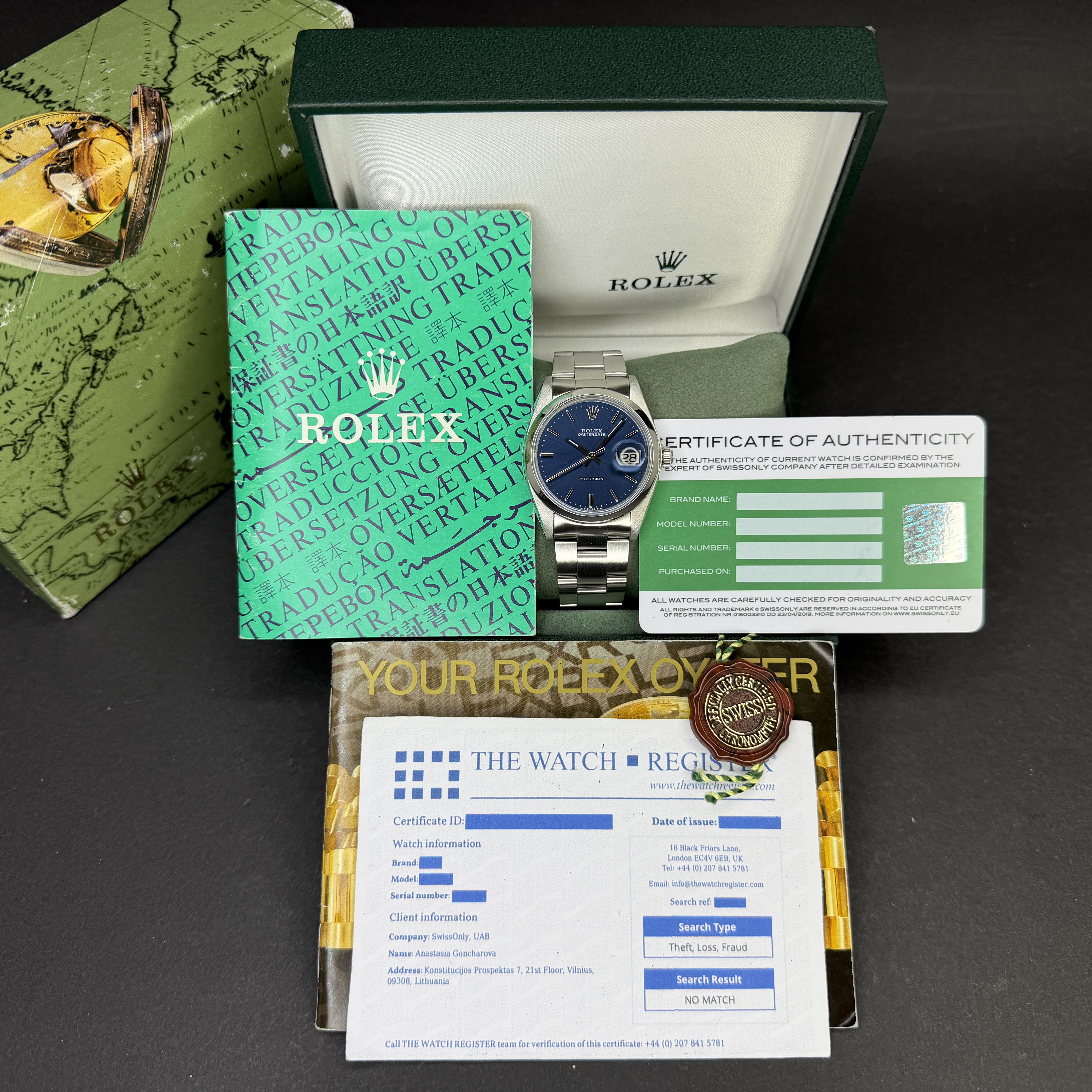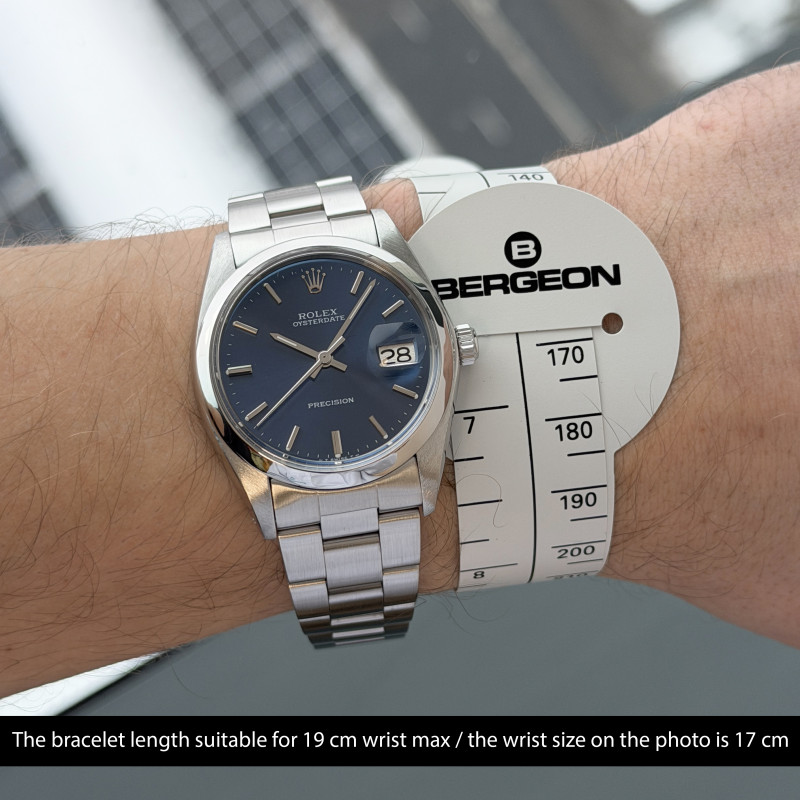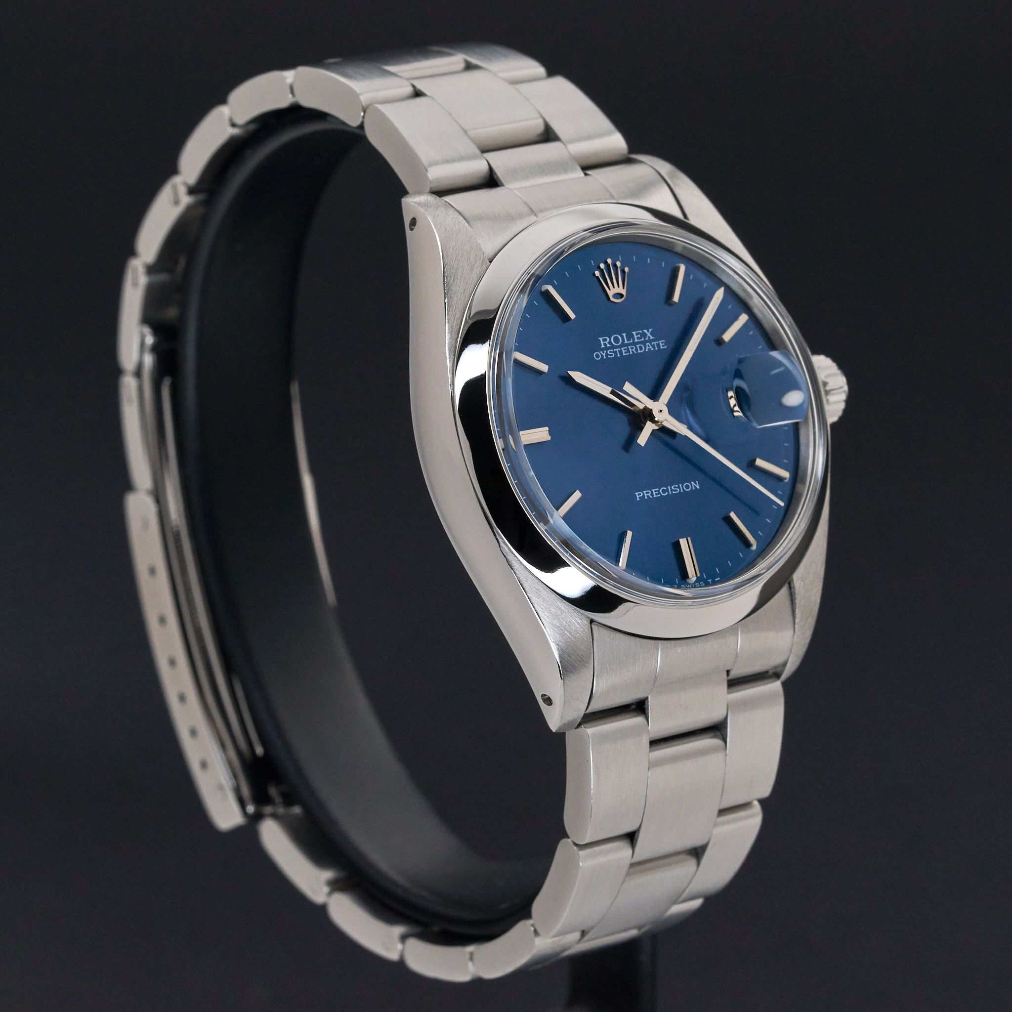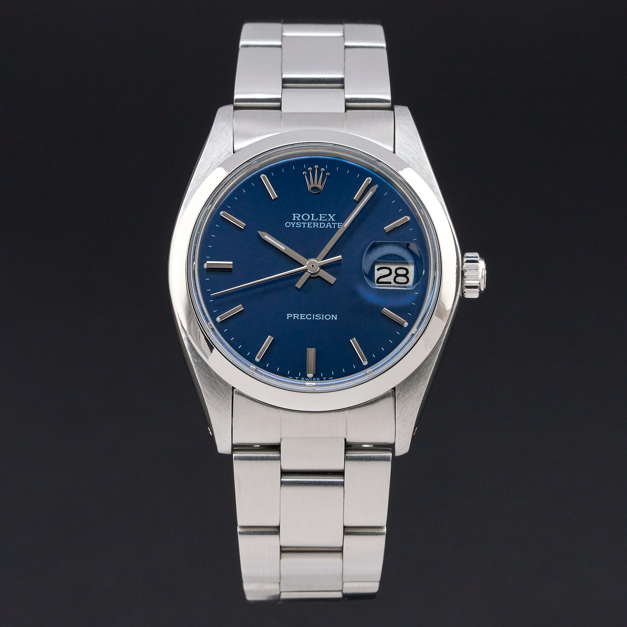 This Rolex Oysterdate Precision 6694 features a Blue dial and is crafted from stainless steel, with a production year of 1978.