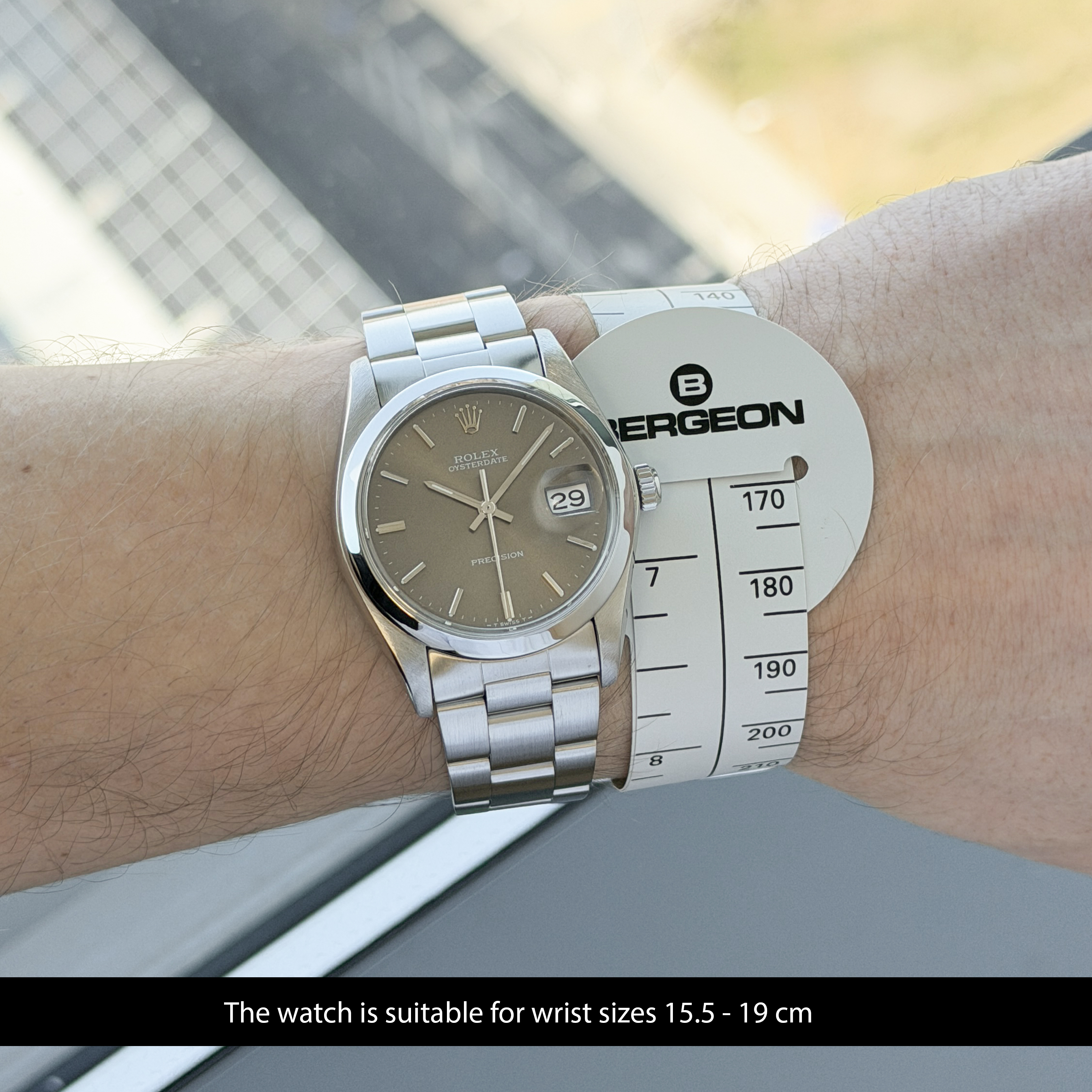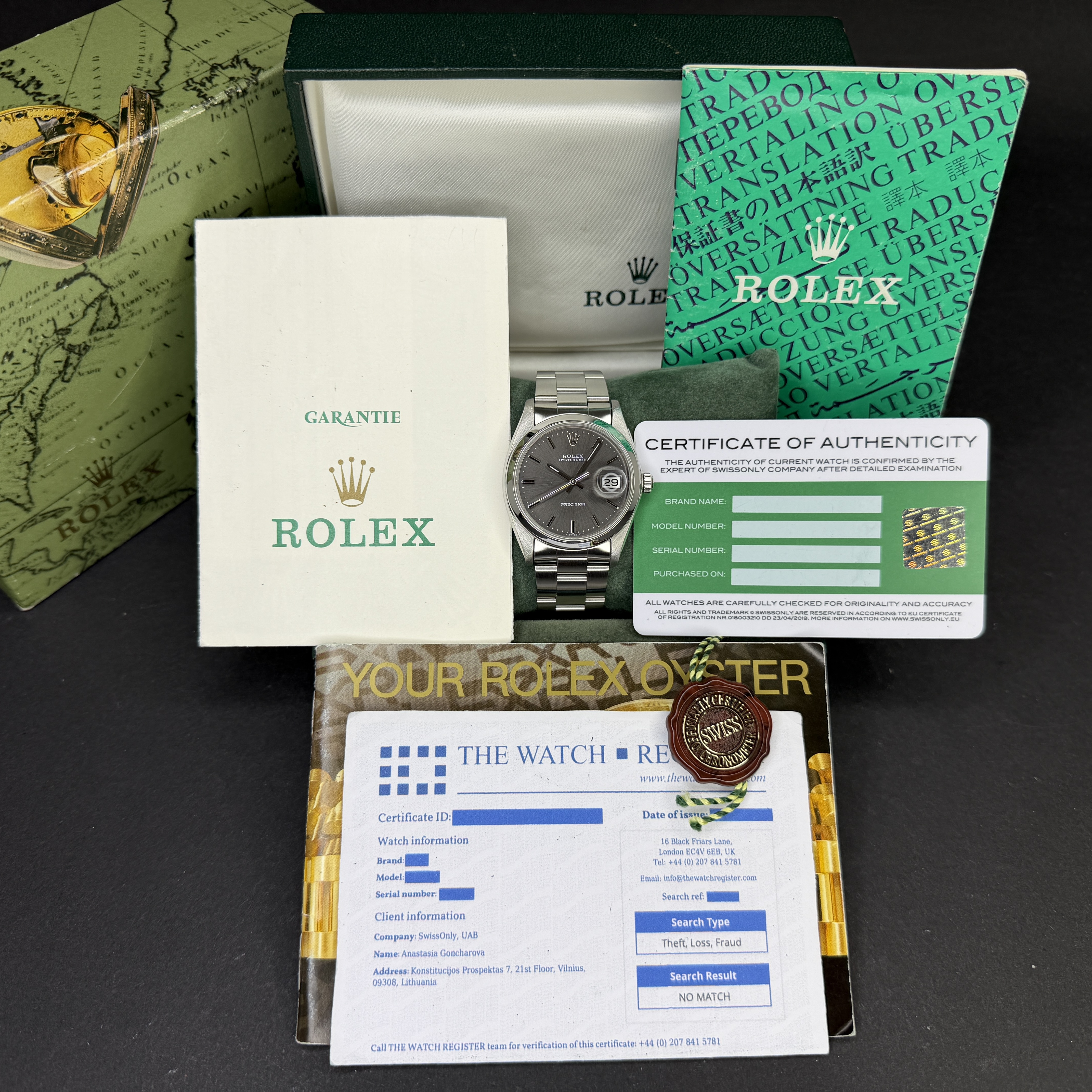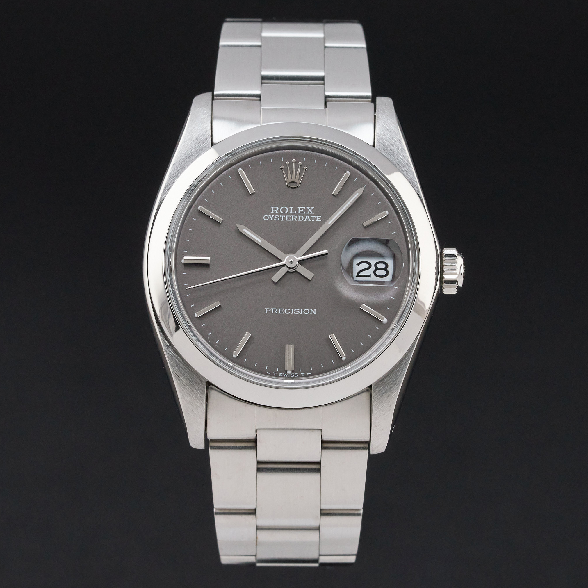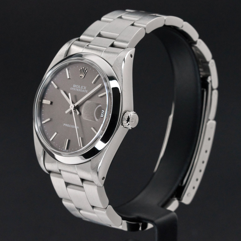 This Rolex Oysterdate Precision 6694 features a Grey dial and is crafted from stainless steel, with a production year of 1986.