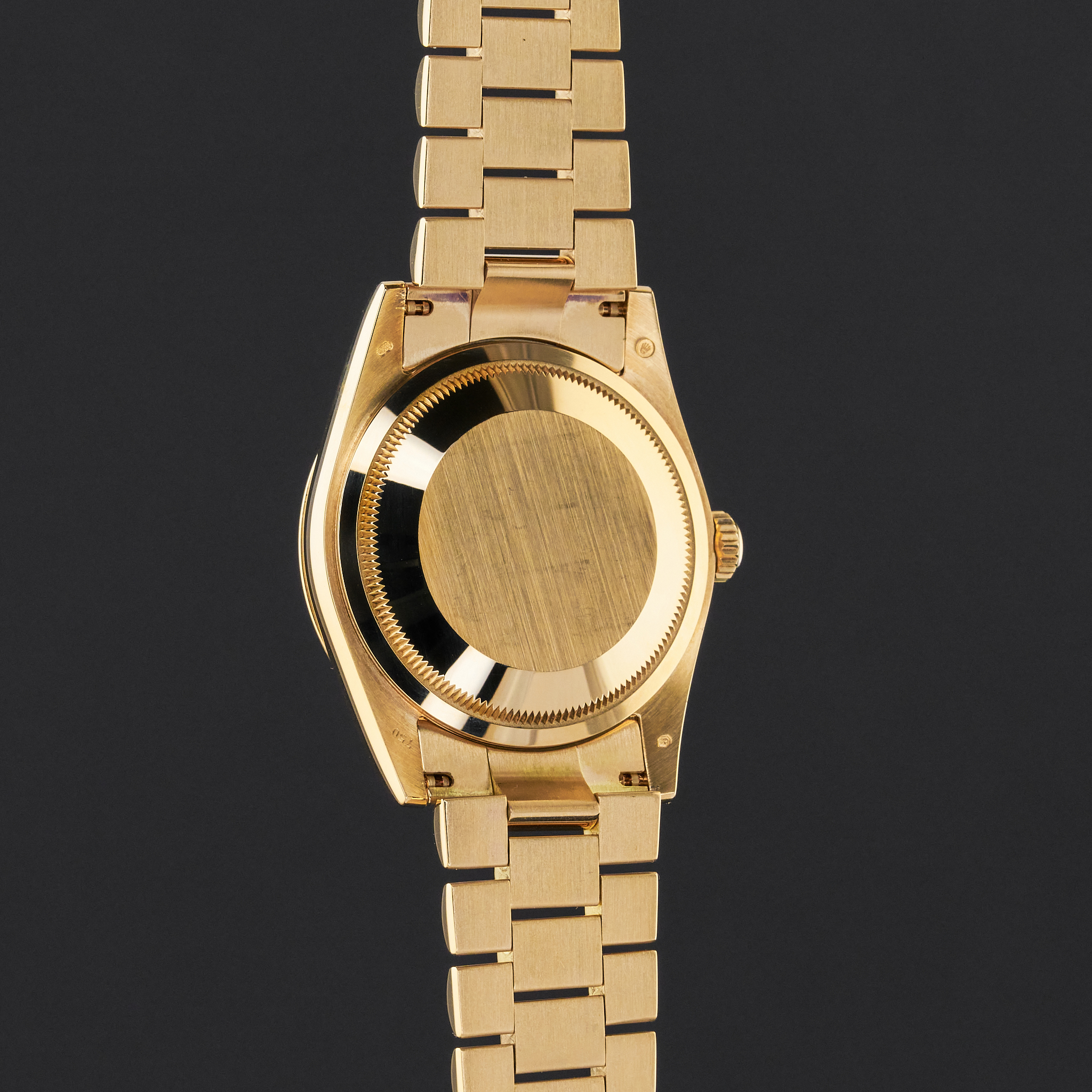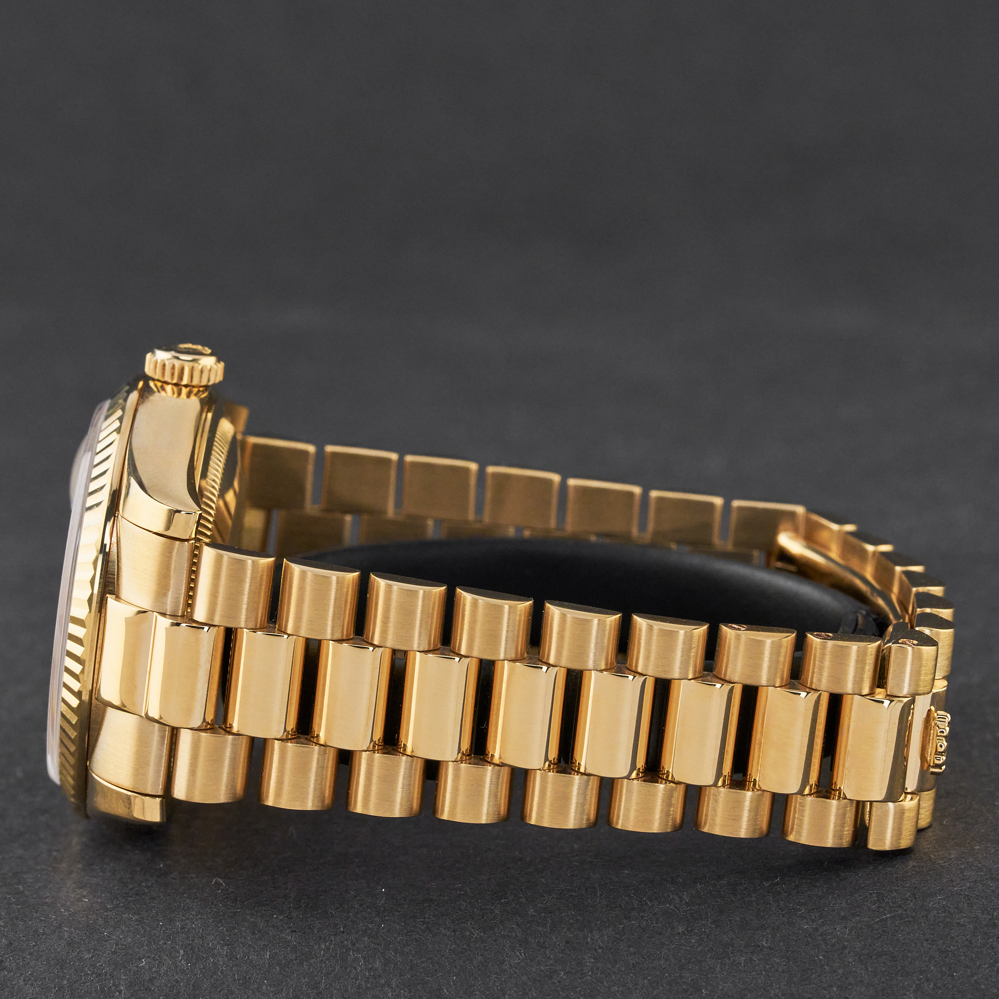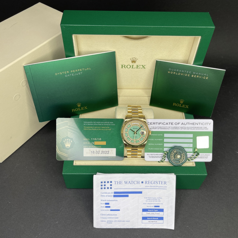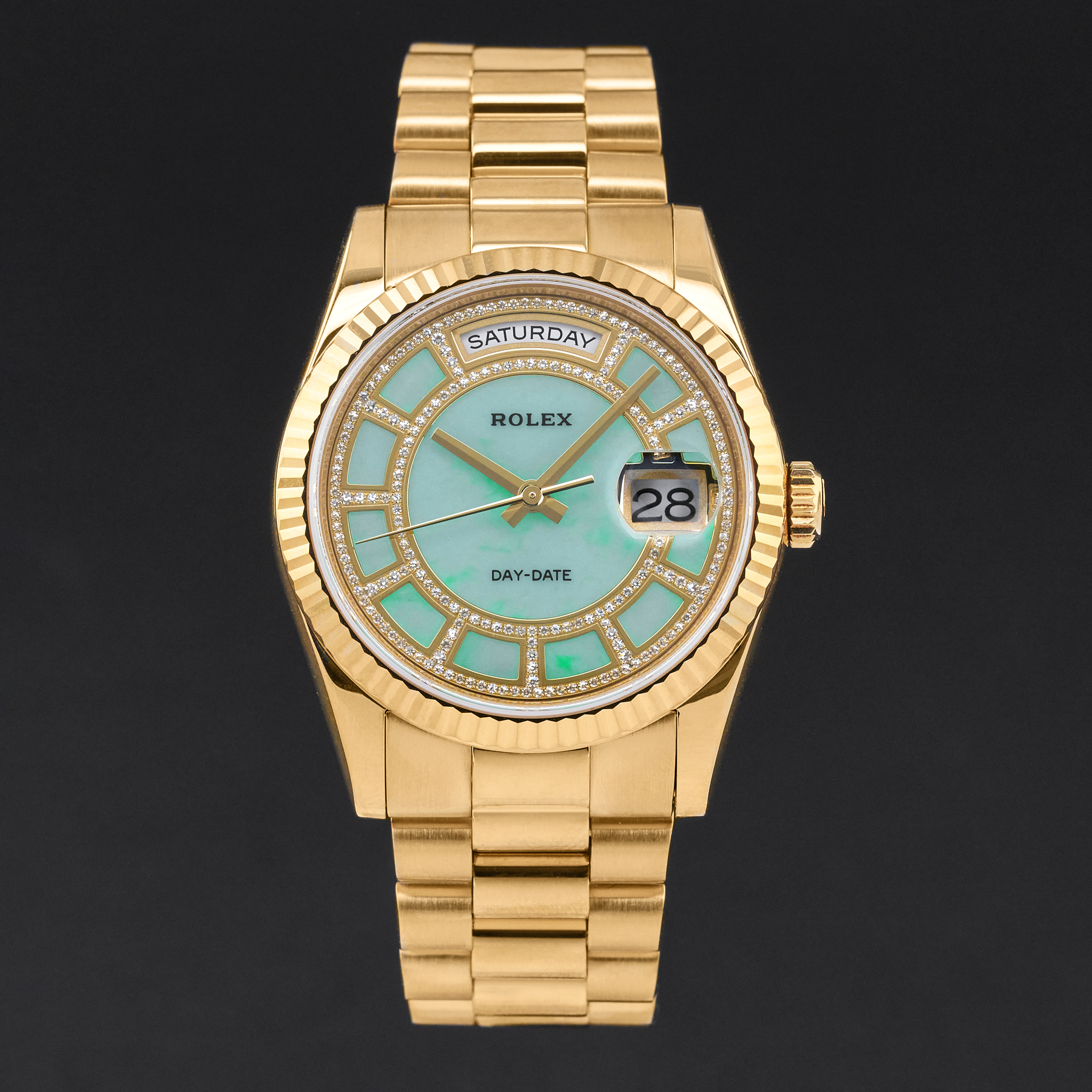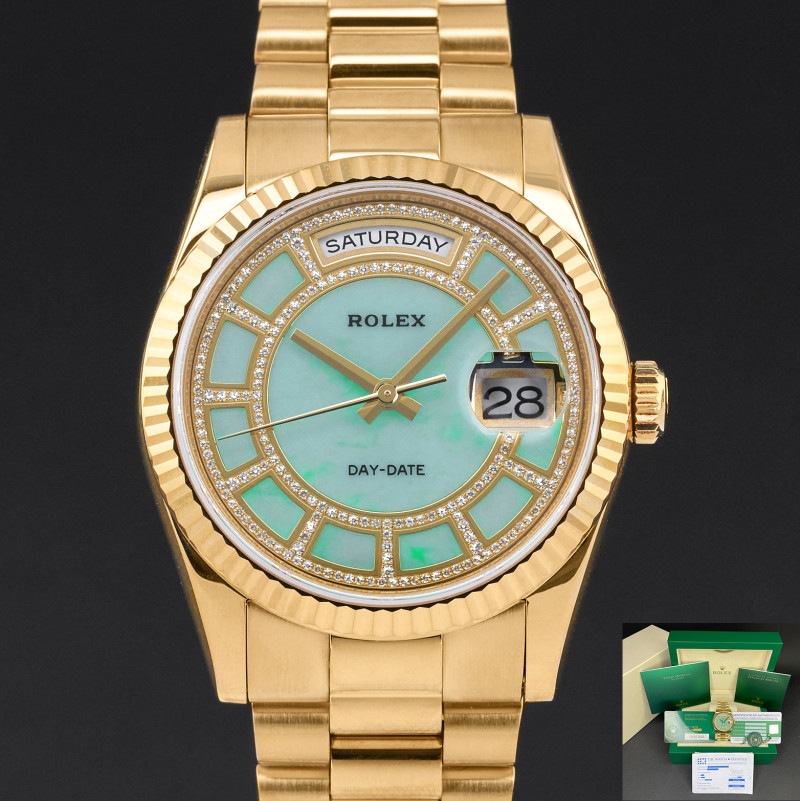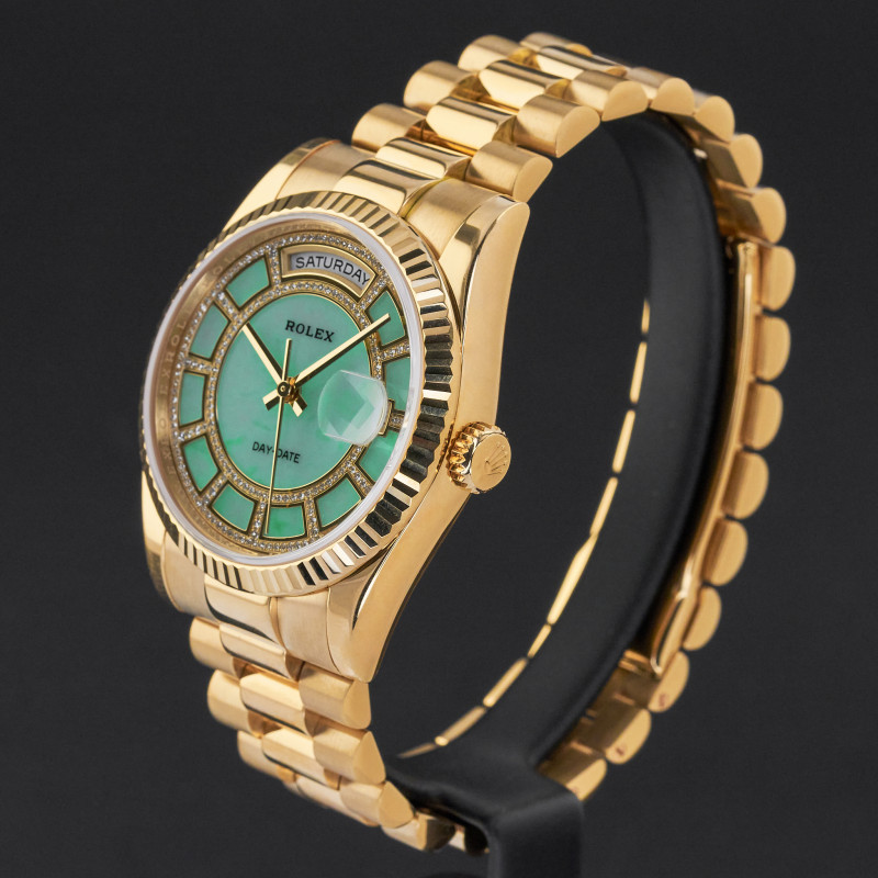 This Rolex Day-Date 118238 features a Carousel jade diamond dial and is crafted from 18K yellow gold, with a production year of 2022.
