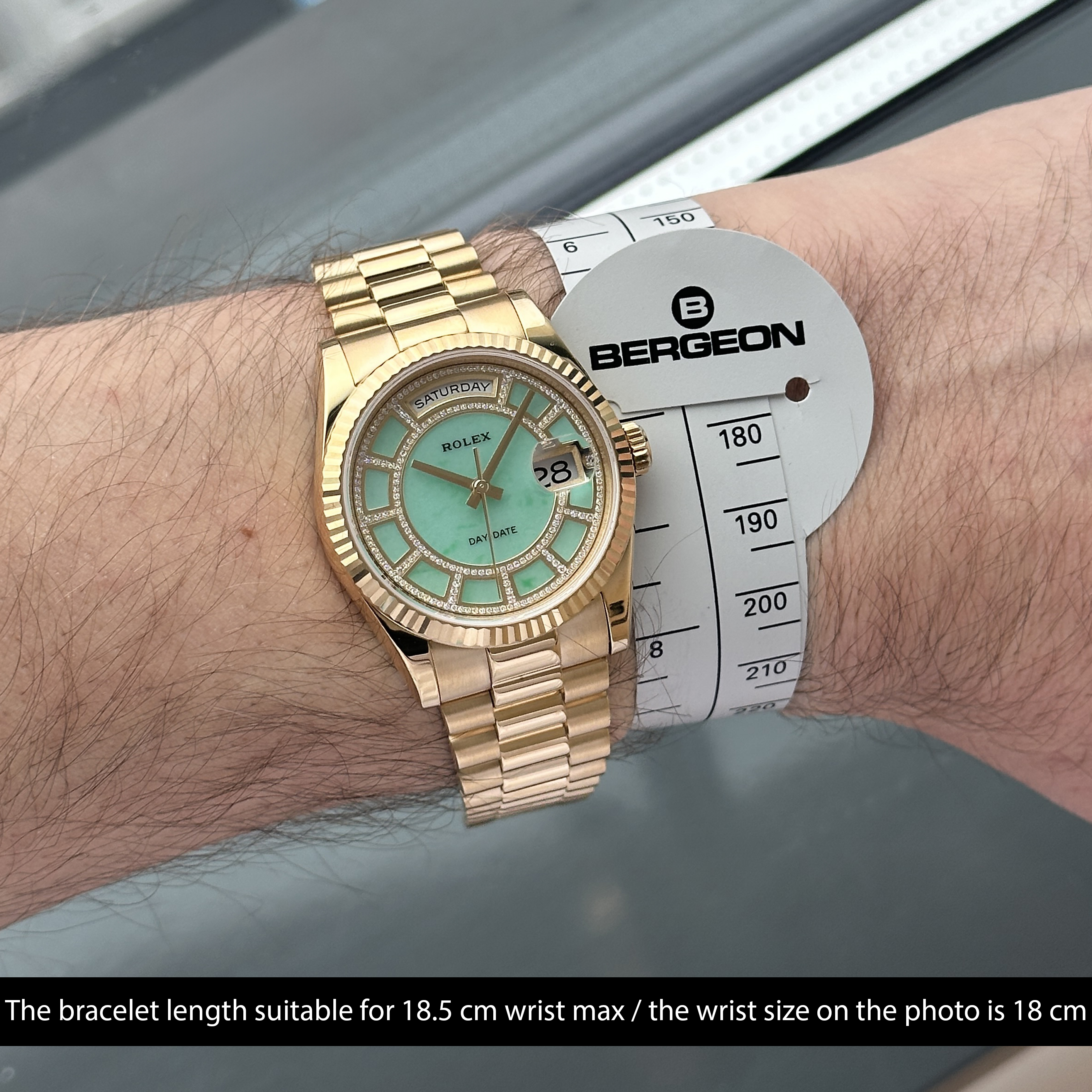The Rolex Day-Date is the embodiment of luxury and refined style, perfectly combining exceptional craftsmanship with timeless design. This model has become a symbol of success and elegance, offering not only precision but also uniqueness in every detail. The dial stands out with elements such as the Carousel Jade and diamonds, making it not just functional but a true work of art. These exquisite details highlight Rolex’s exceptional attention to craftsmanship, reflecting the brand’s commitment to perfection.