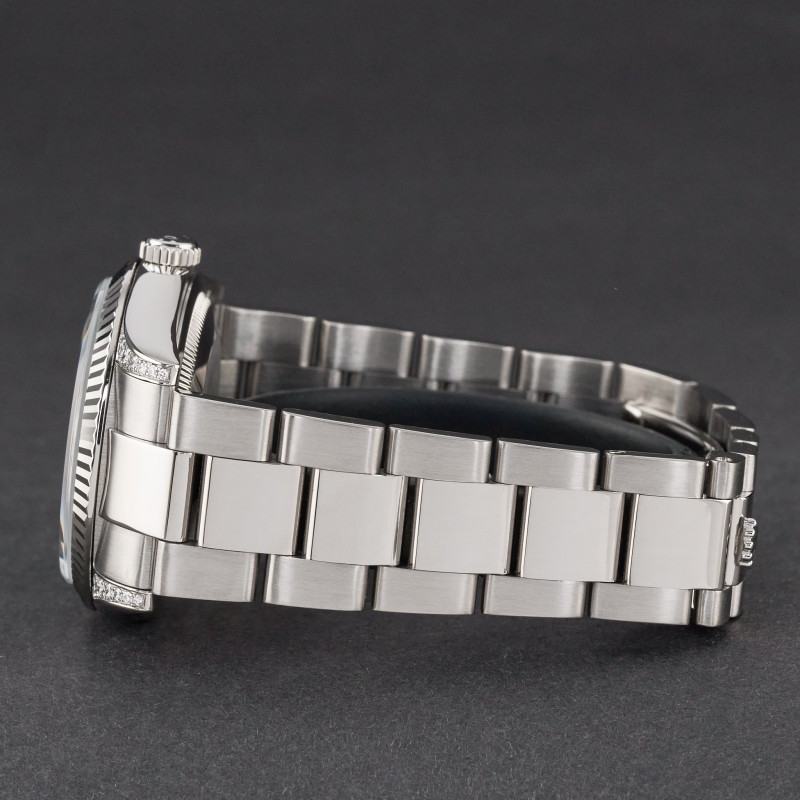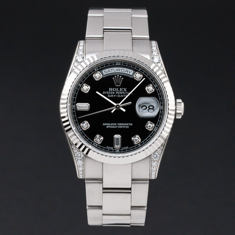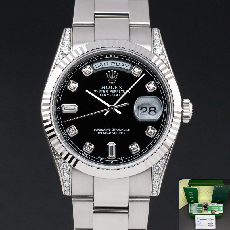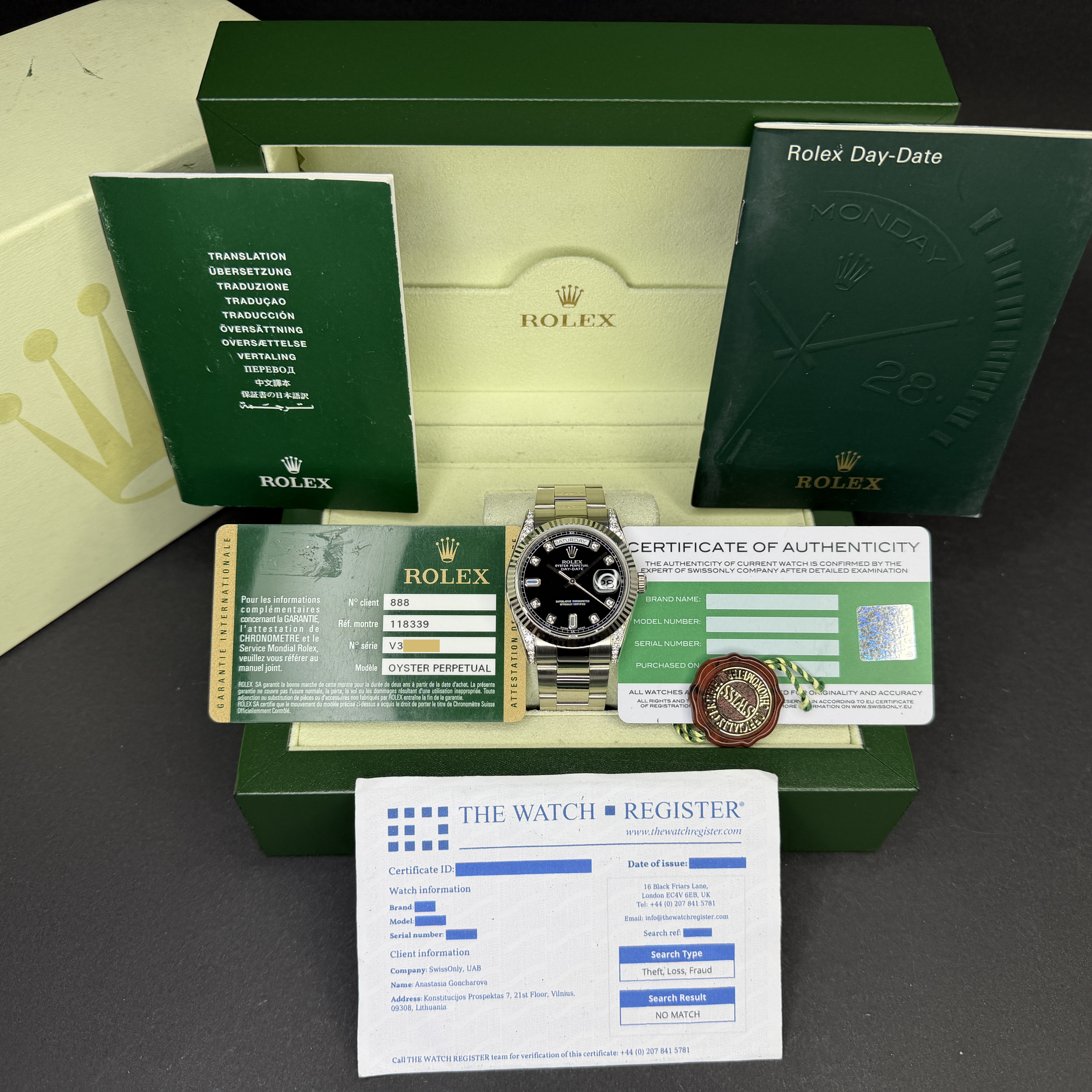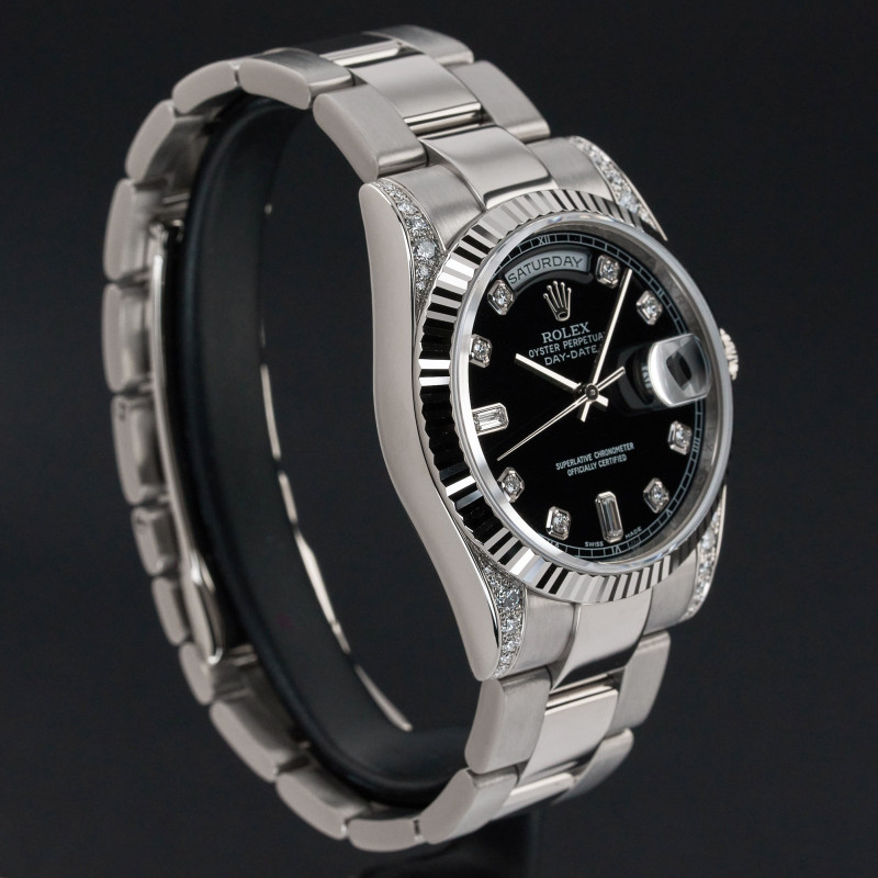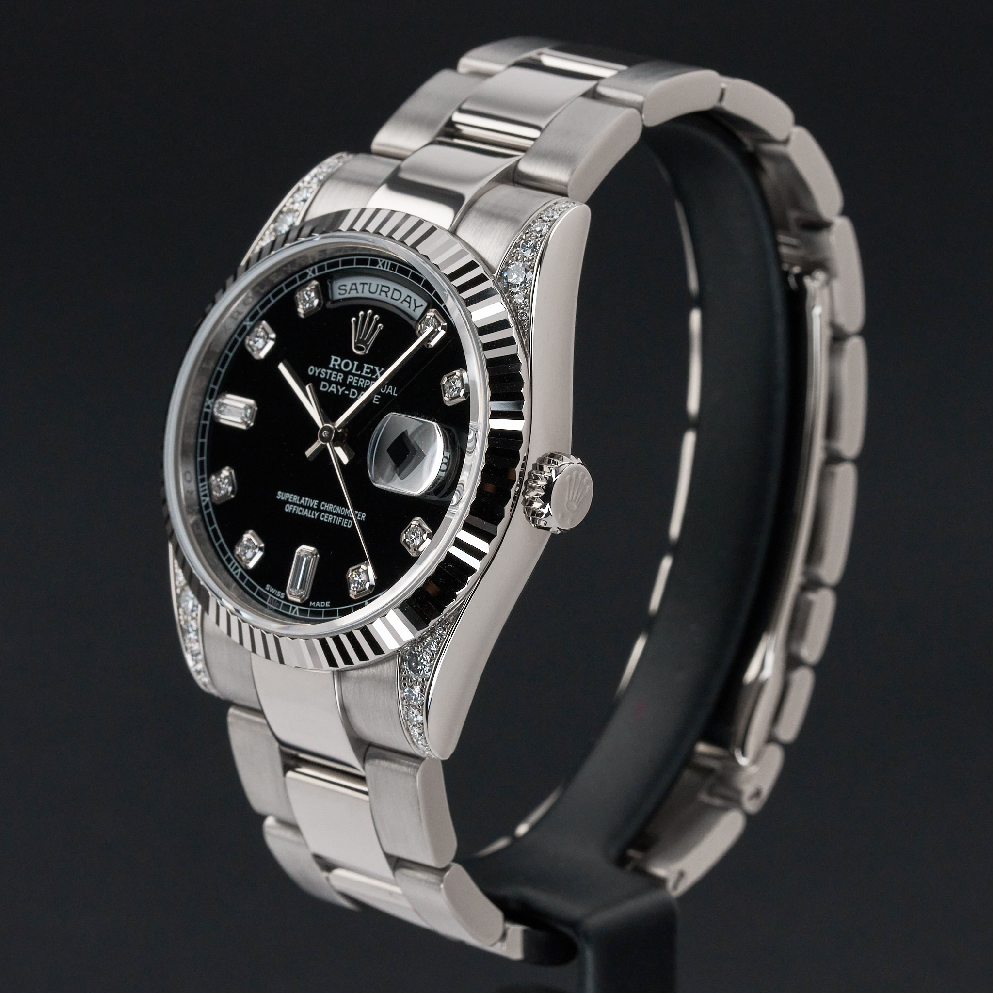 This Rolex Day-Date 118339 features a Black diamond dial and is crafted from 18K white gold, with a production year of 2009.
