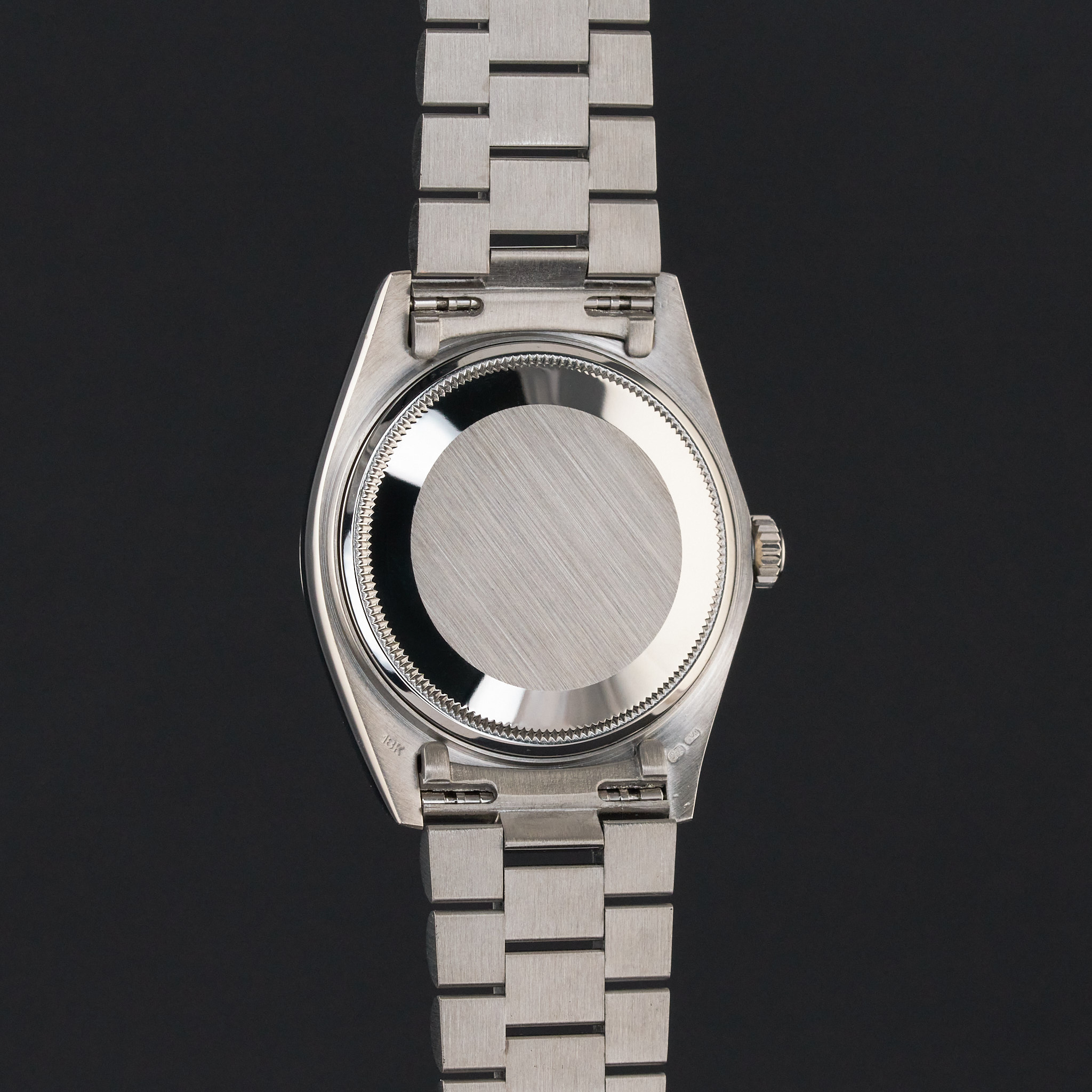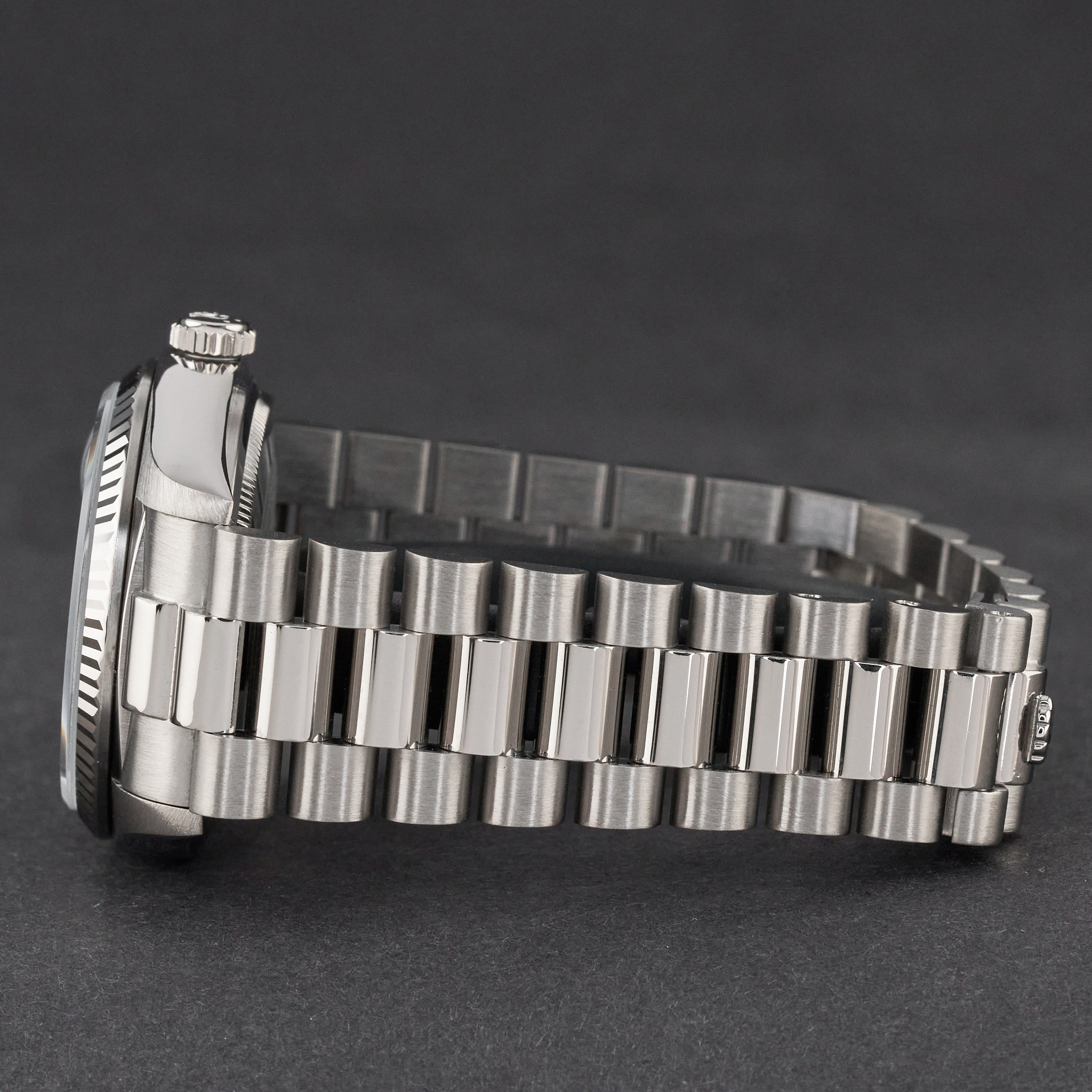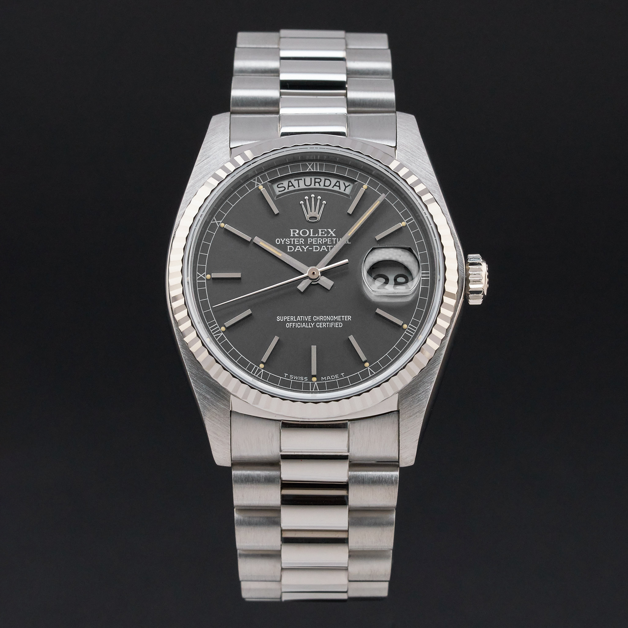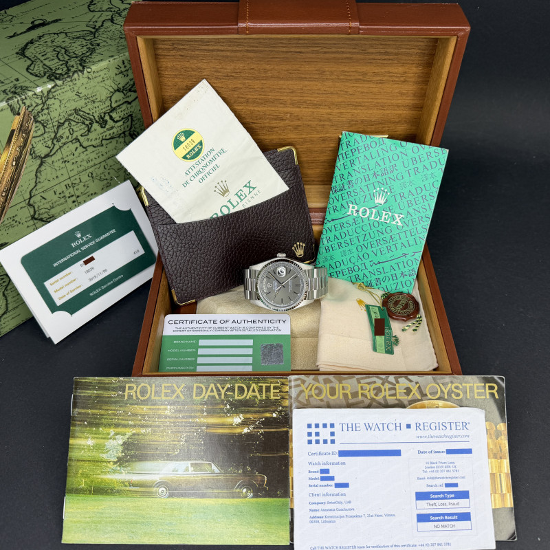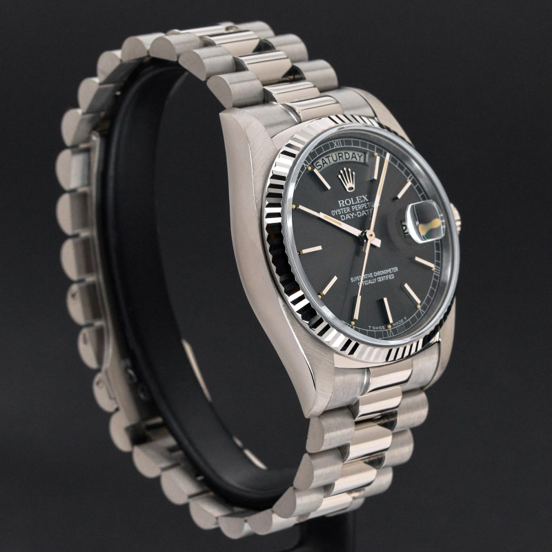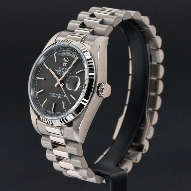 This Rolex Day-Date 18039 features a Grey dial and is crafted from 18K white gold, with a production year of 1979.