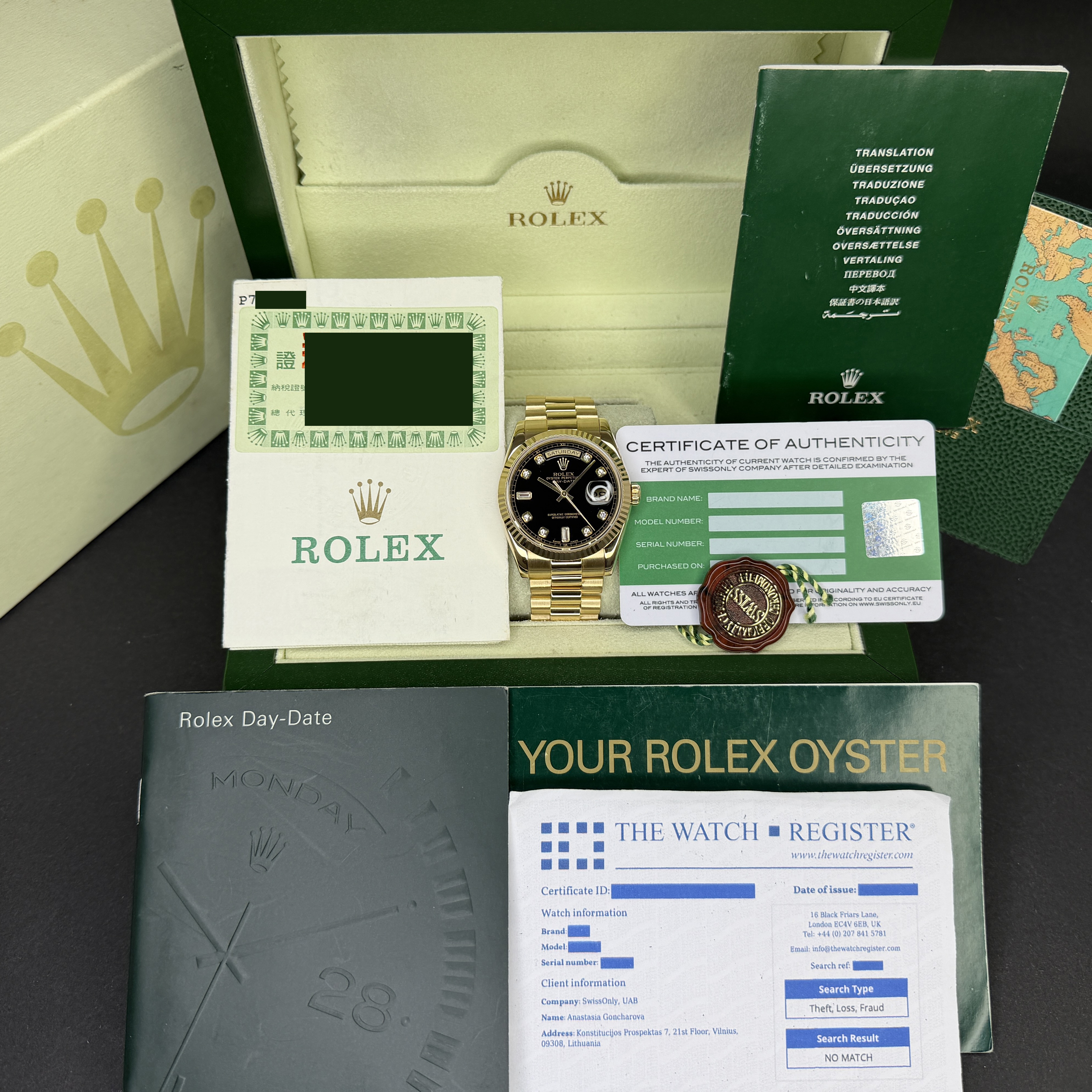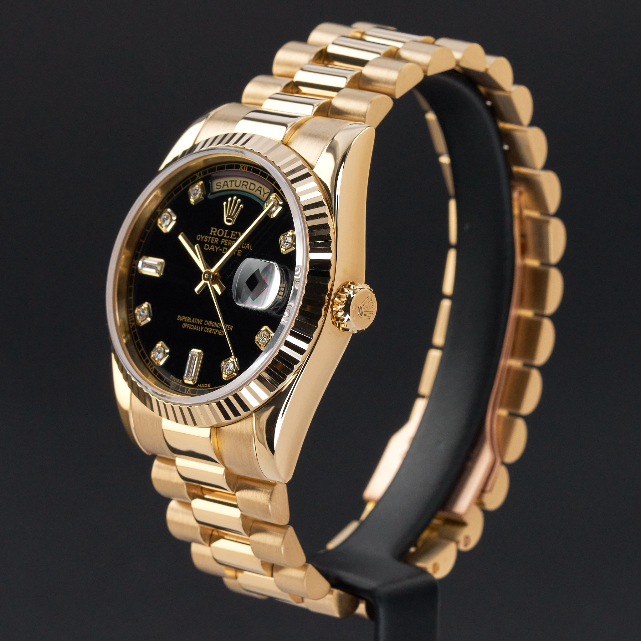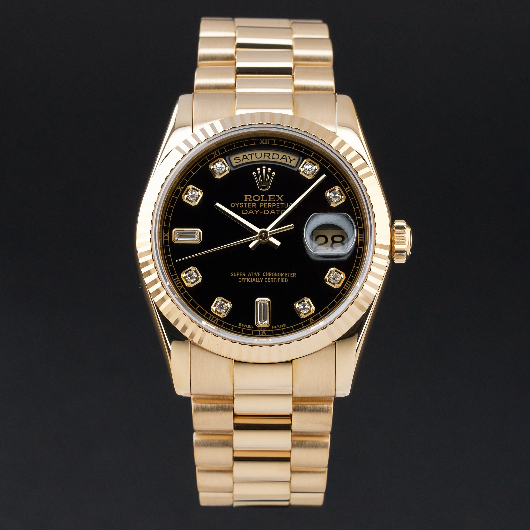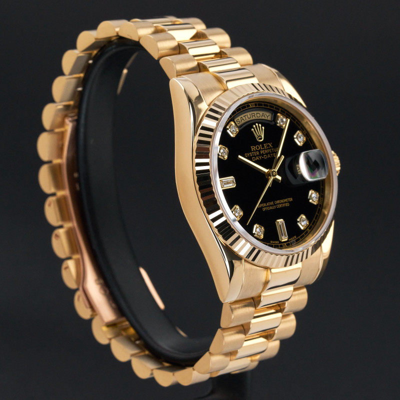 This Rolex Day-Date 118238 features a Black big diamond dial and is crafted from 18K yellow gold, with a production year of 2000.