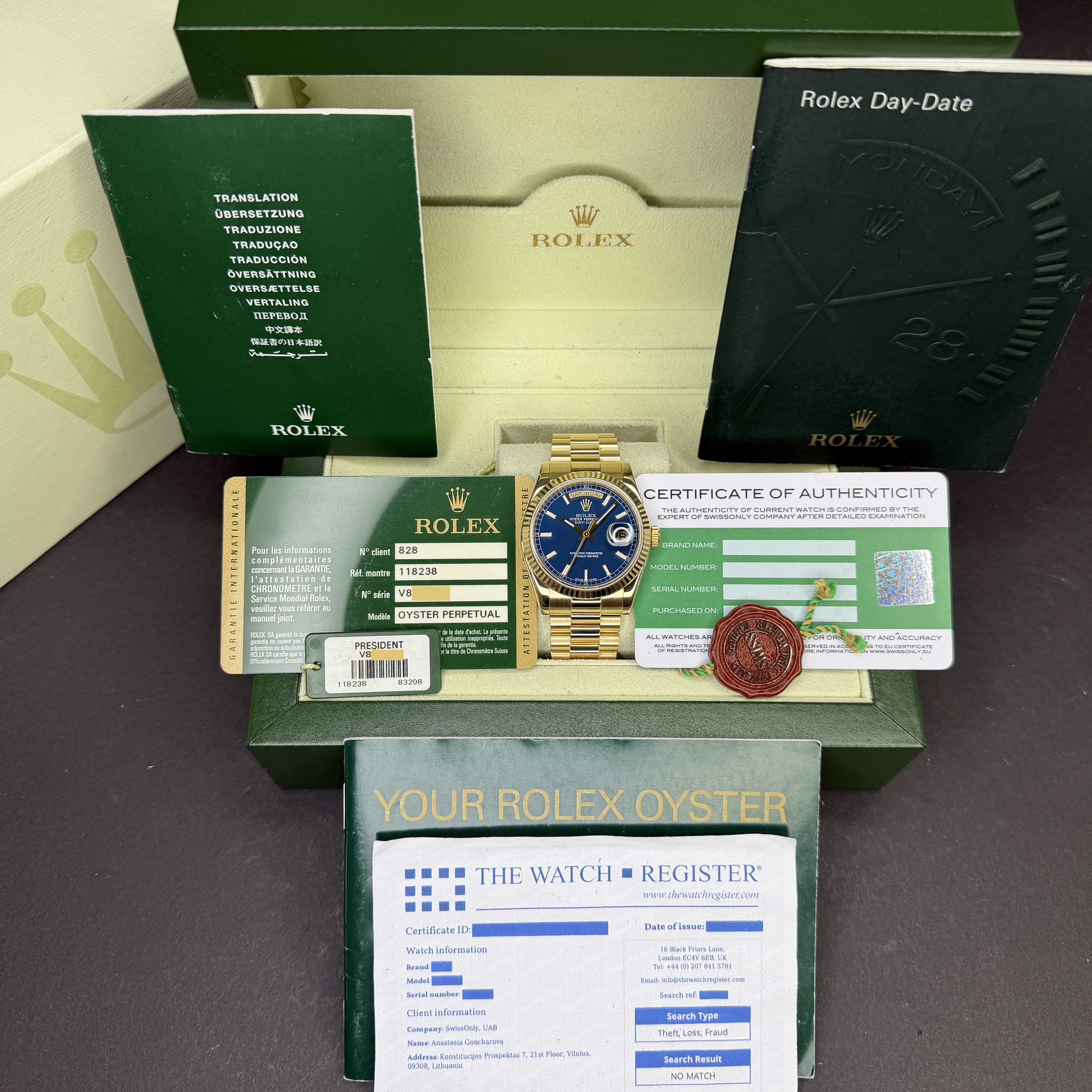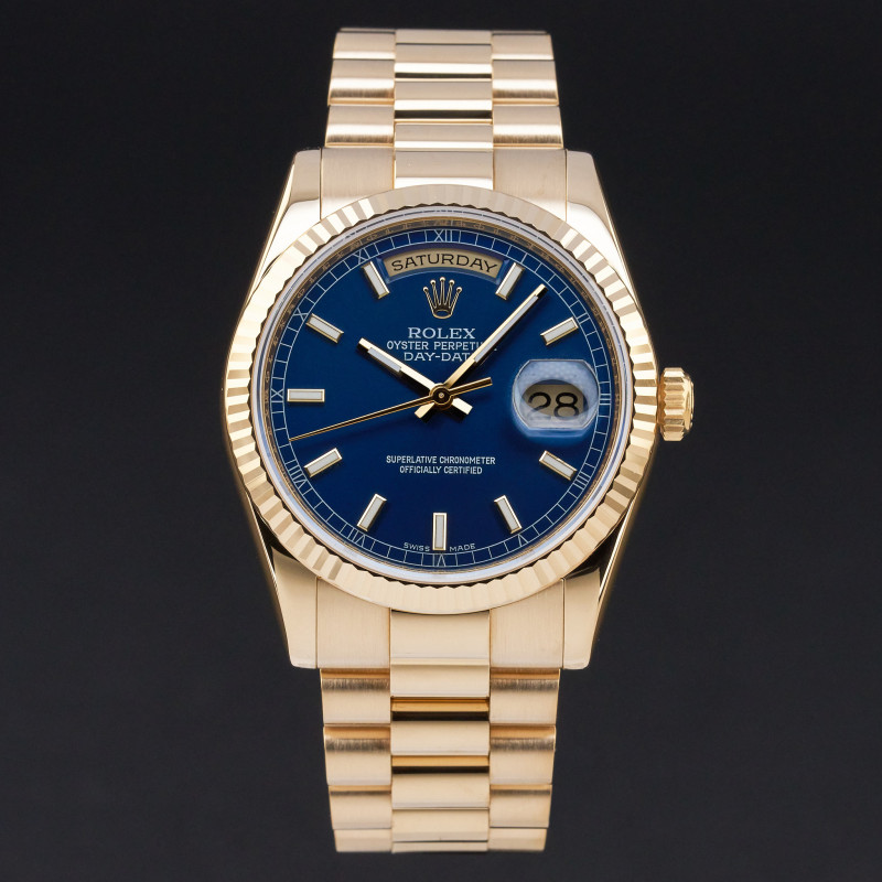 This Rolex Day-Date 118238 features a Blue dial and is crafted from 18K yellow gold, with a production year of 2009.