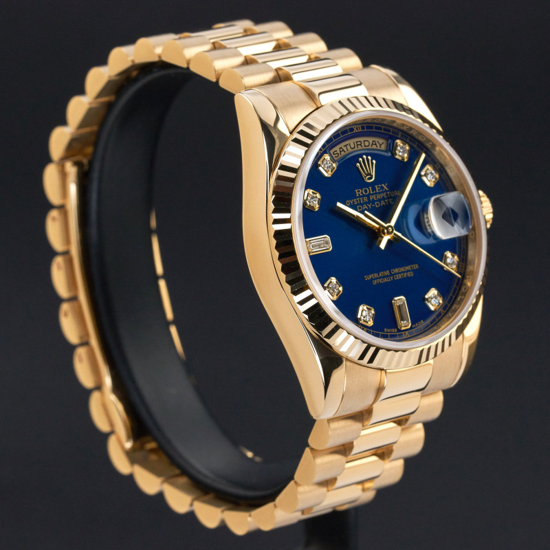 This Rolex Day-Date 118238 features a Blue Diamond dial and is crafted from 18K yellow gold, with a production year of 2010.