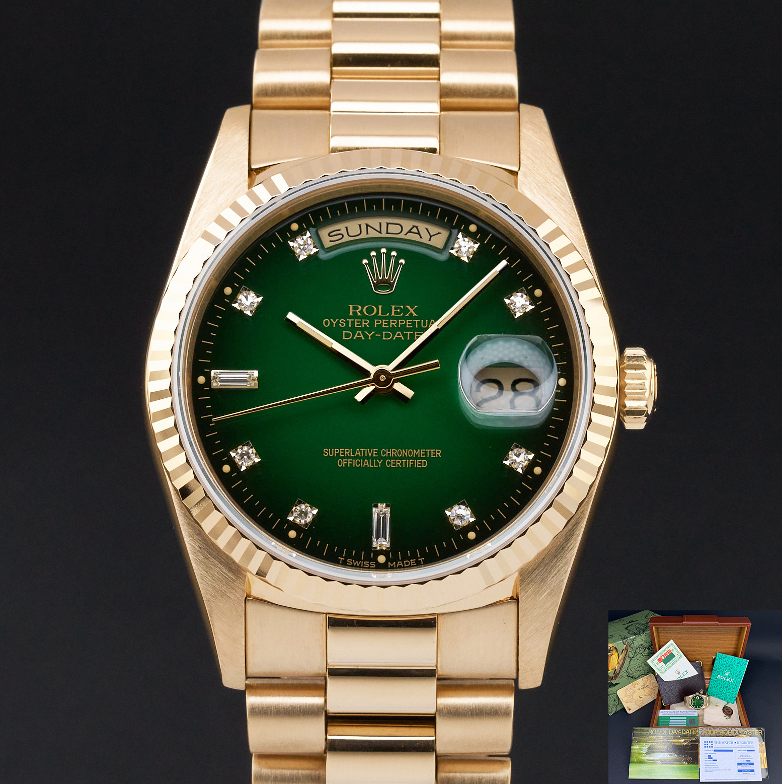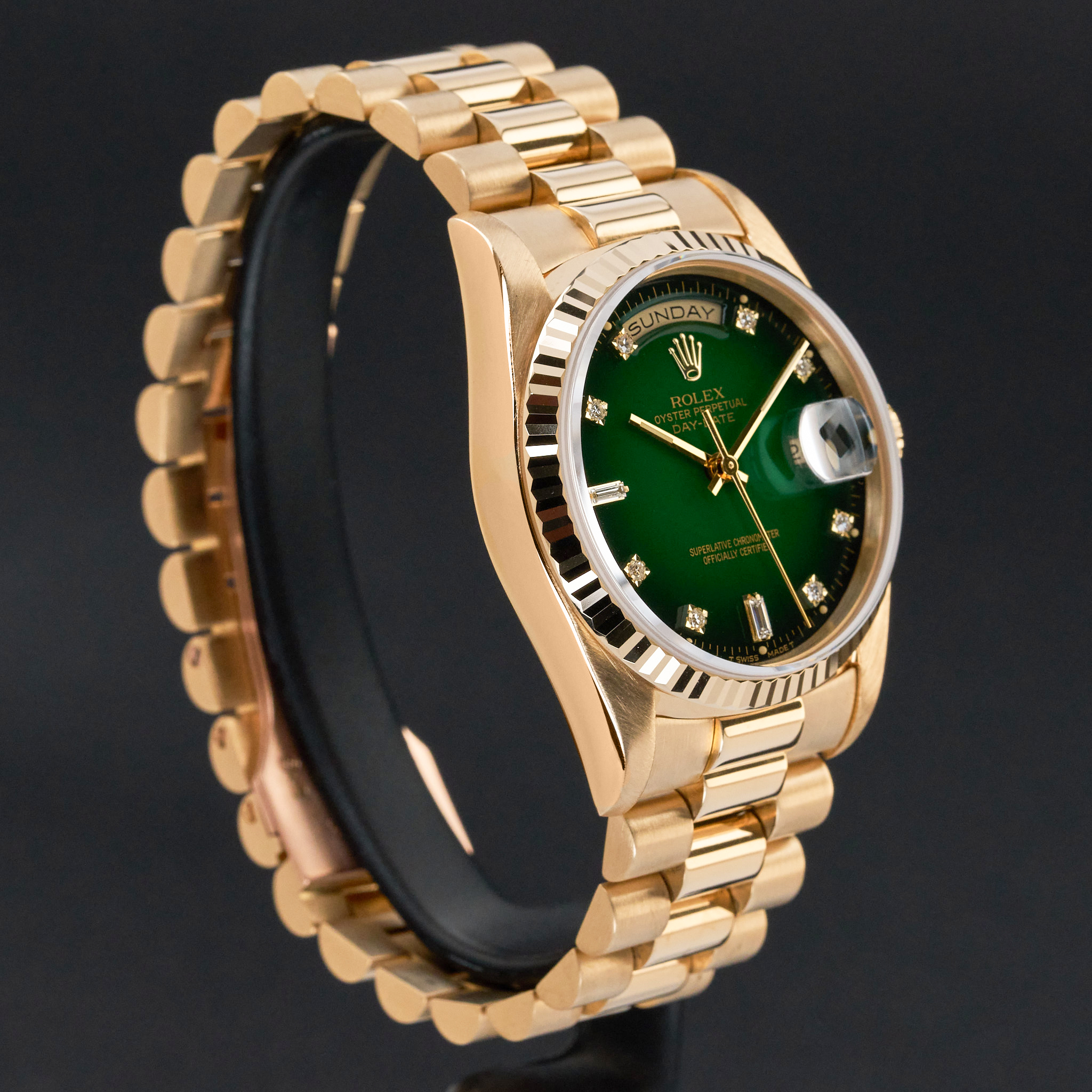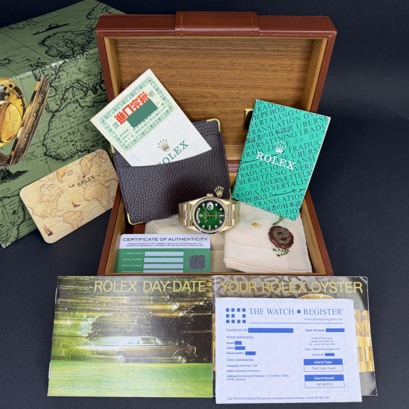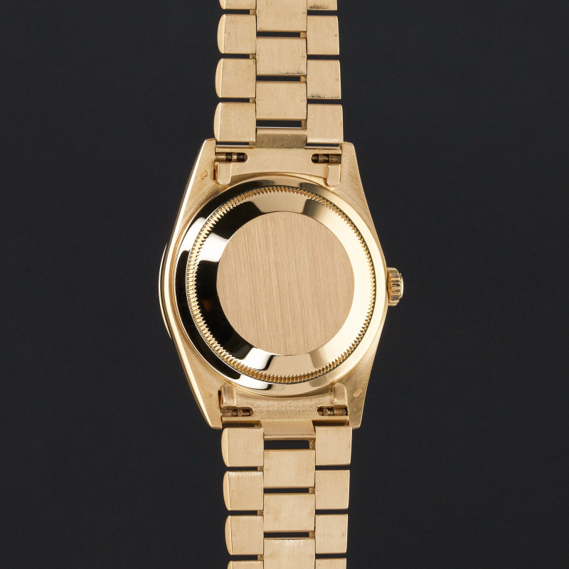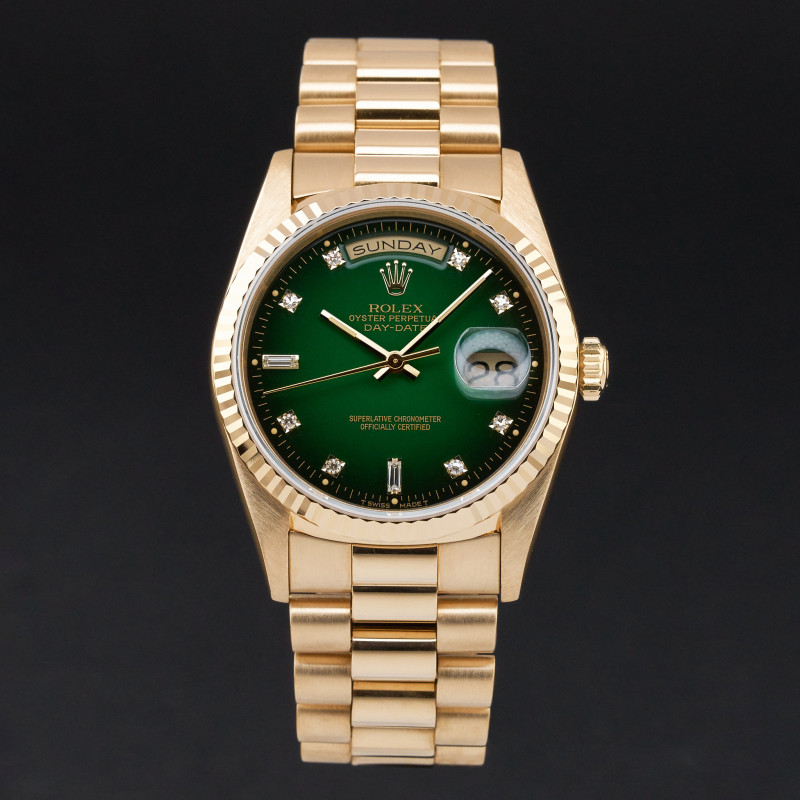 This Rolex Day-Date 18238 features a Green vignette small diamond dial and is crafted from 18K yellow gold, with a production year of 1991.