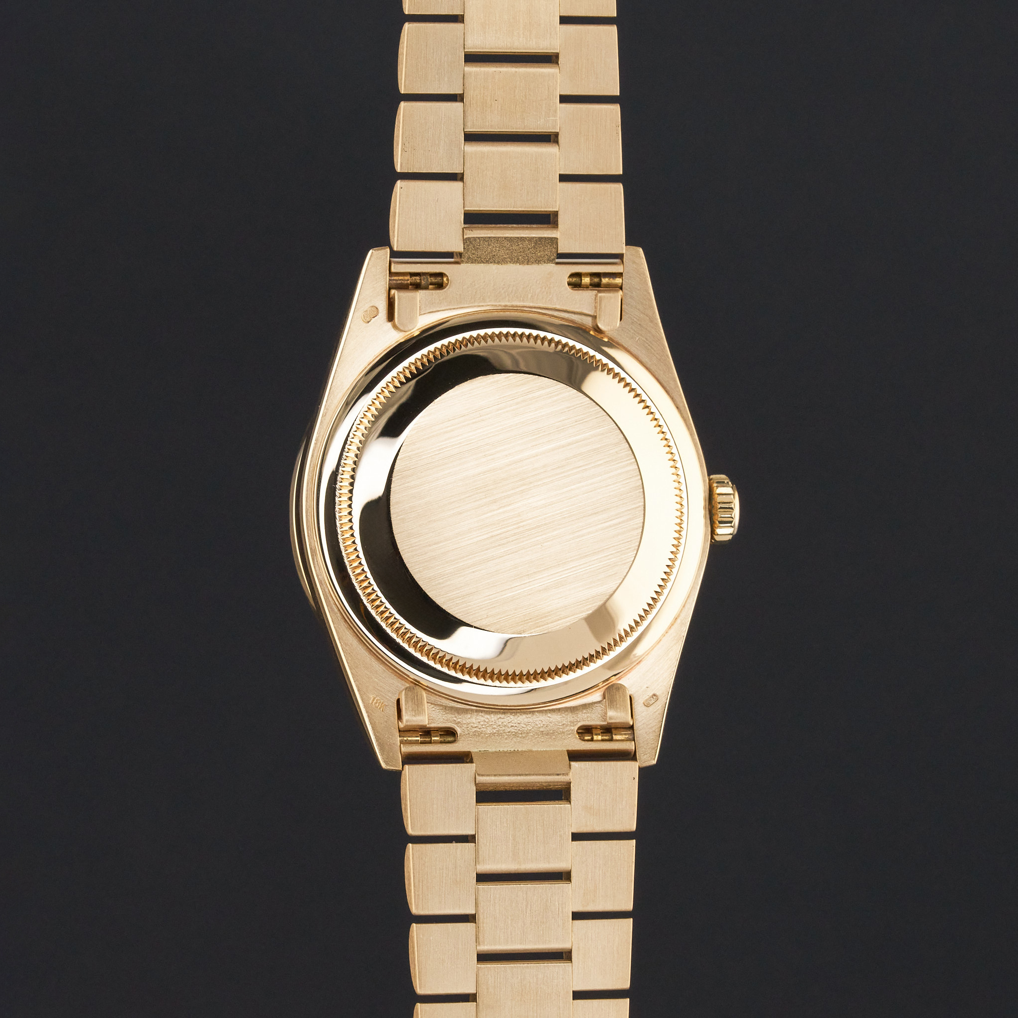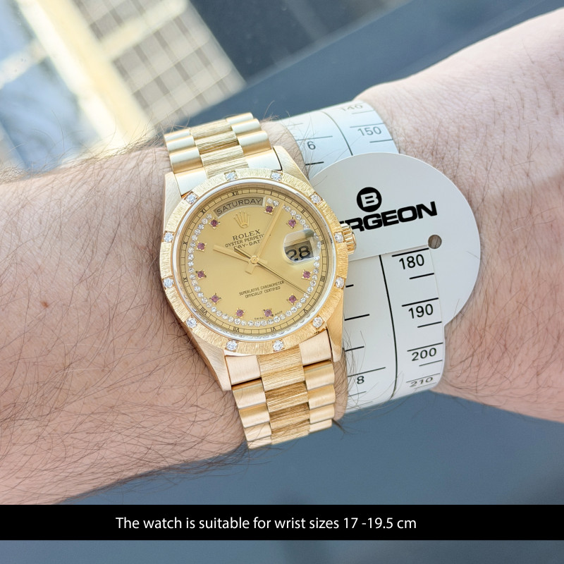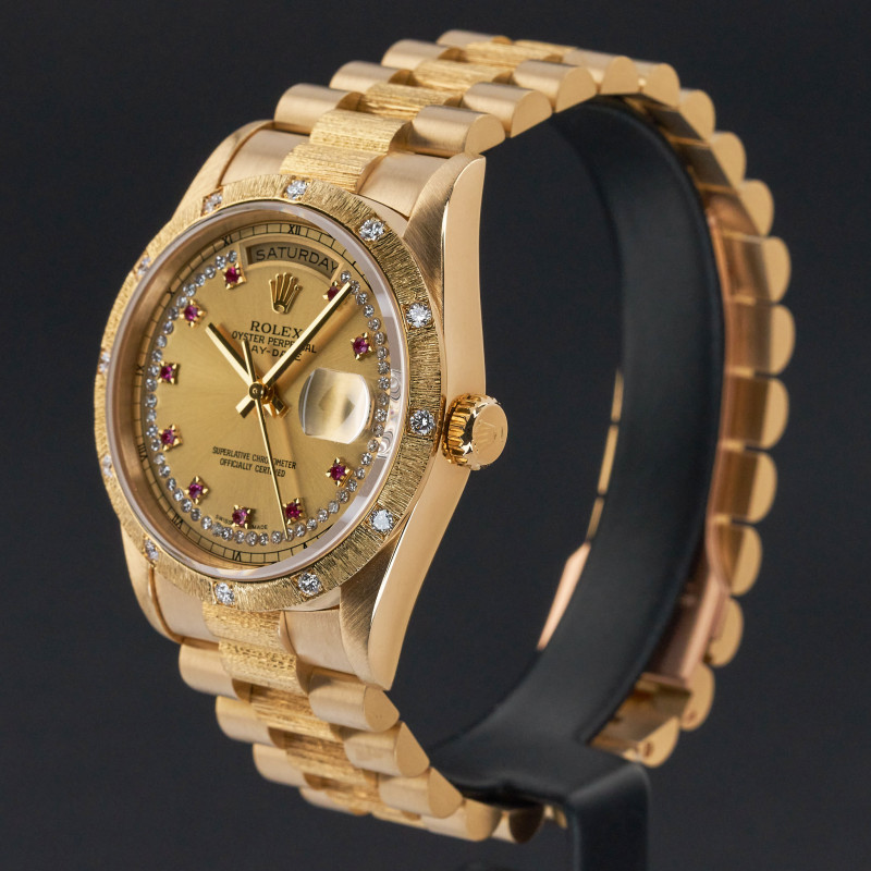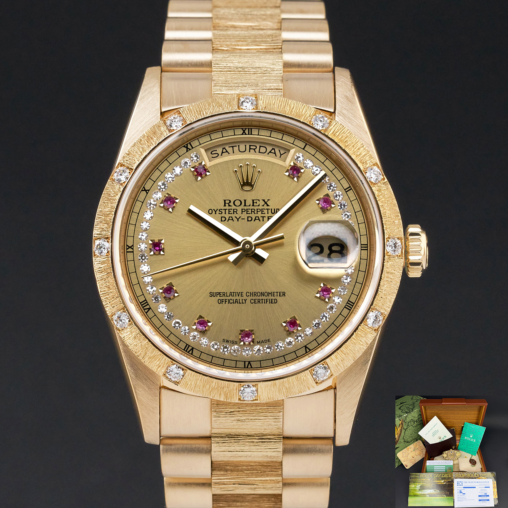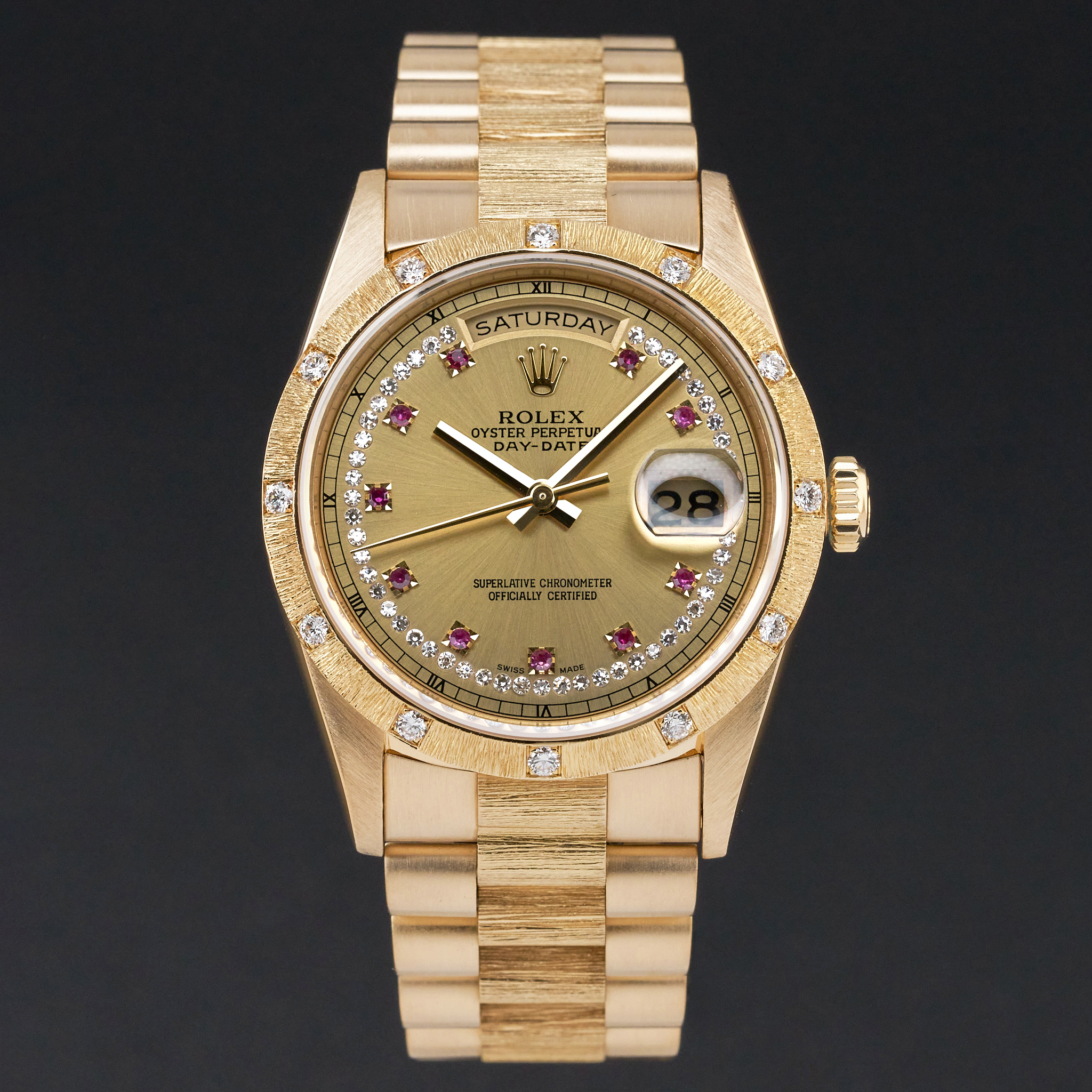 This Rolex Day-Date features a Champagne ruby diamond dial and is crafted from 18K yellow gold, with a production year of 1991.