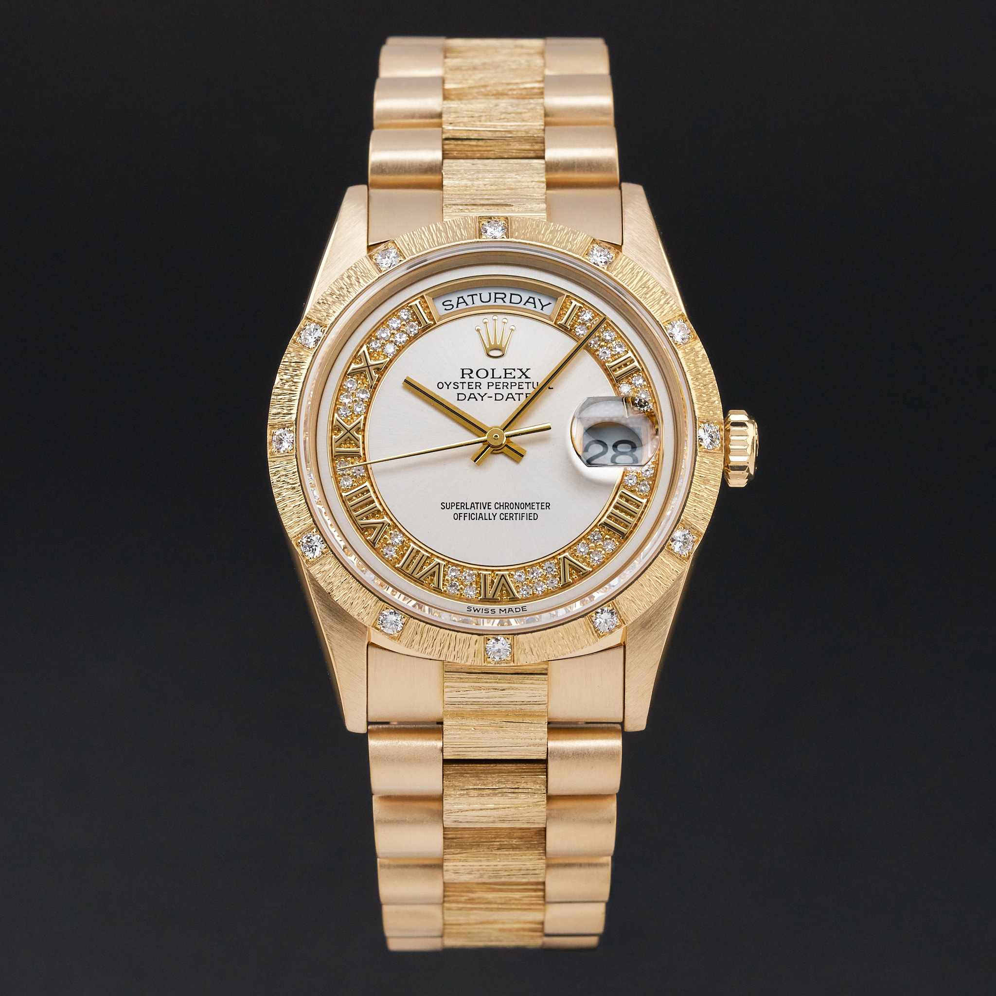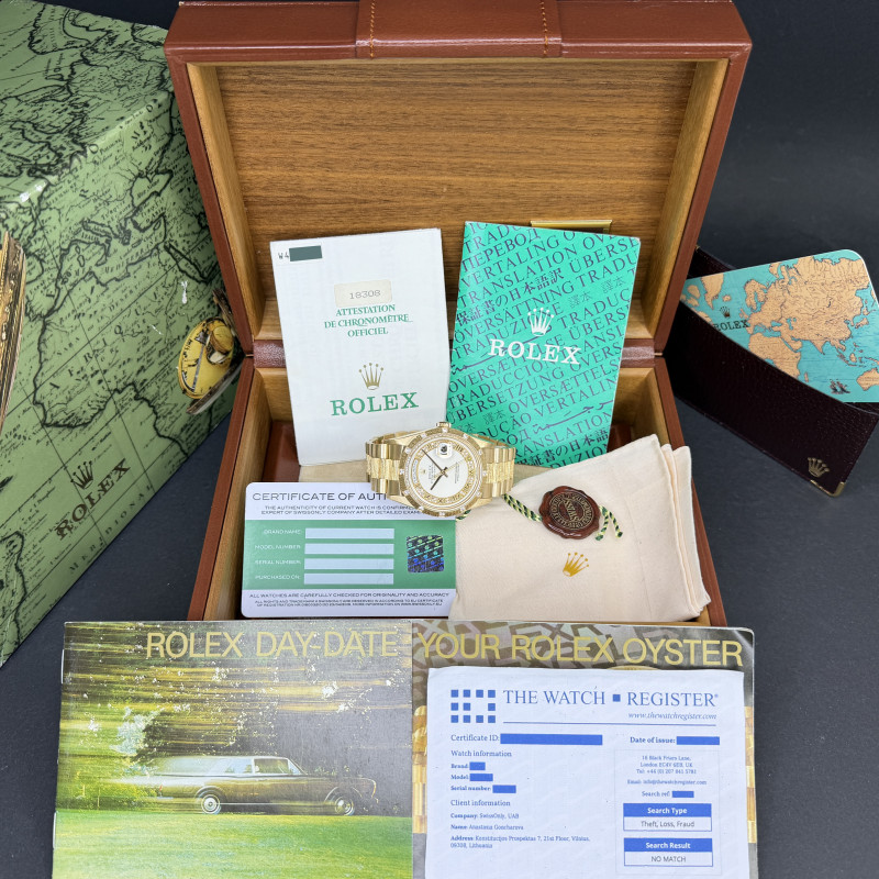This Rolex Day-Date 18308 features a Silver myriad Roman diamond dial and is crafted from 18K yellow gold, with a production year of 1995.