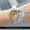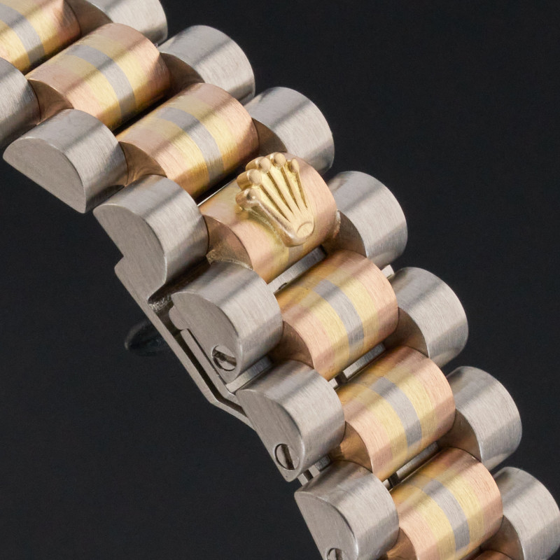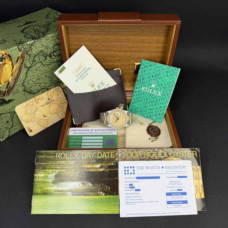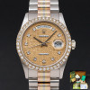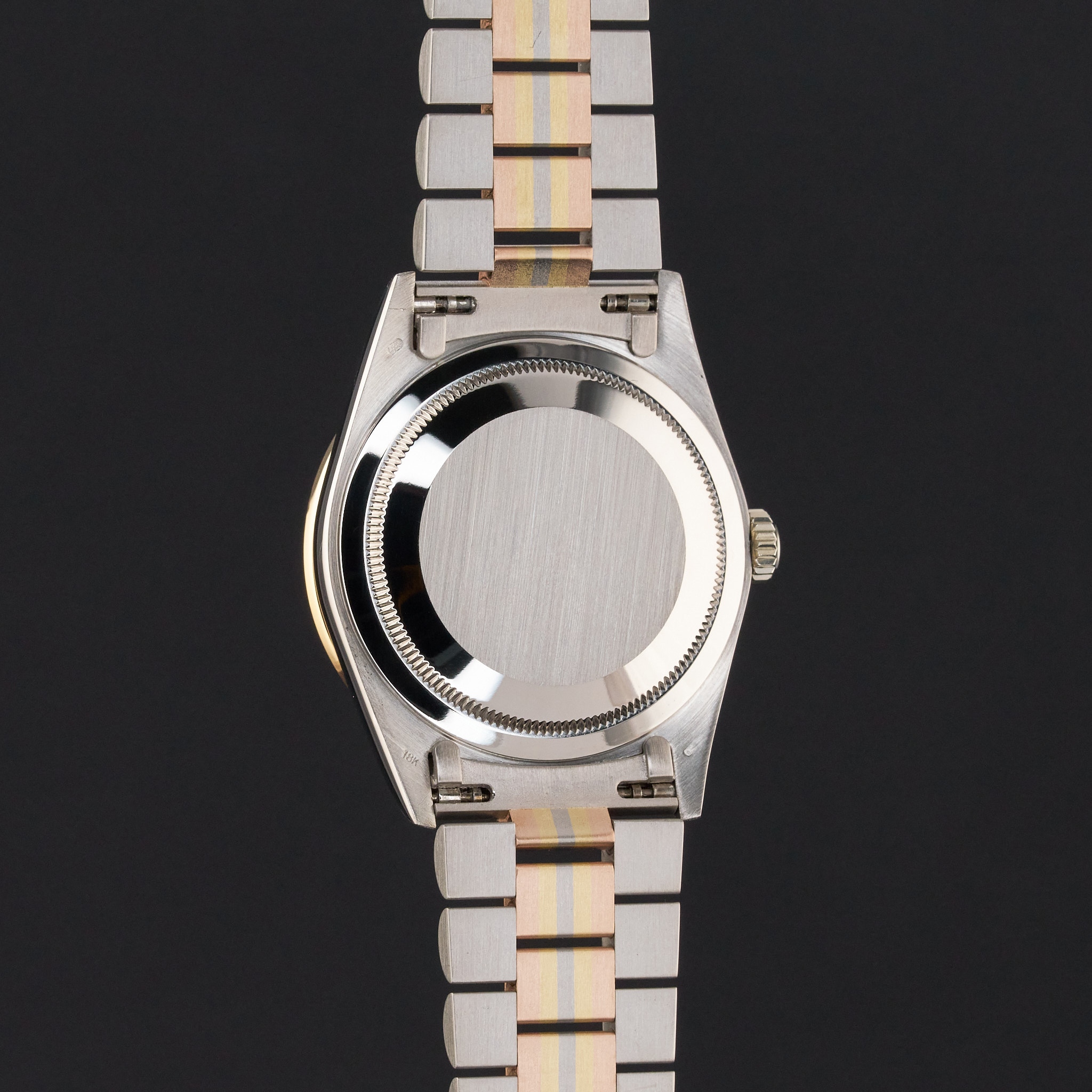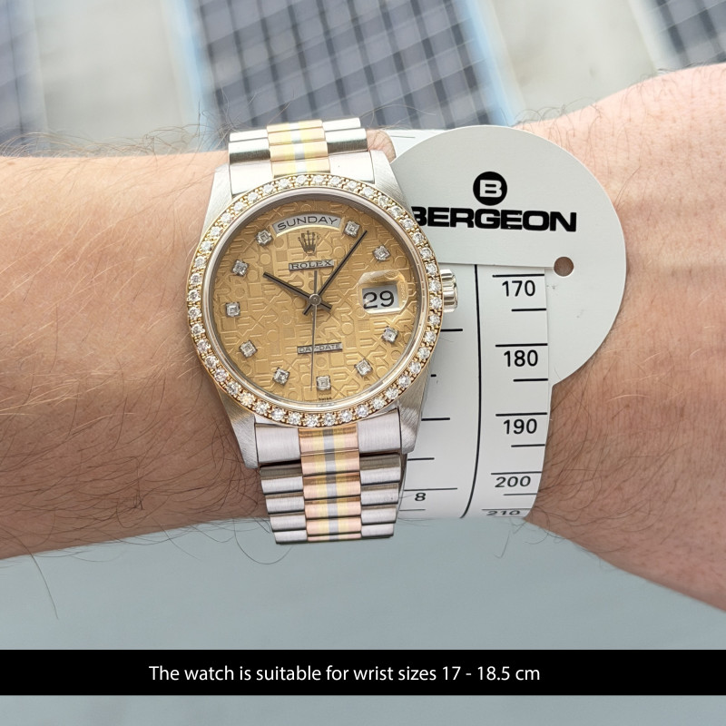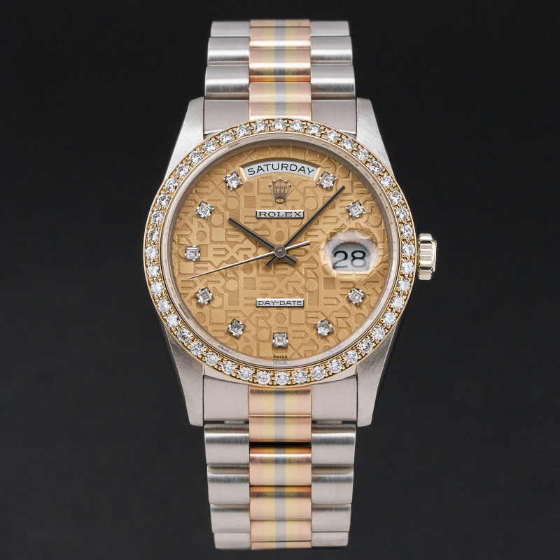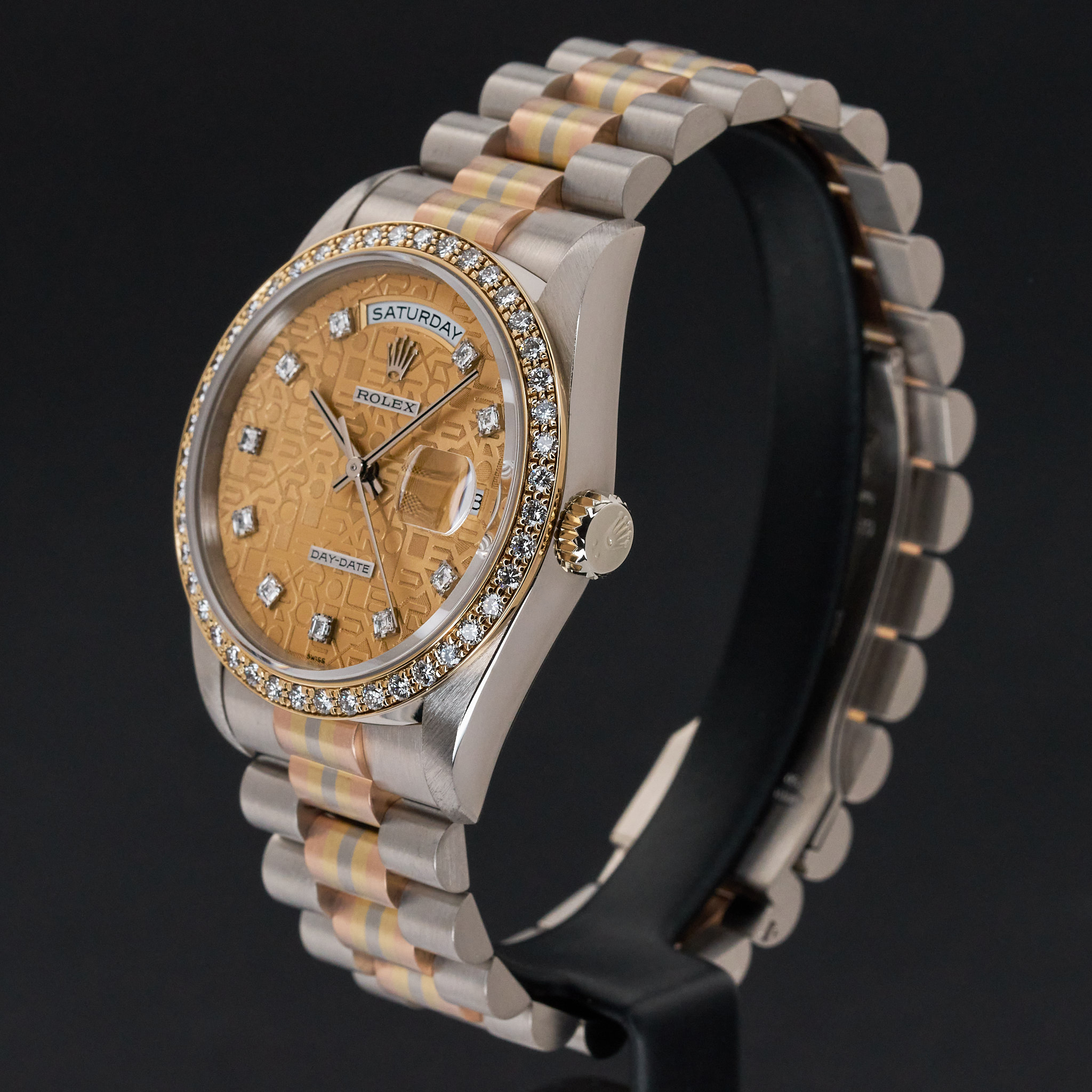This Rolex Rare TRIDOR Day-Date 18349 features a Champagne jubilee small diamond dial and is crafted from 18K white gold, with a production year of 1989.