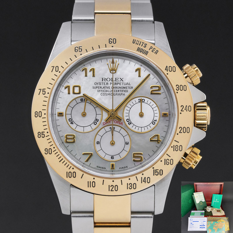 This Rolex Daytona 16523 features a Mother of pearl Arabic dial and is crafted from 18K yellow gold and stainless steel, with a production year of 1999.