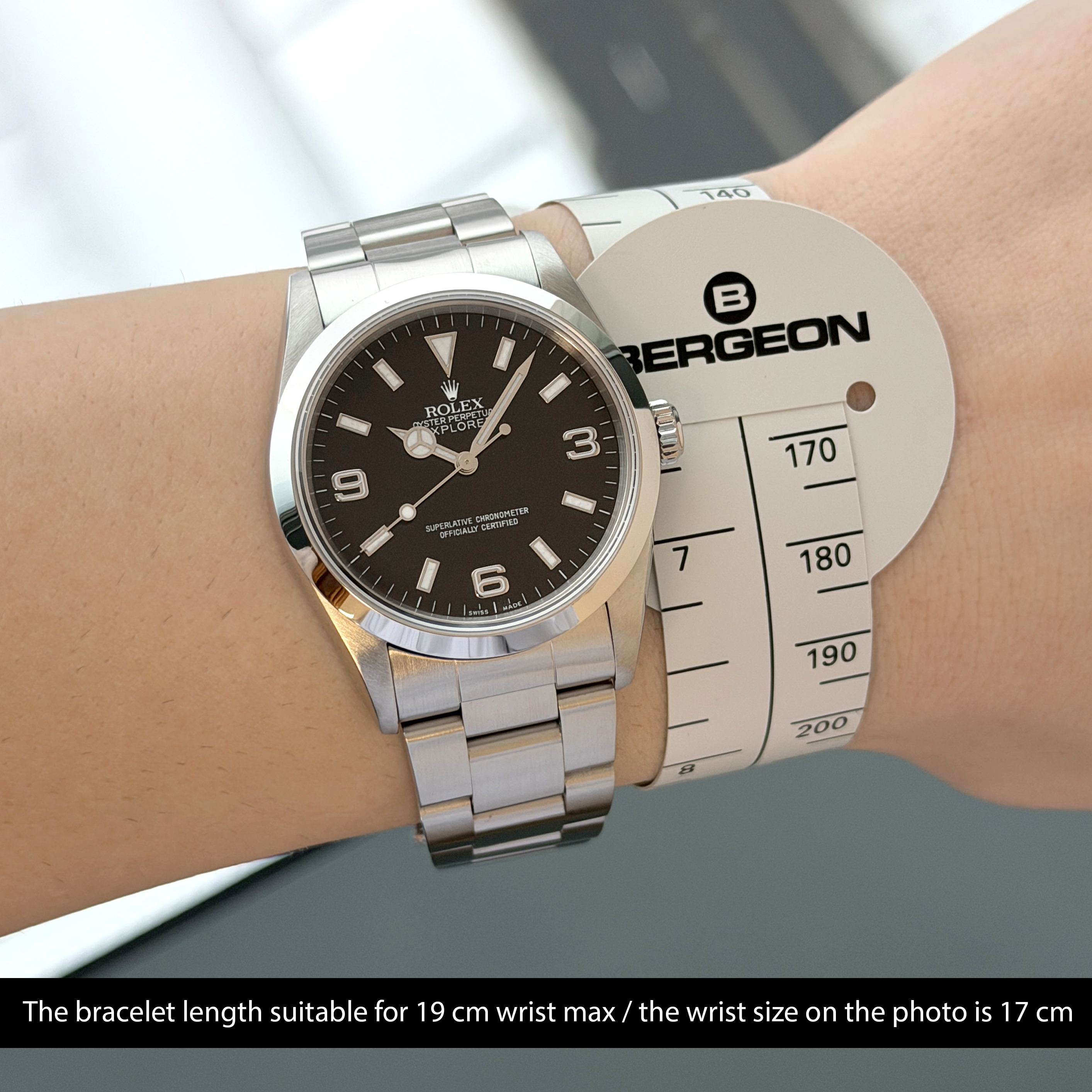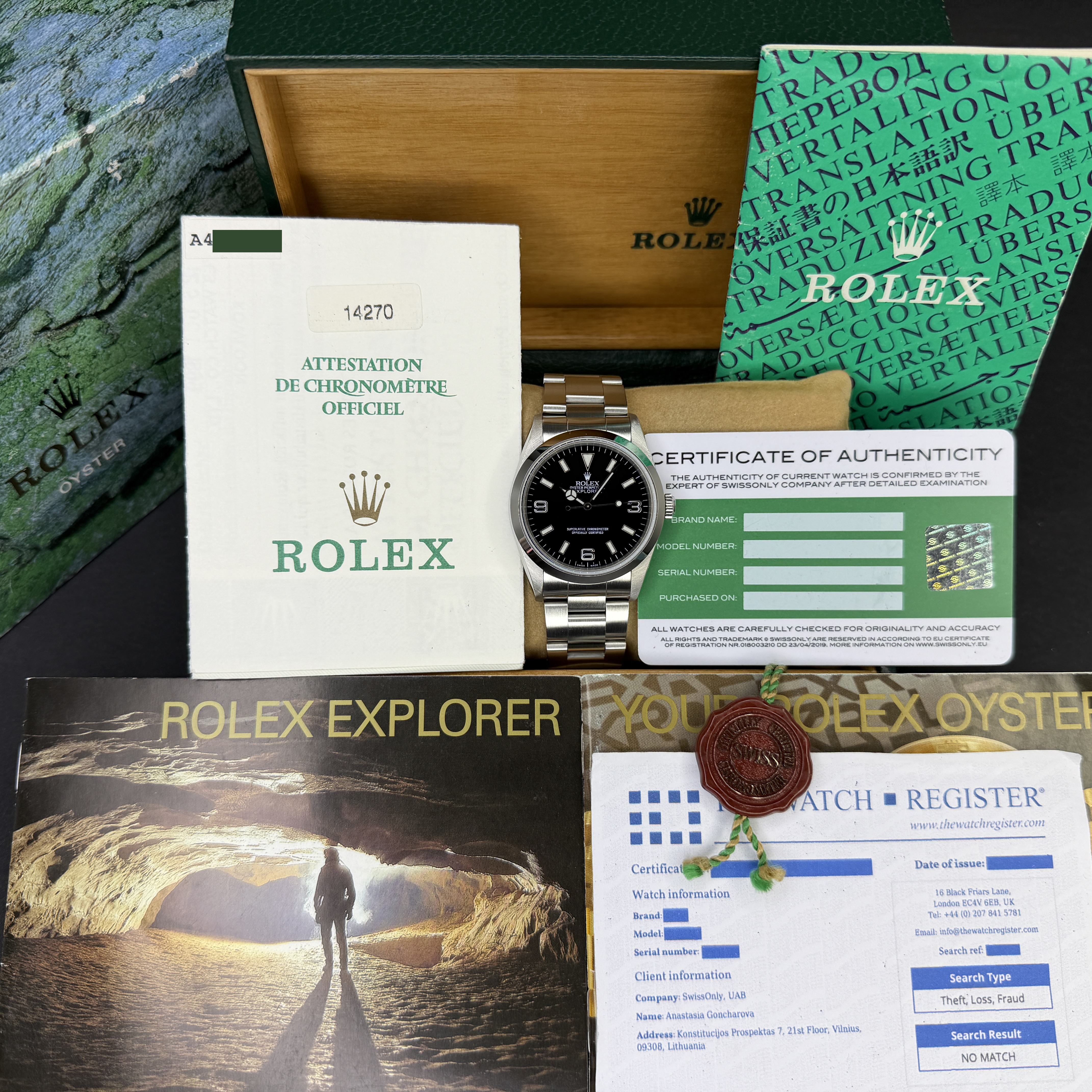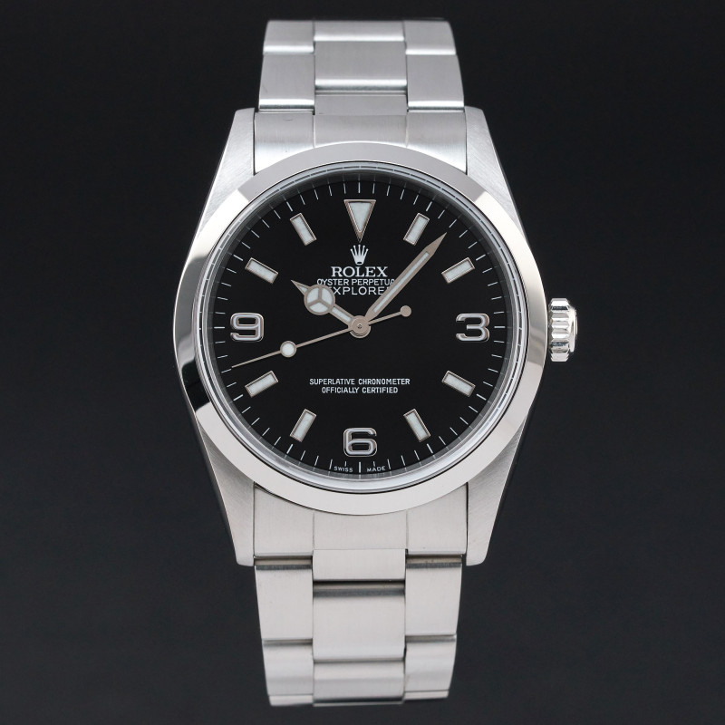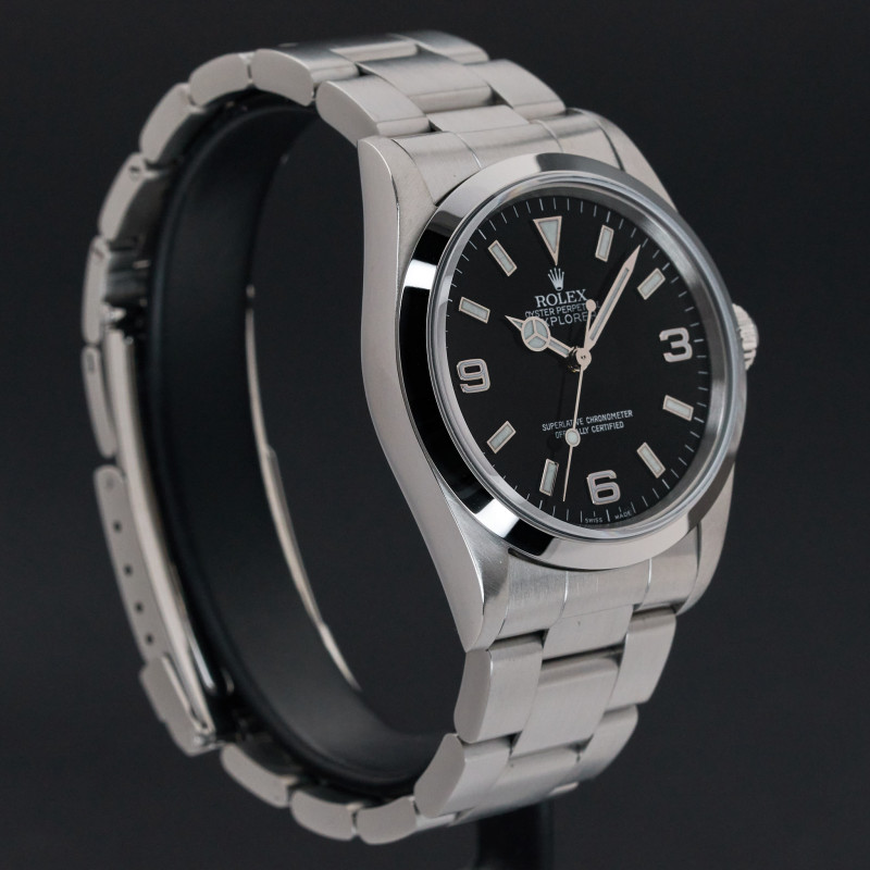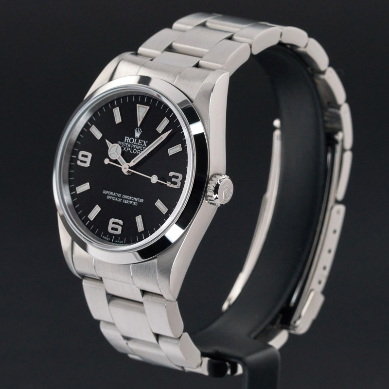 This Rolex Explorer 14270 features a Black Arabic dial and is crafted from stainless steel, with a production year of 1999.