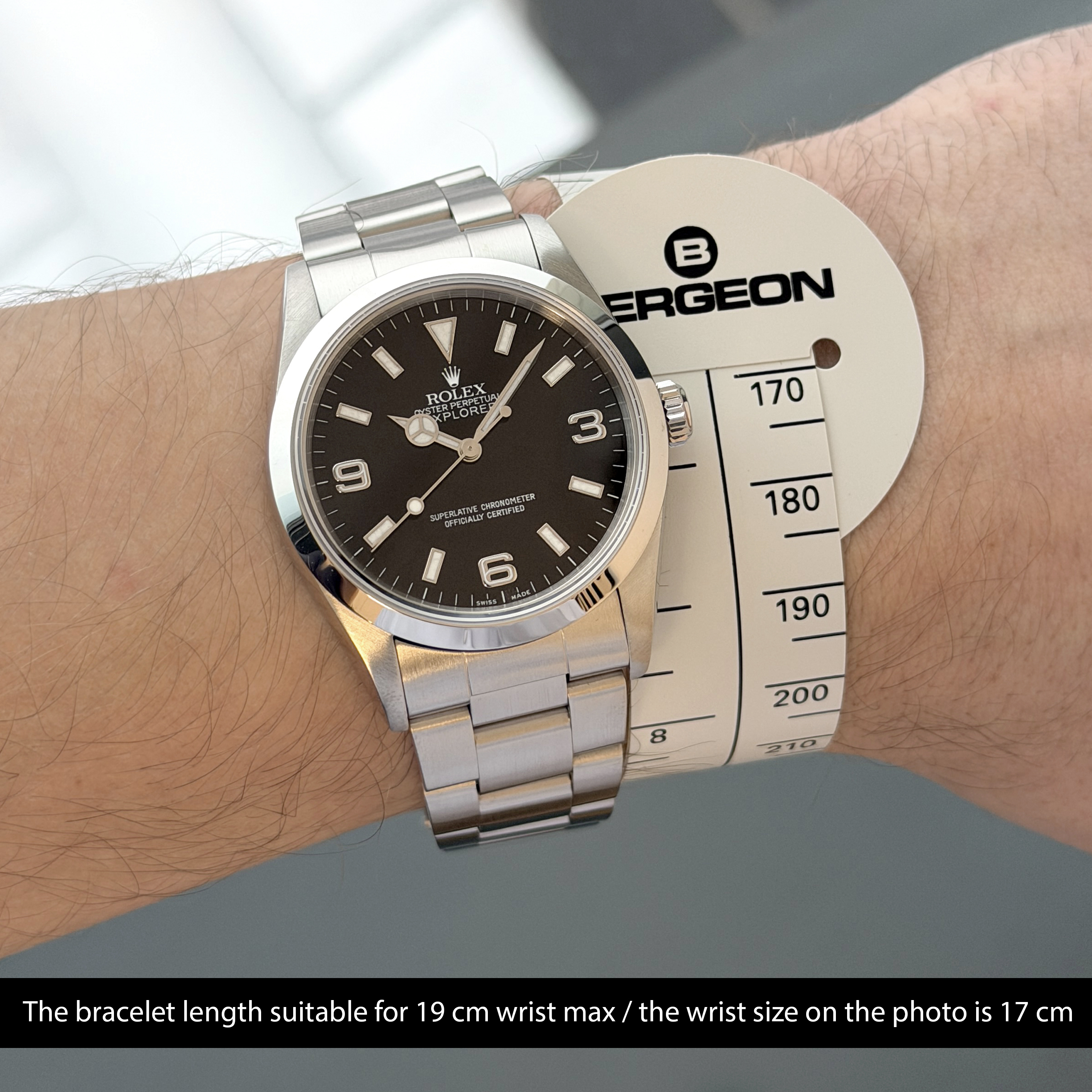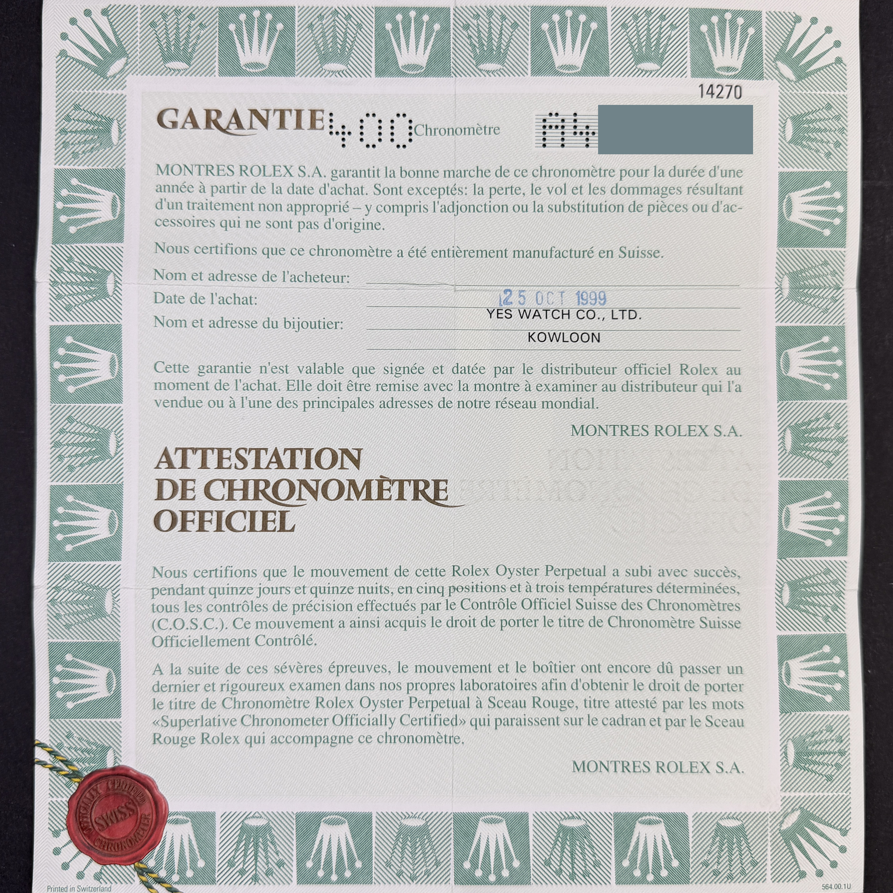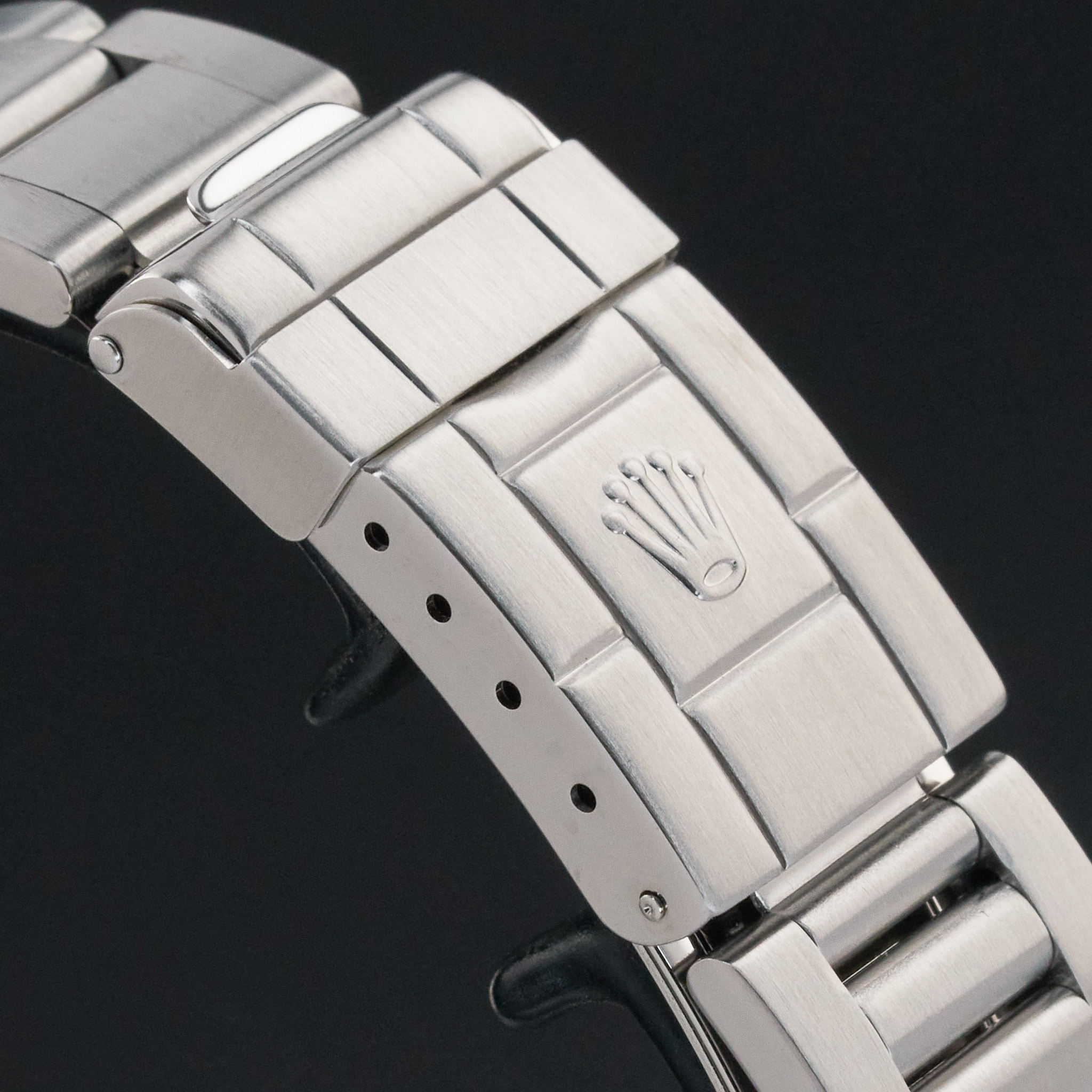 This Rolex Explorer 14270 features a Black Arabic dial and is crafted from stainless steel, with a production year of 1999.