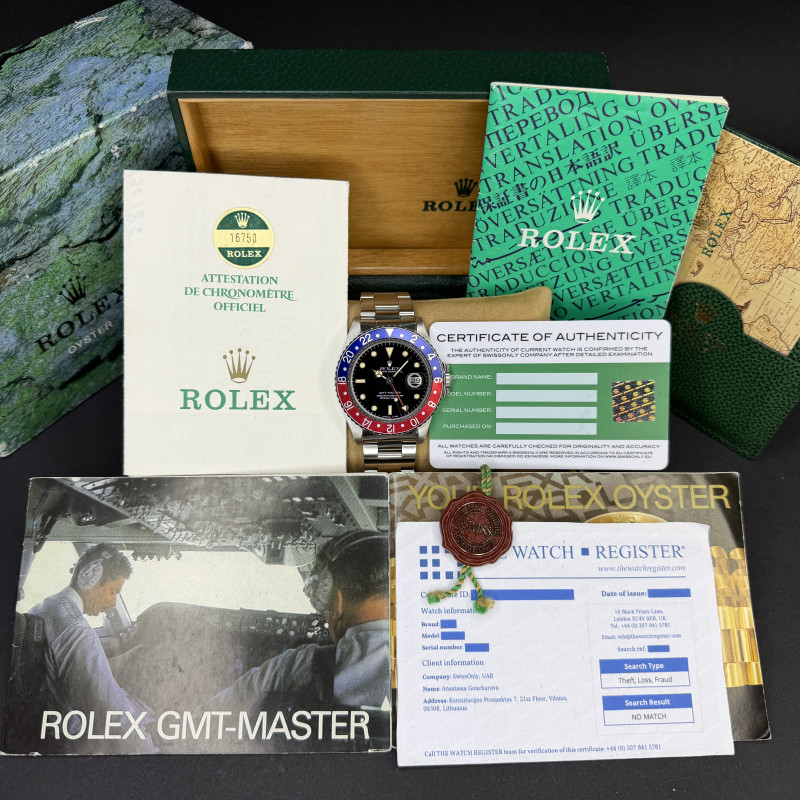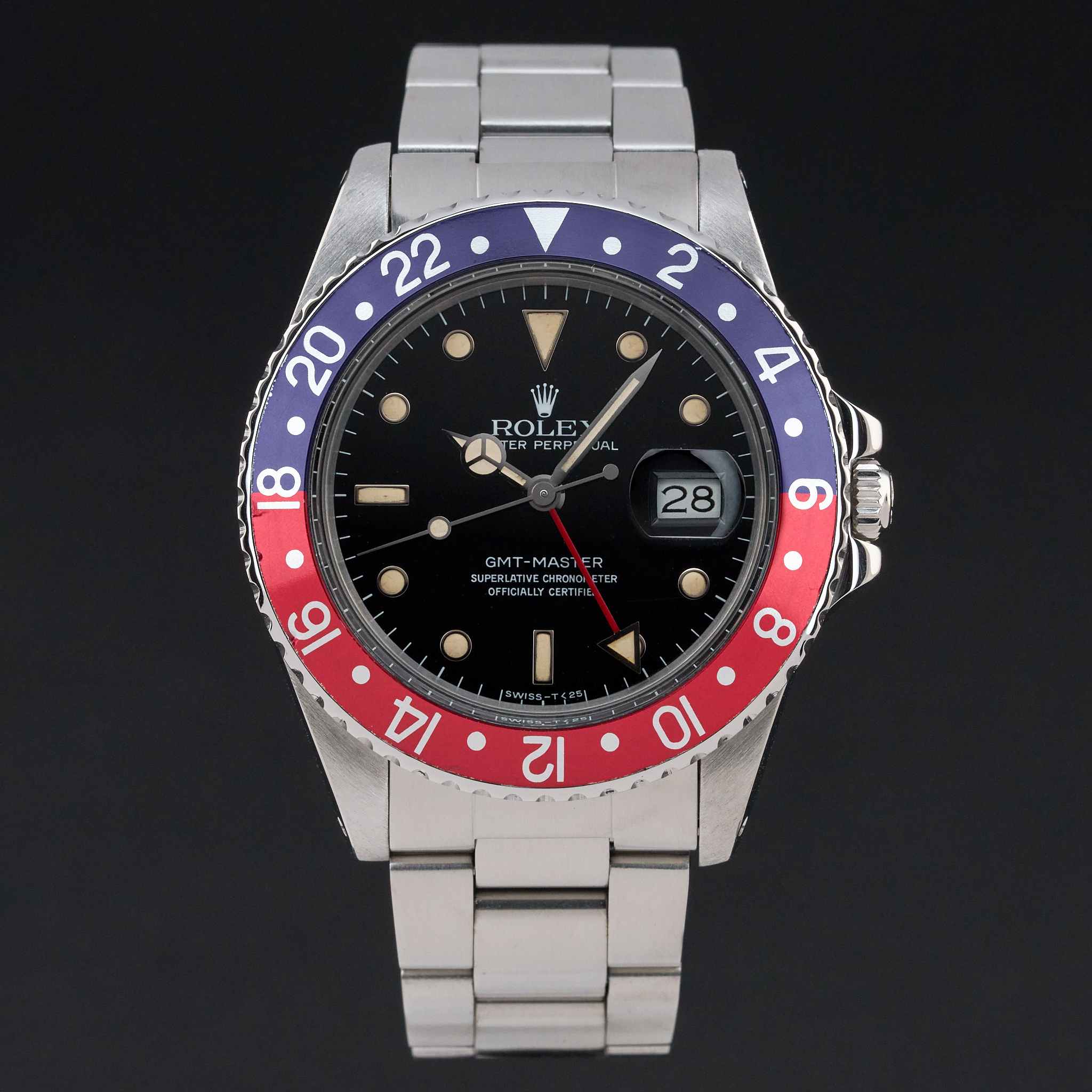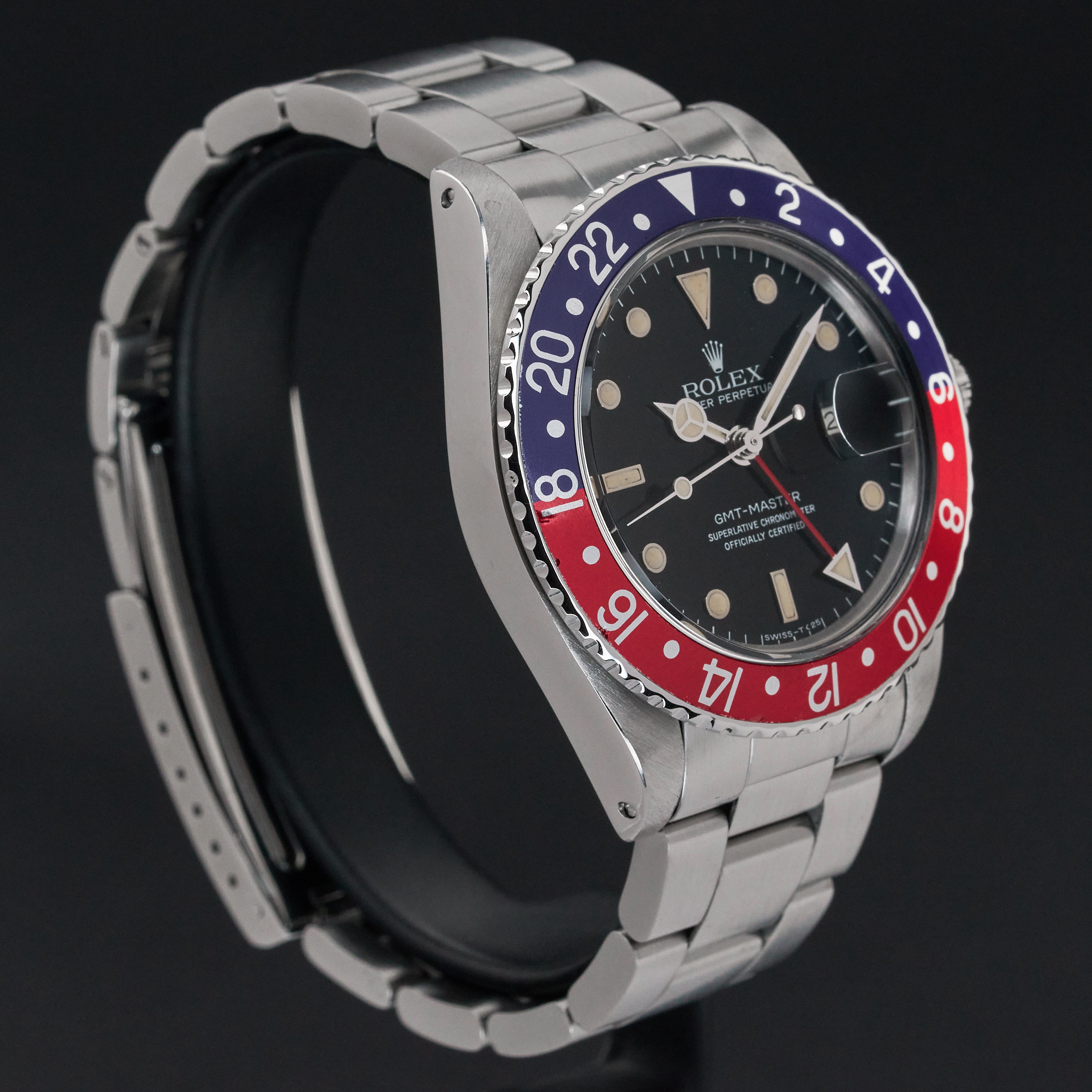 This Rolex GMT-Master 16750 features a Black dial, Pepsi bezel and is crafted from stainless steel, with a production year of 1985.