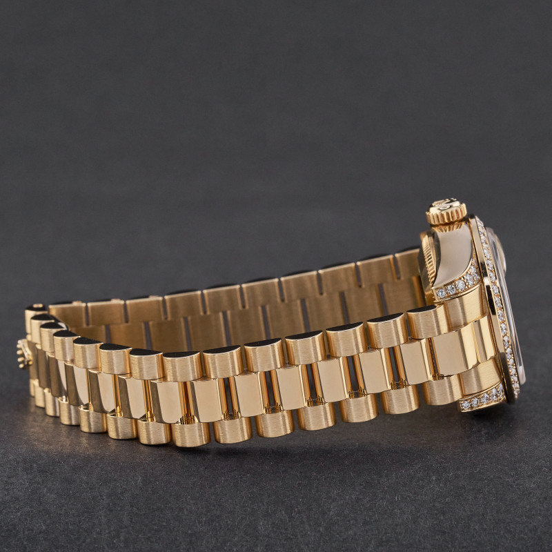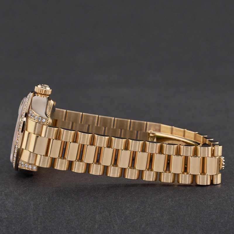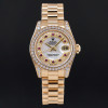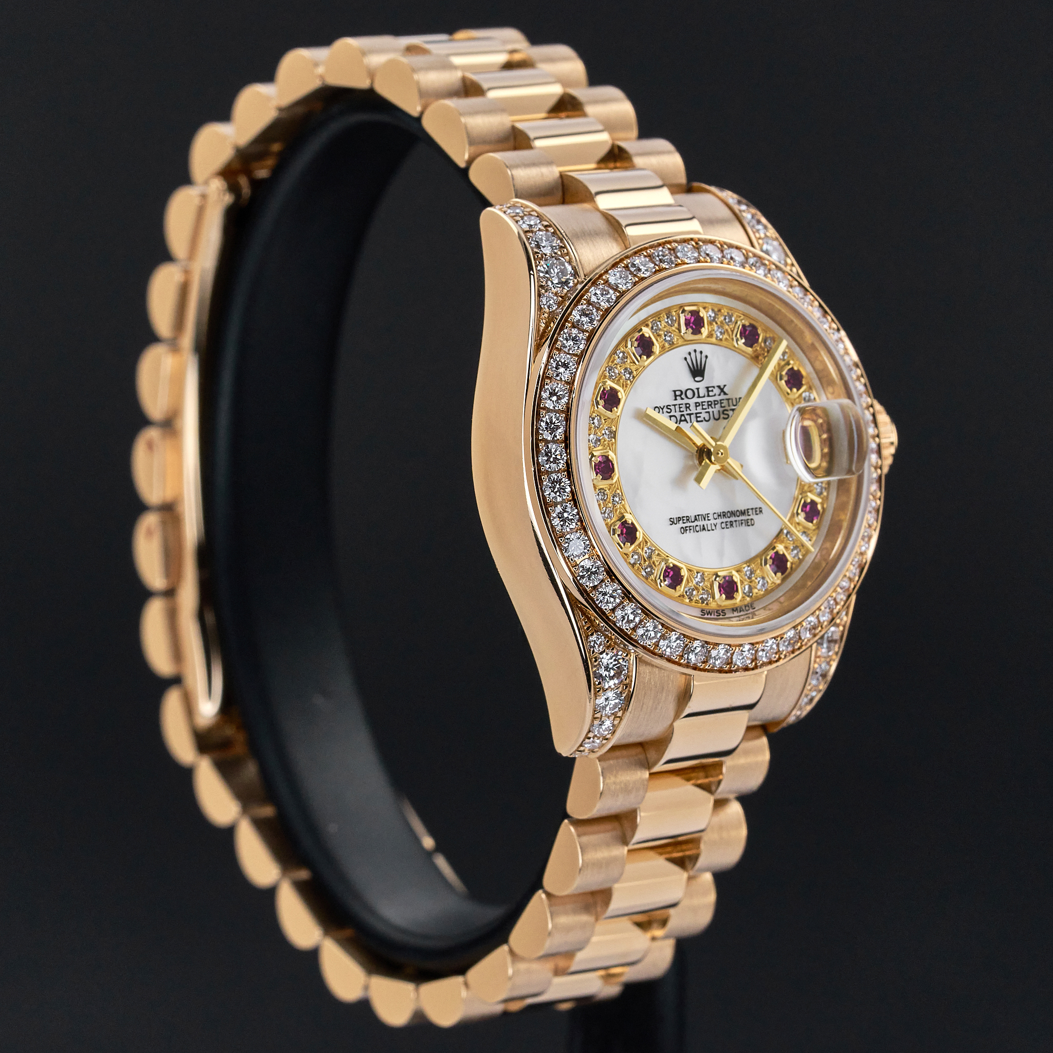 This Rolex Lady-Datejust 179158 features a Mother of pearl myriad ruby and diamond dial and is crafted from 18K yellow gold, with a production year of 2006.