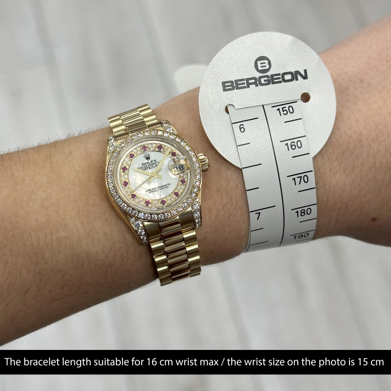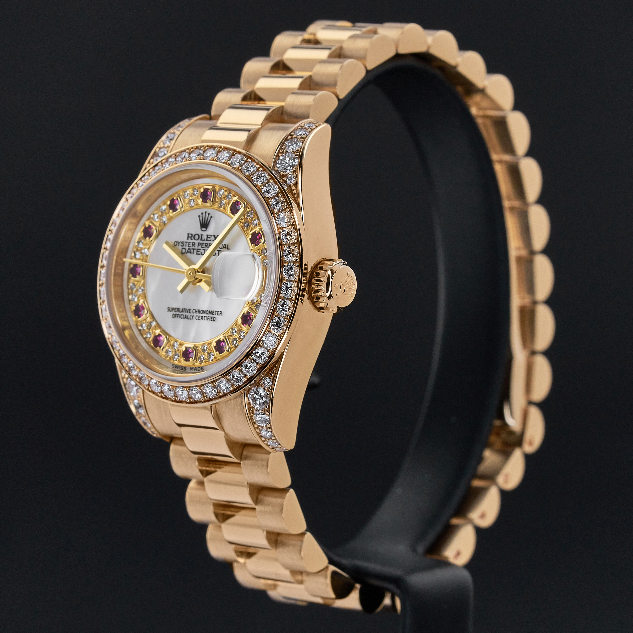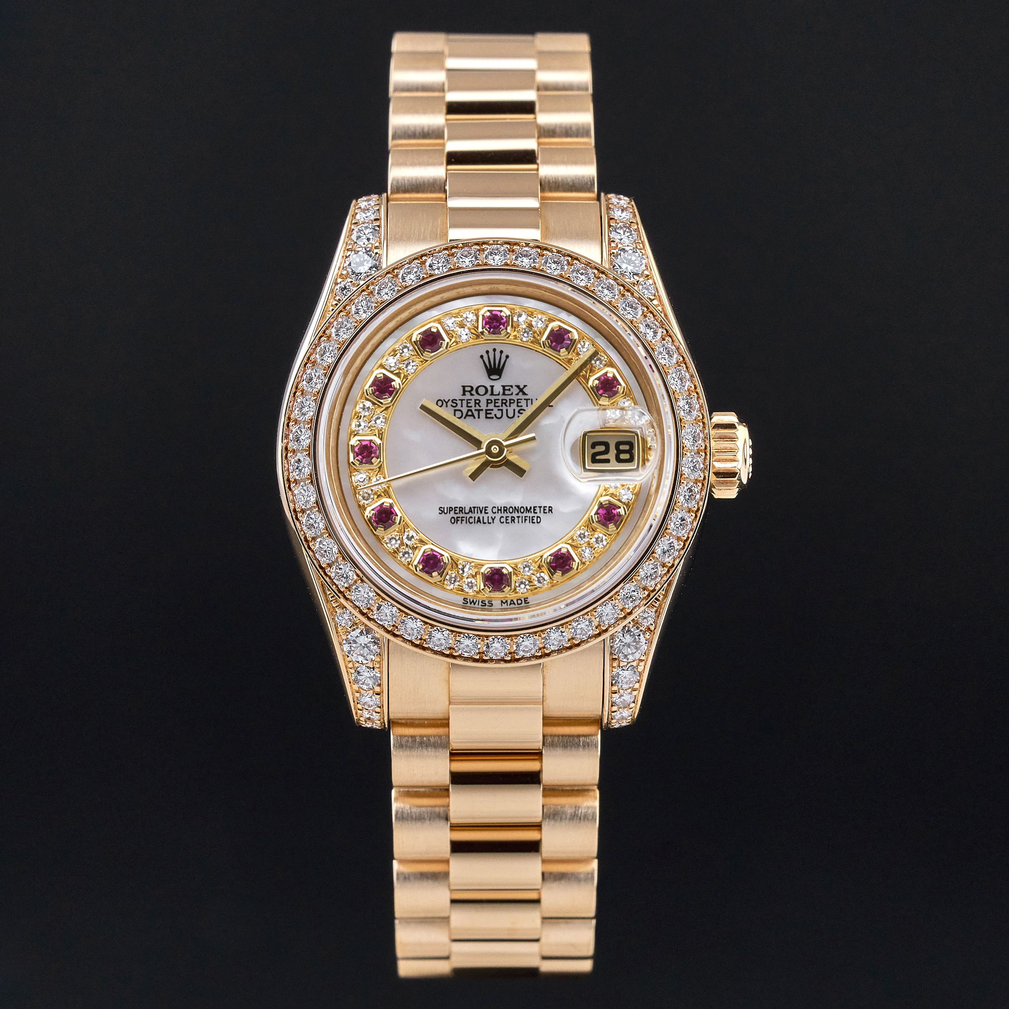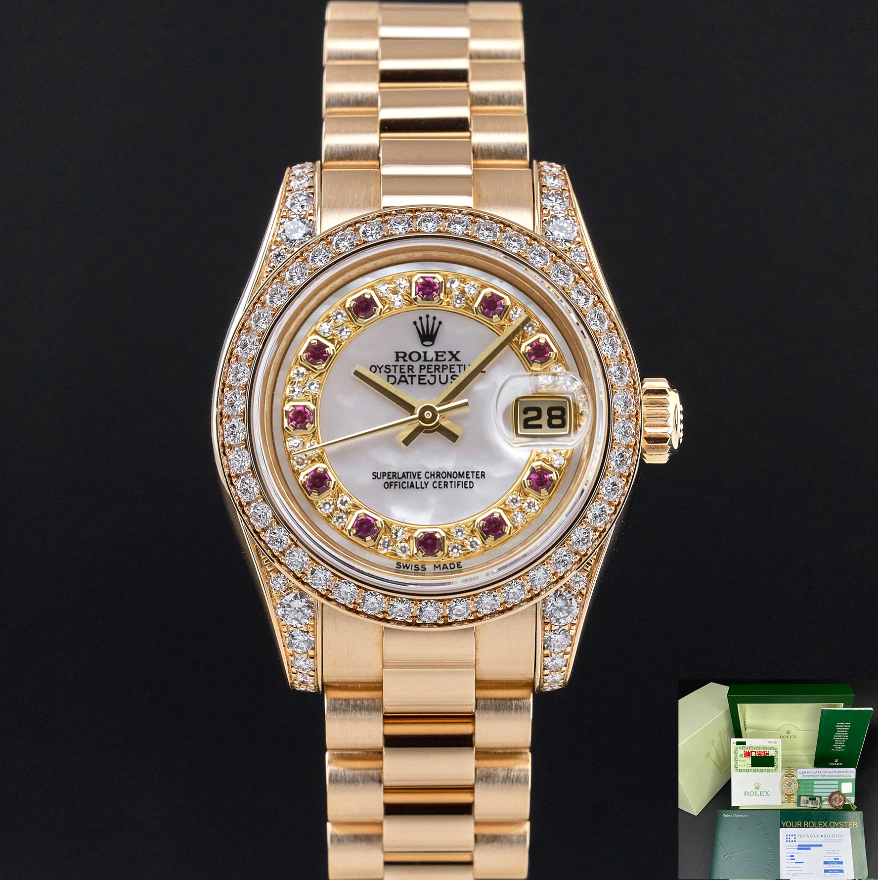 This particular Rolex Lady-Datejust introduced in 2006, is a dazzling expression of refinement and brilliance. Its mother-of-pearl dial is adorned with ruby hour markers and diamond accents, creating a harmonious blend of color, sparkle, and natural texture.