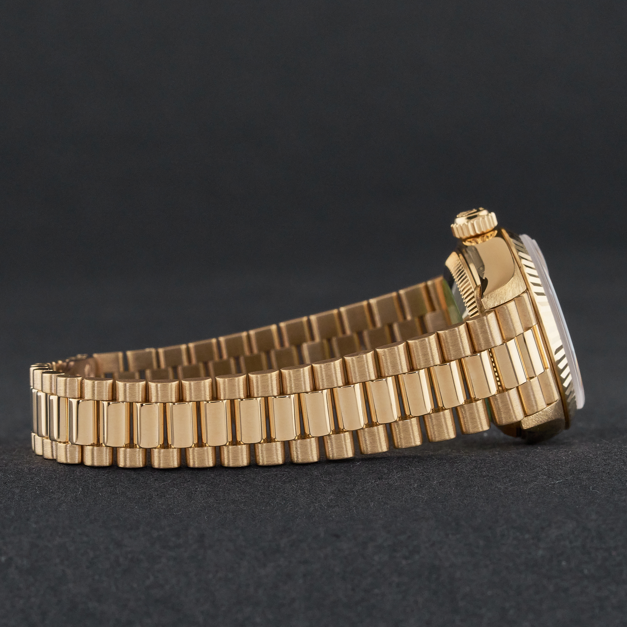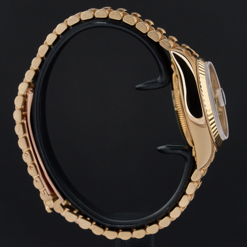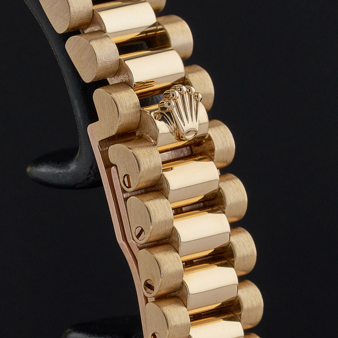 Bracelet: Original elegant 18k yellow gold "President" bracelet measuring 16,5 cm including watch case, signed "Rolex", with the “Rolex” logo clasp.