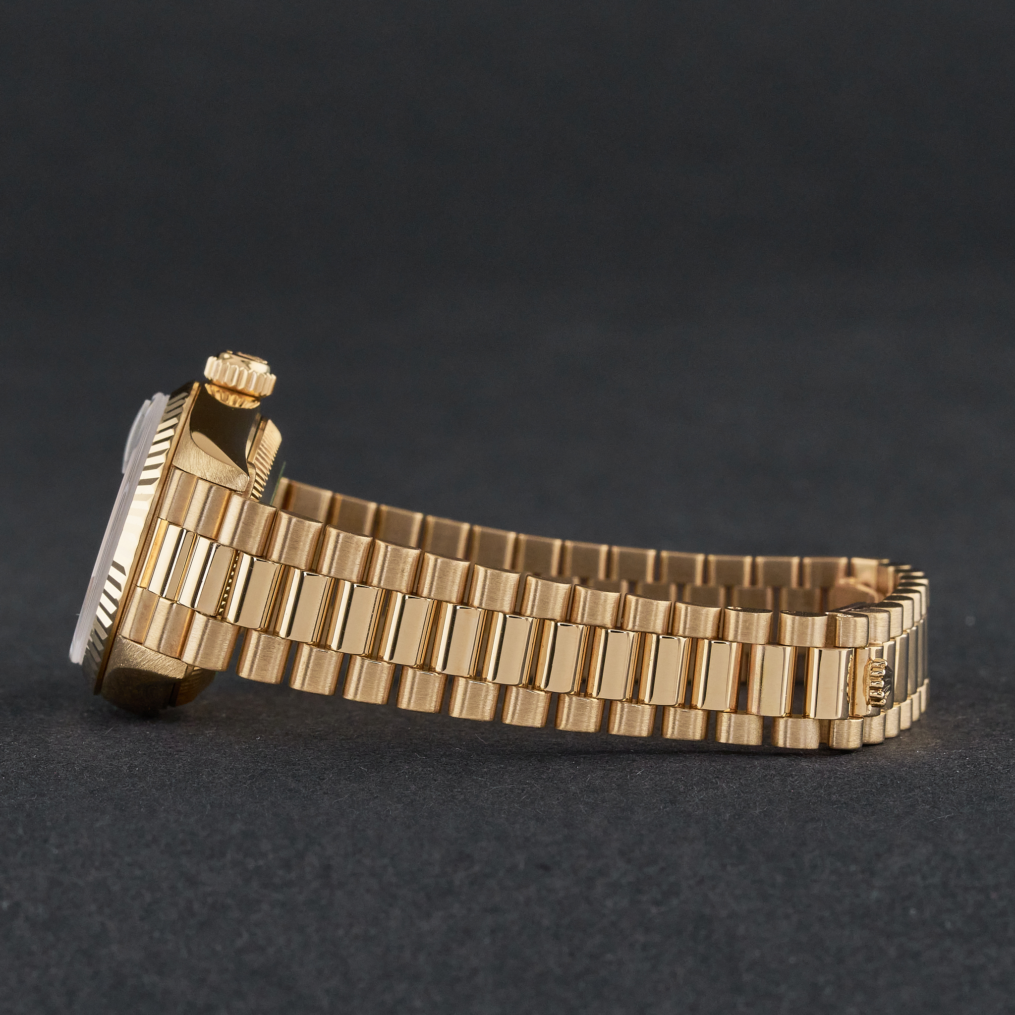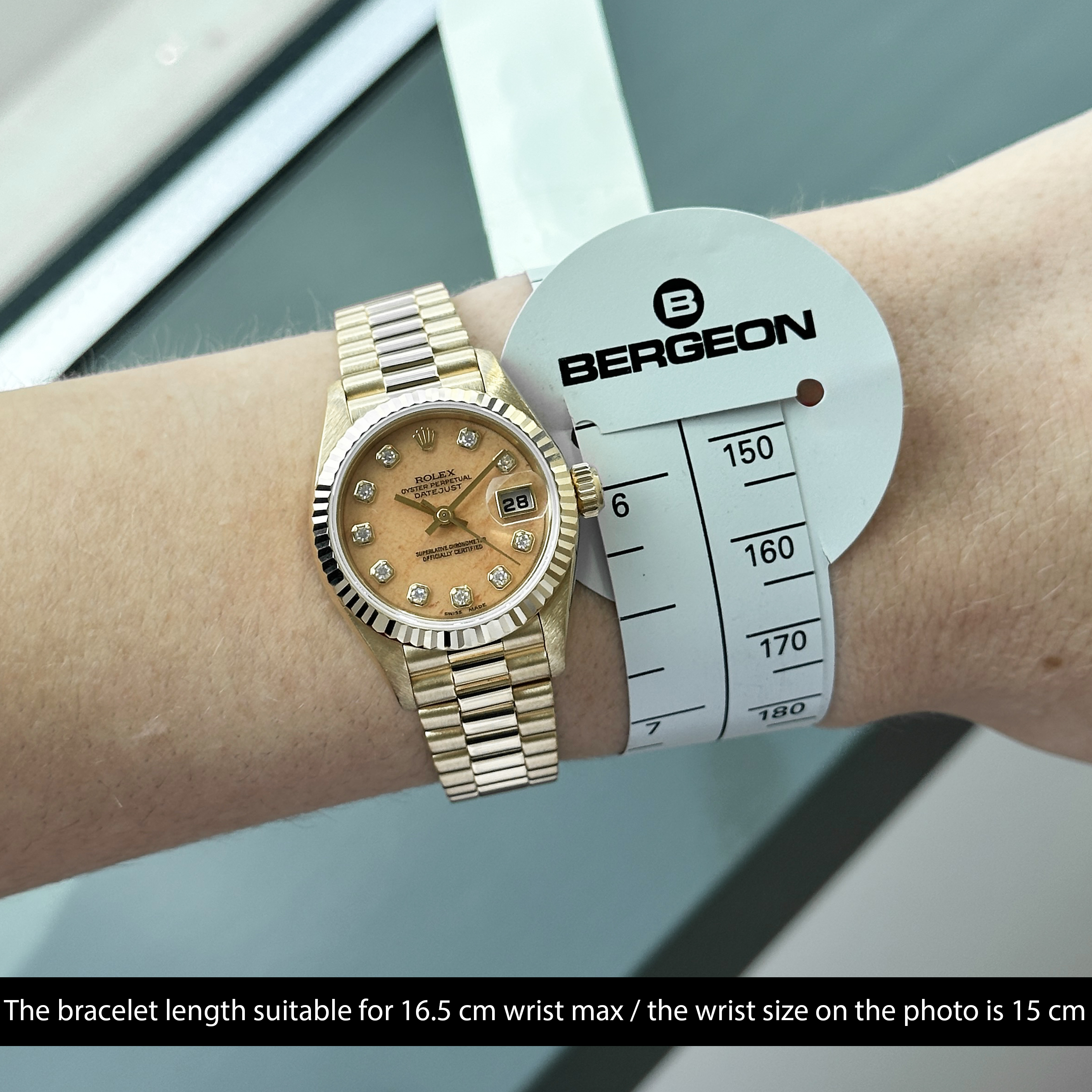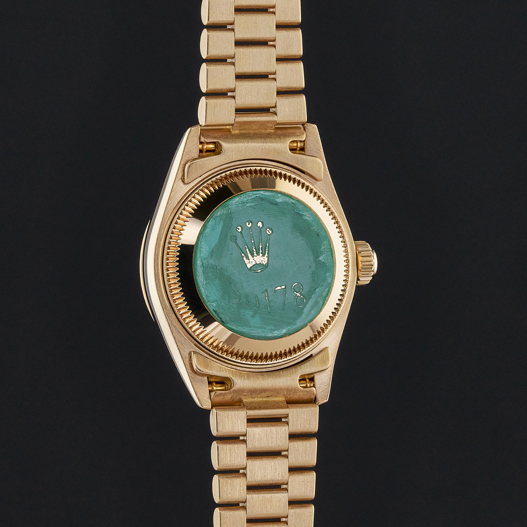 Bracelet: Original elegant 18k yellow gold "President" bracelet measuring 16,5 cm including watch case, signed "Rolex", with the “Rolex” logo clasp.