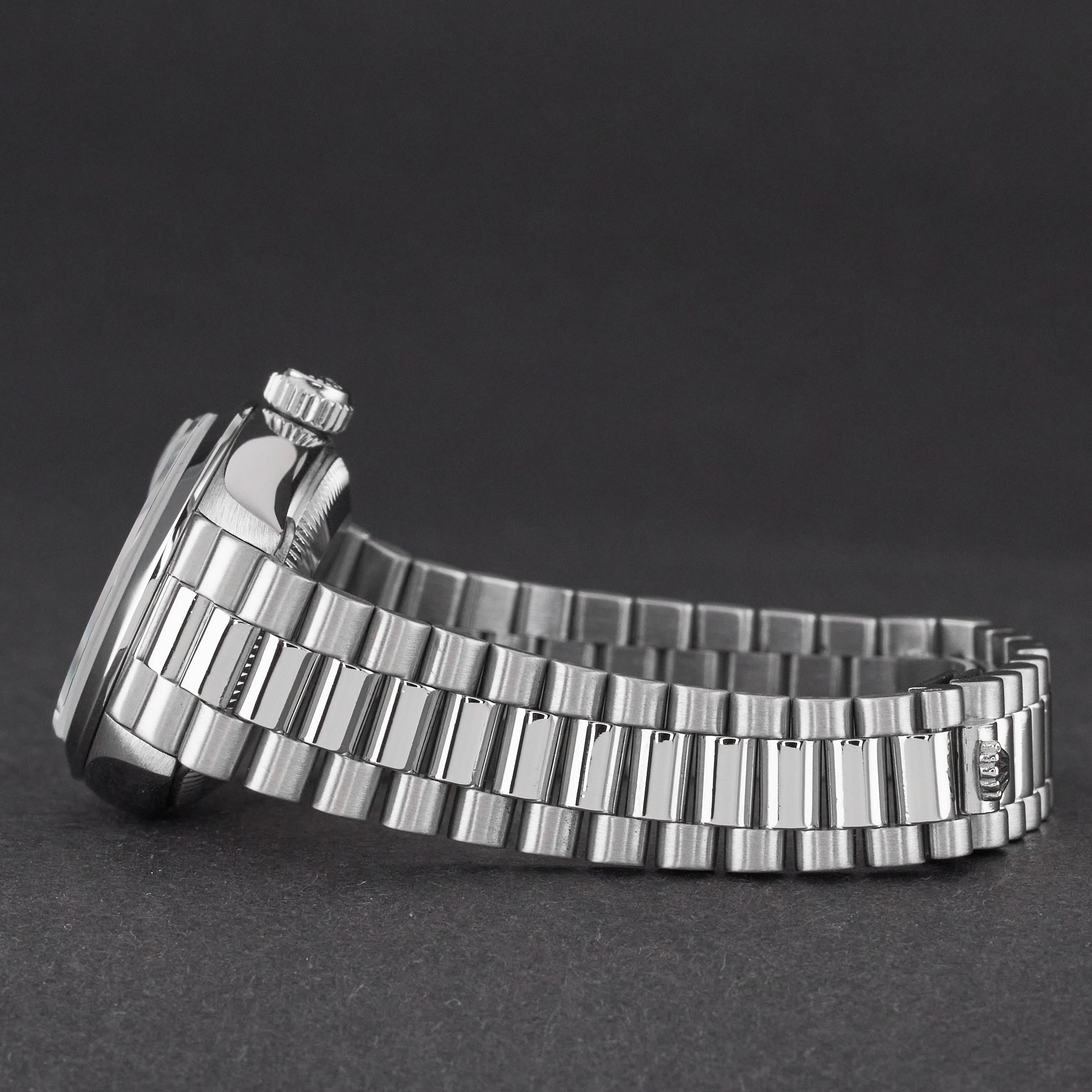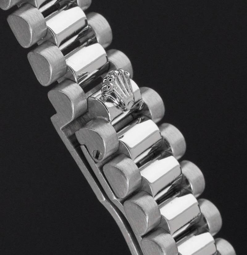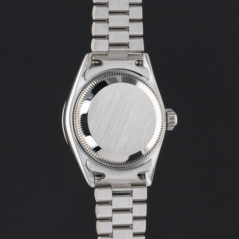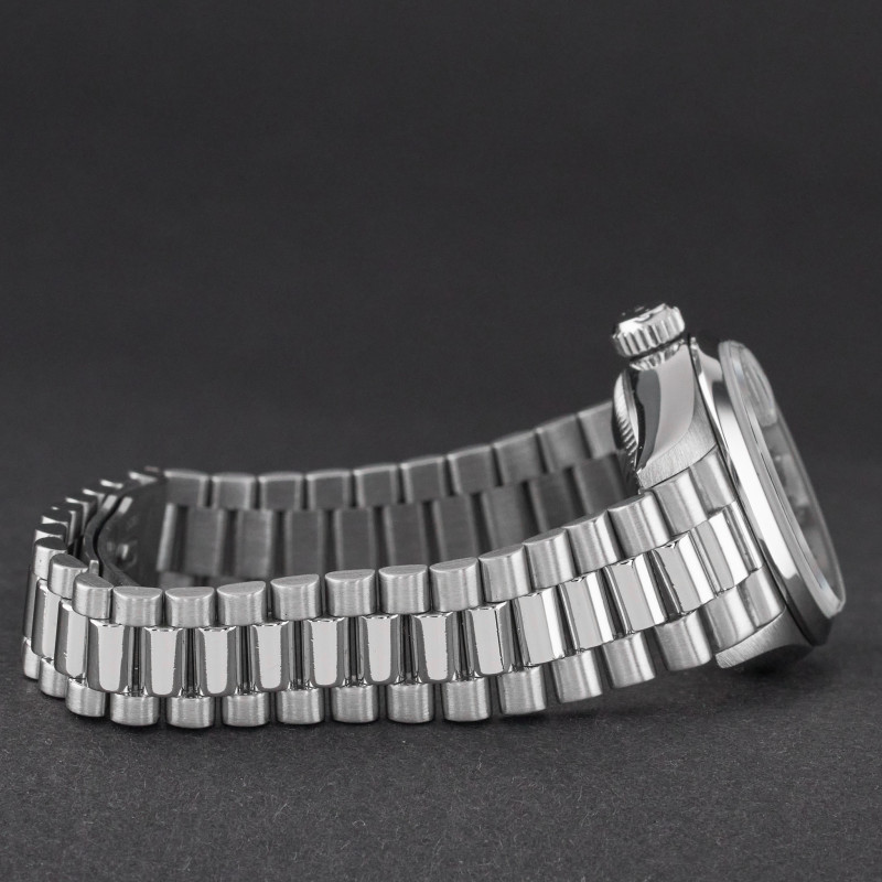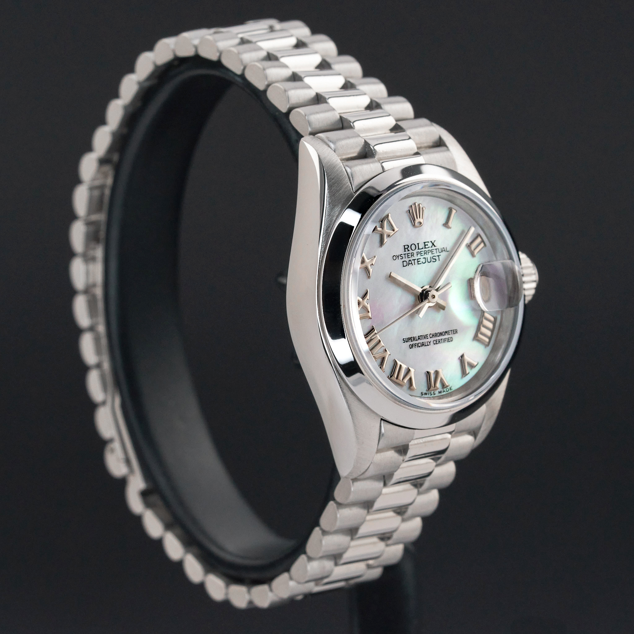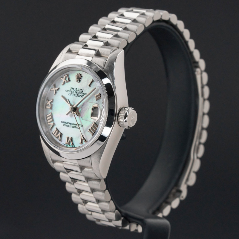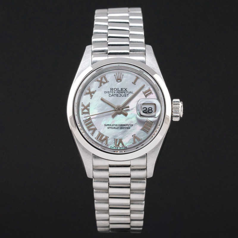 This Rolex Lady-Datejust 69166 features a Tahitian Mother of Pearl Roman dial and is crafted from platinum, with a production year of 1989.