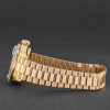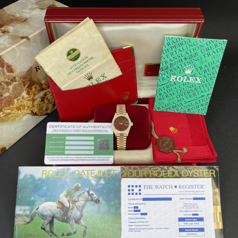 This particular Rolex Lady-Datejust introduced in 1987, stands out with it's rare mahogany wood dial – a distinctive feature that brings organic warmth and individuality to this elegant timepiece. The golden tones of the dial are beautifully complemented by the solid 18k yellow gold case and President bracelet, embodying classic Rolex refinement.