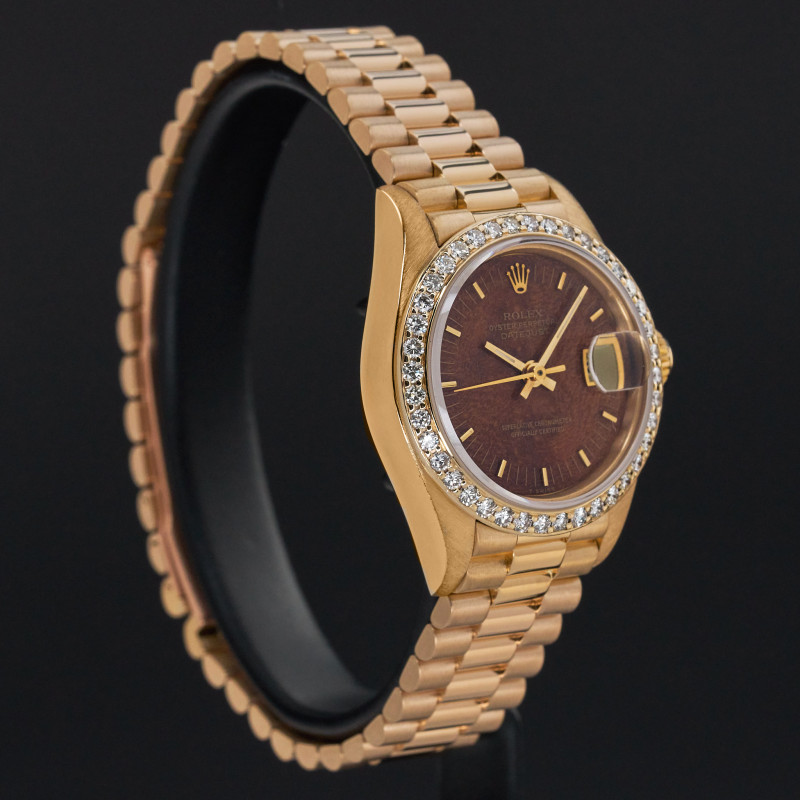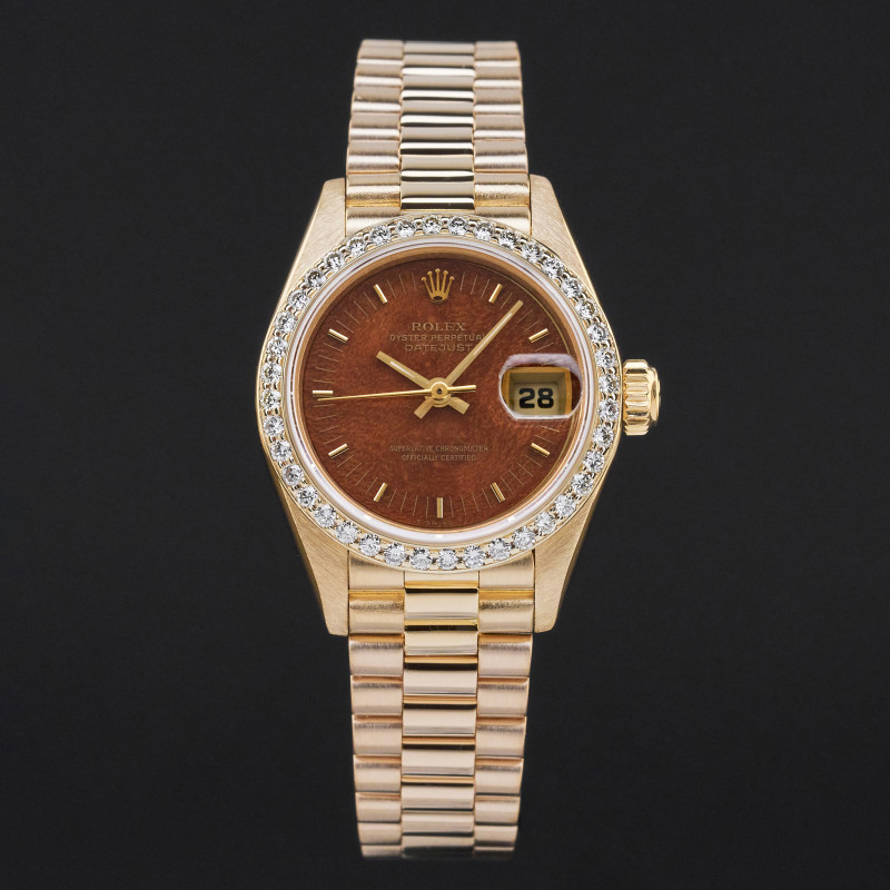 This Rolex Lady-Datejust 69178 features an Mahogany wood dial and is crafted from 18K yellow gold, with a production year of 1987. Dial, bezel, case are original, but have aftermarket diamond setting.