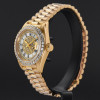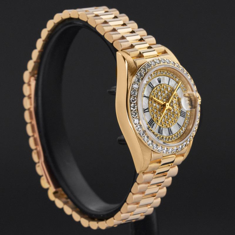 This particular Rolex Lady Datejust introduced in 1987, is a brilliant expression of luxury and refinement. Crafted in 18k yellow gold, it radiates timeless prestige. The mother-of-pearl pavé dial, adorned with Roman numerals and diamond accents, creates a captivating interplay of texture and sparkle, elevating the watch into a true statement piece.