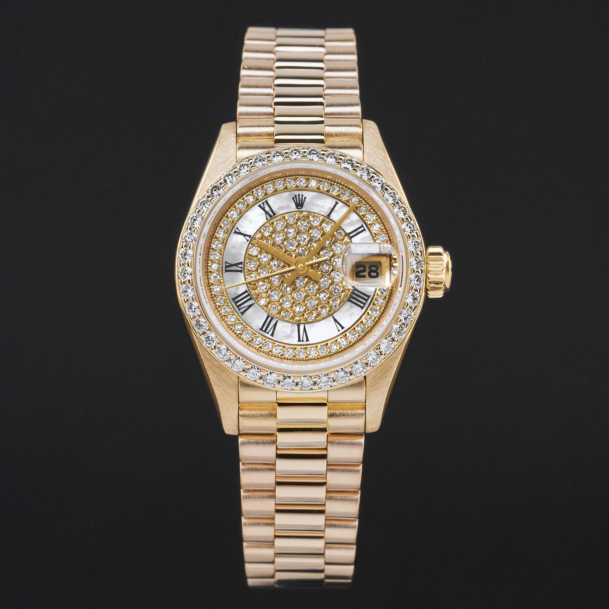 This Rolex Lady-Datejust 69178 features a Mother of pearl pave Roman diamond dial and is crafted from 18K yellow gold, with a production year of 1987. Dial, bezel, case are original, but have aftermarket diamond setting.
