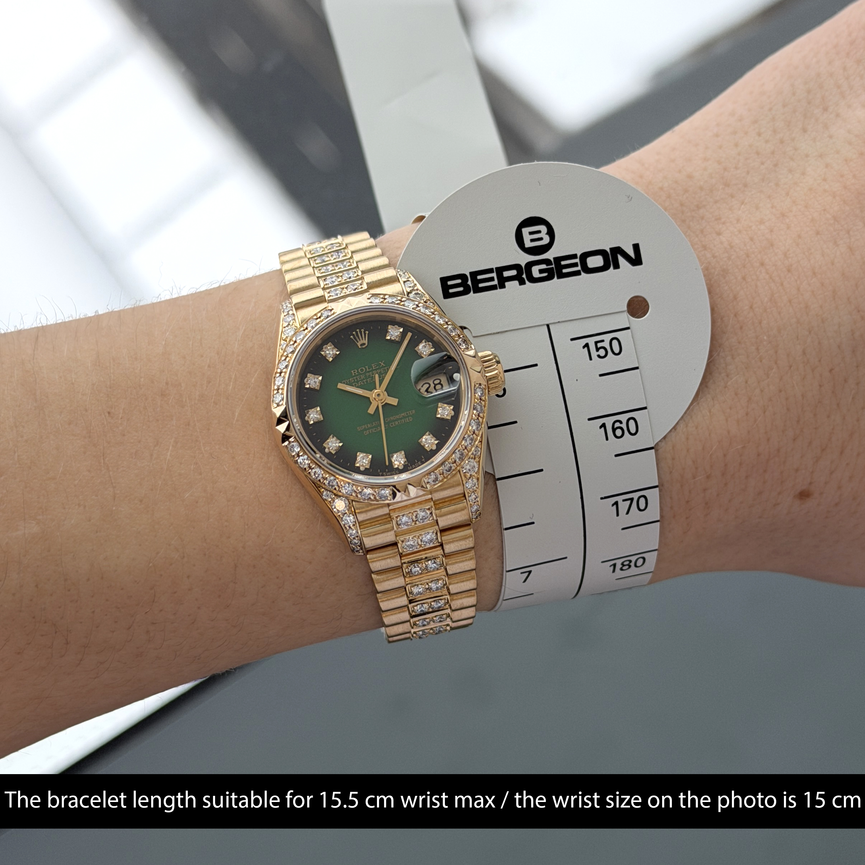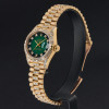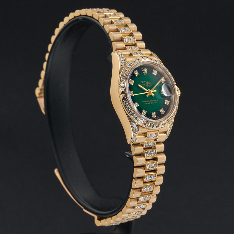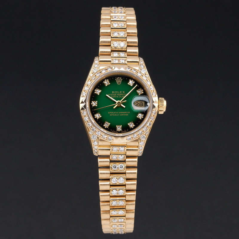 This Rolex Lady-Datejust 69178 features a Green vignette small diamond dial and is crafted from 18K yellow gold, with a production year of 1991. Bezel, case and bracelet are original, but have aftermarket diamond setting.