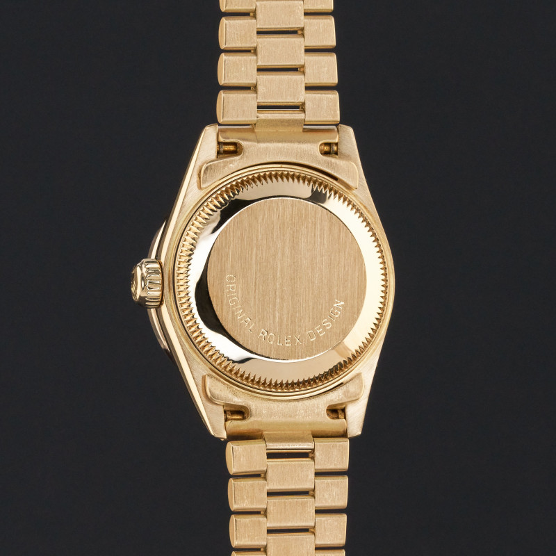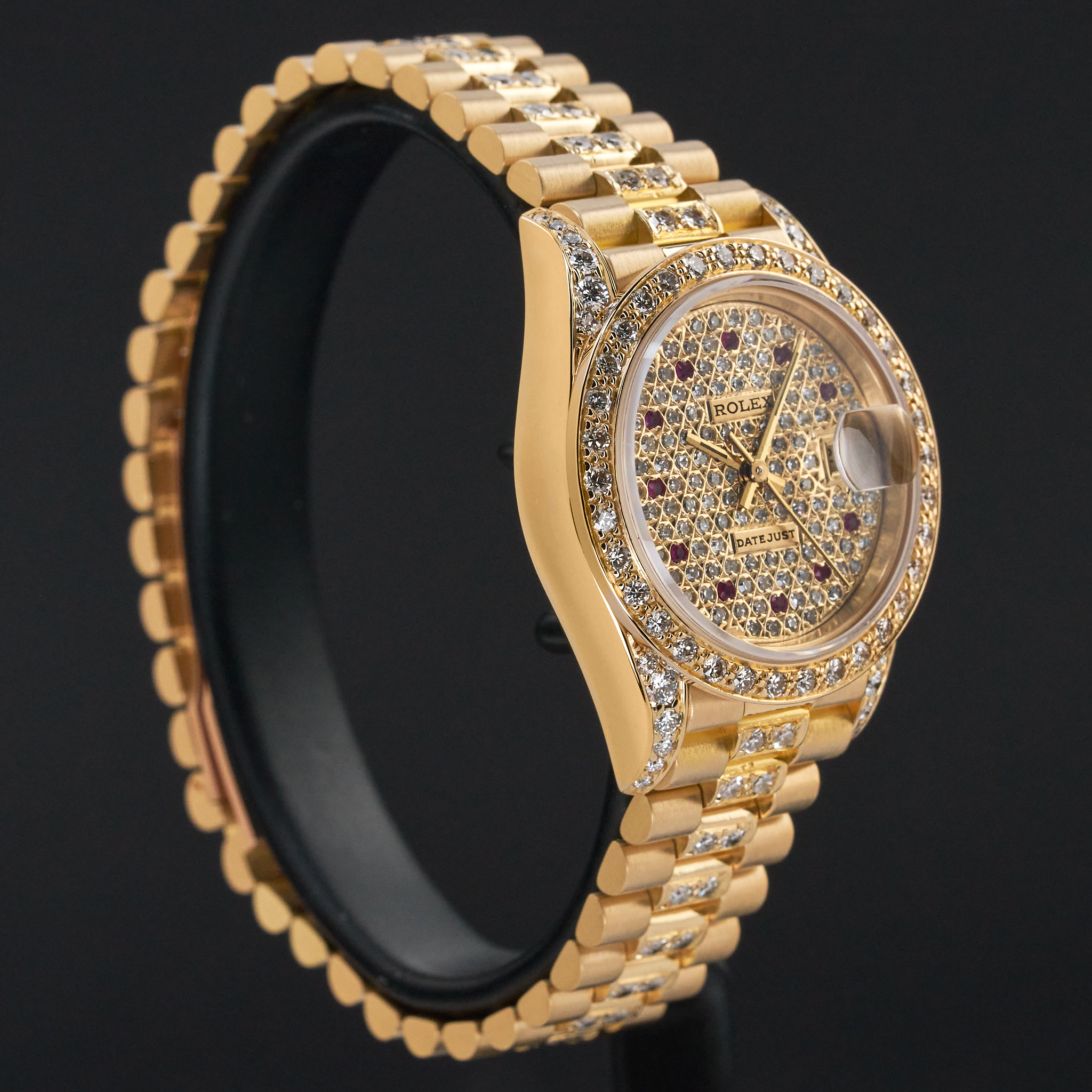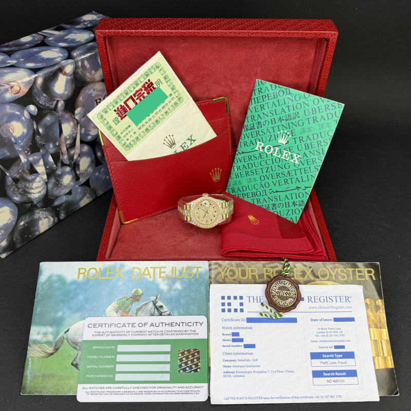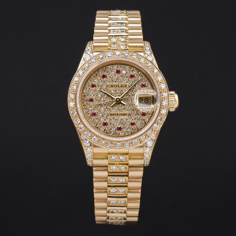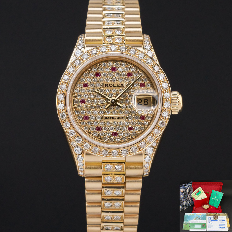This Rolex Lady-Datejust 69178 features a Pave ruby diamond dial and is crafted from 18K yellow gold, with a production year of 1991. Dial, bezel, case and bracelet are original, but have aftermarket diamond setting.
