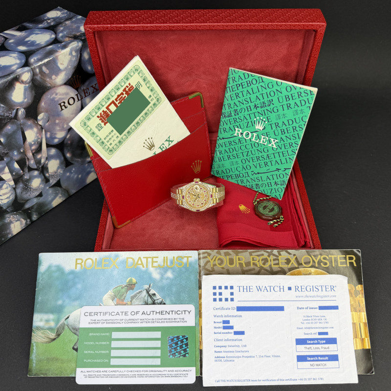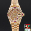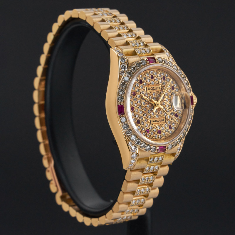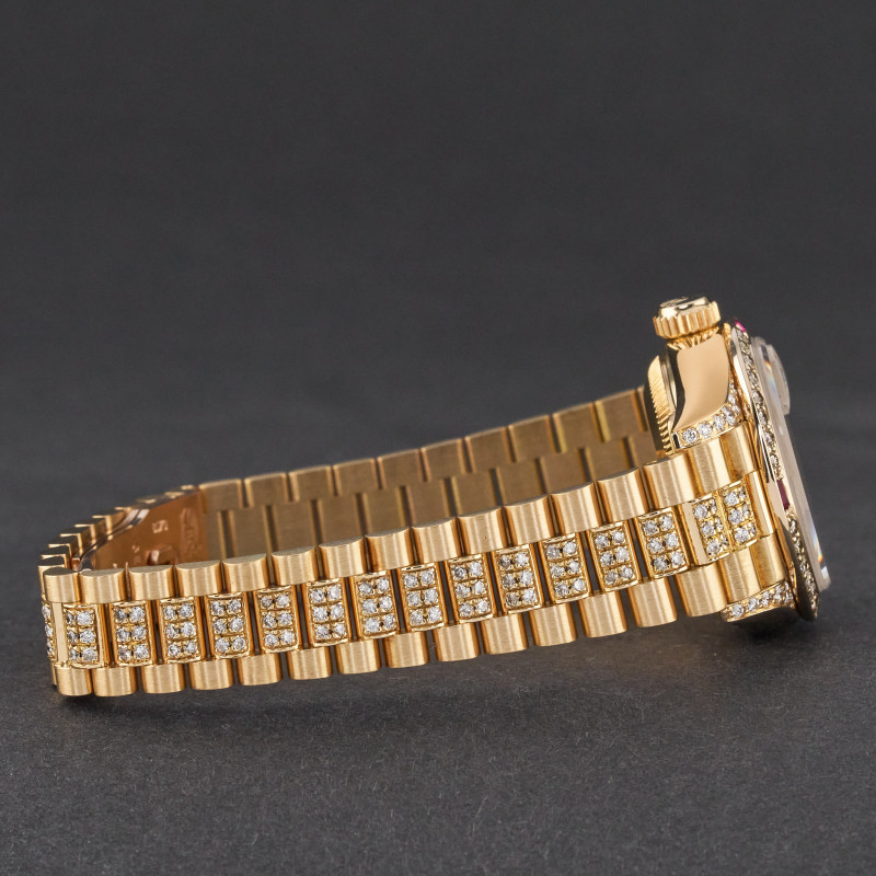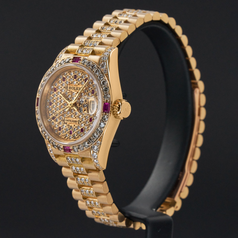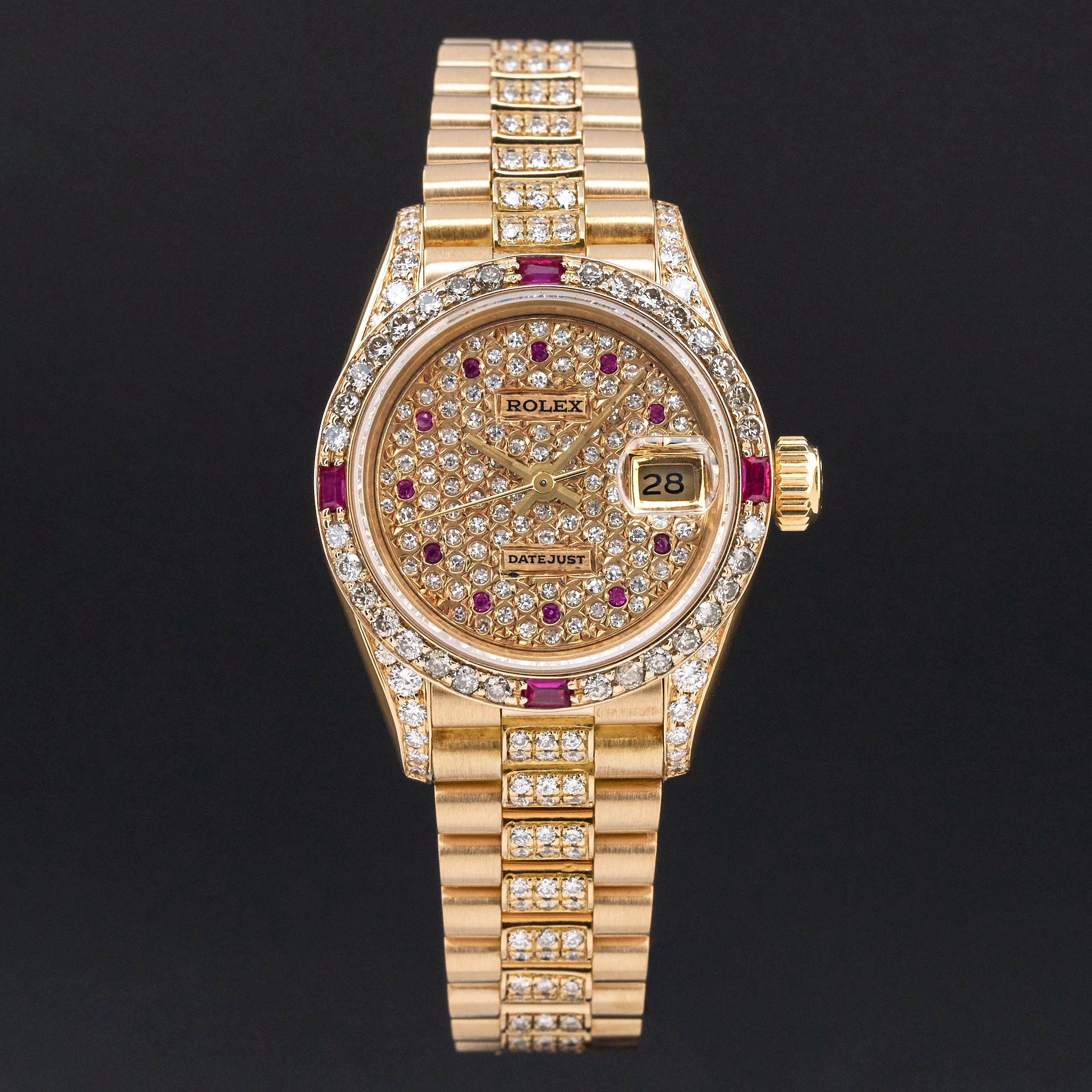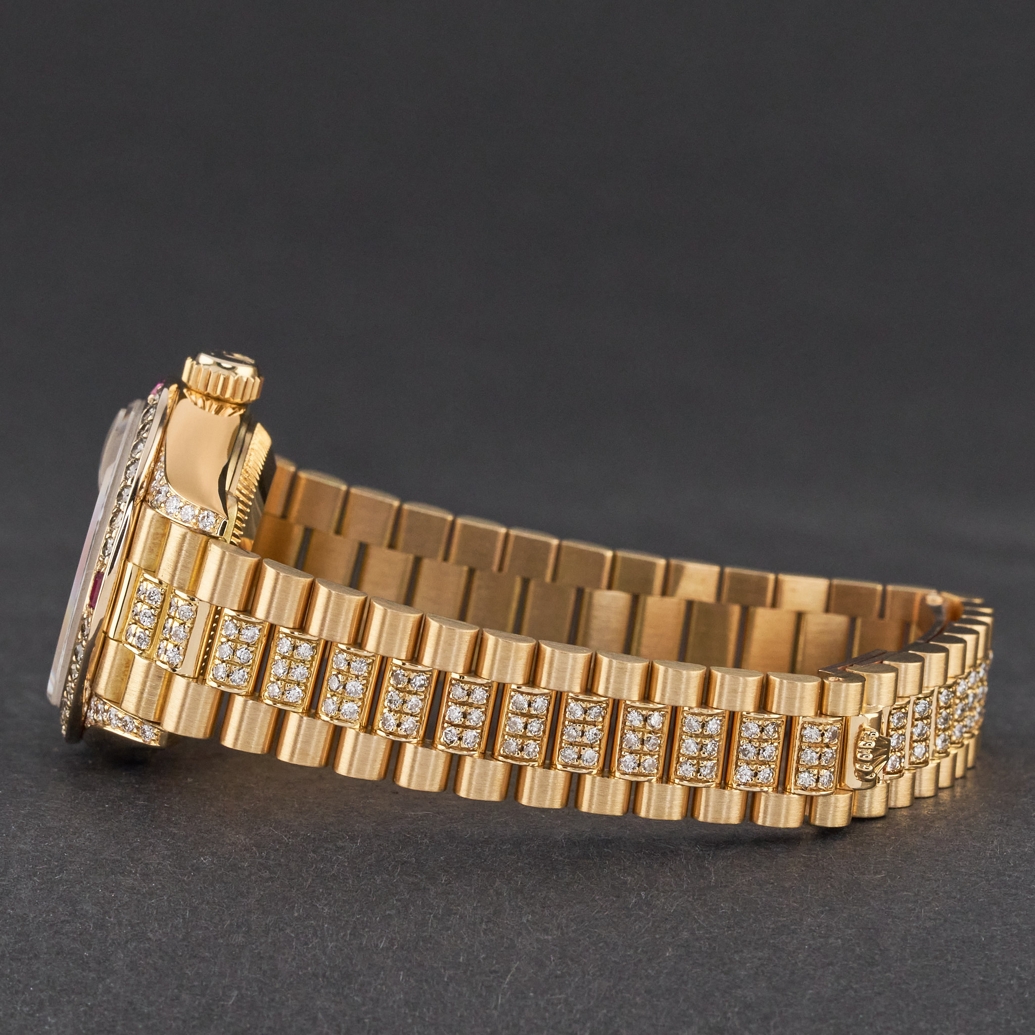 This Rolex Lady-Datejust 69178 features a Pave ruby diamond dial and is crafted from 18K yellow gold, with a production year of 1991. Dial, bezel, case and bracelet are original, but have aftermarket diamond setting.
