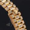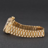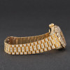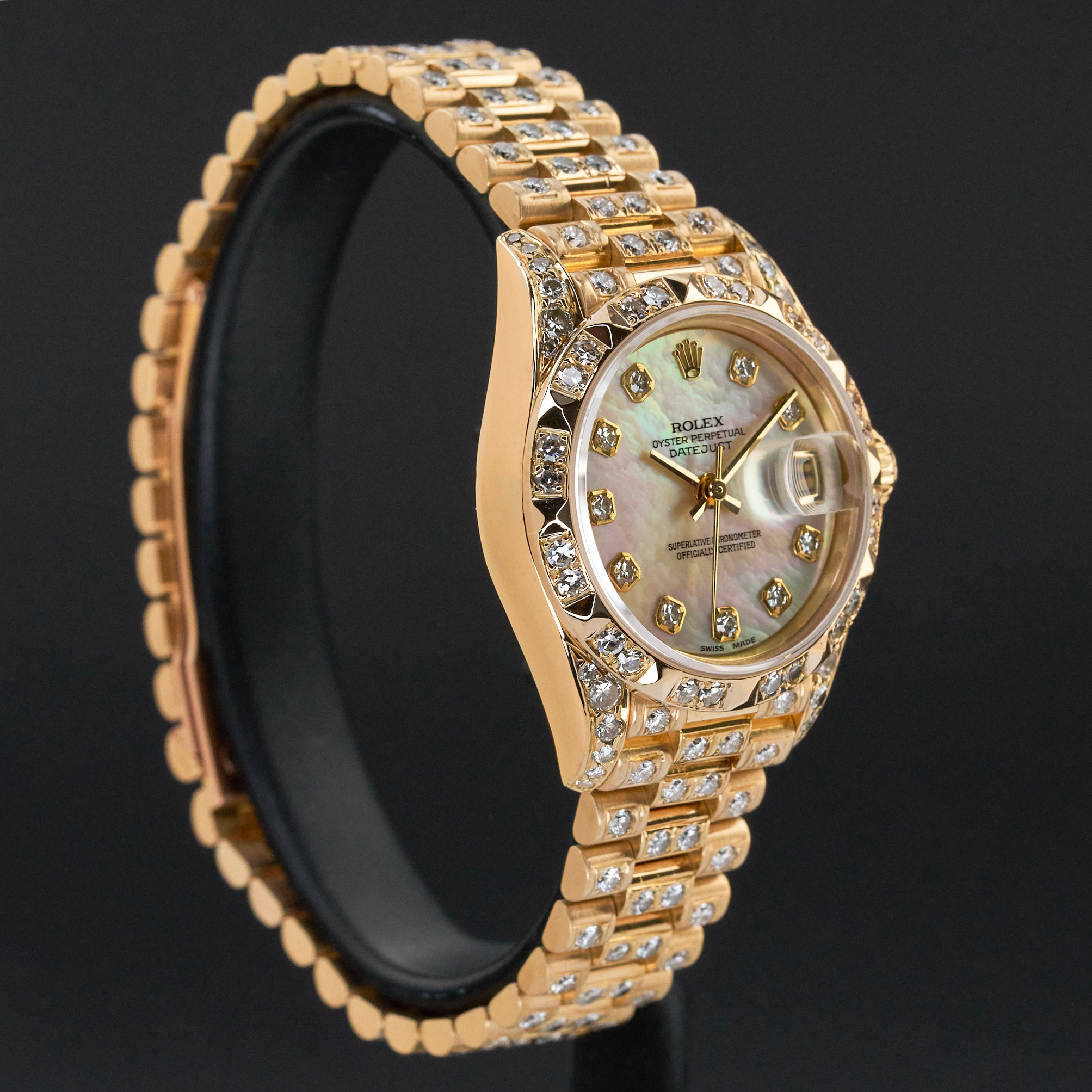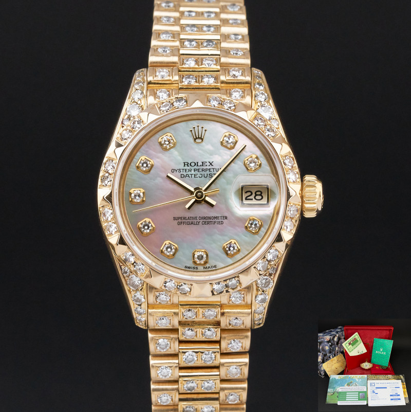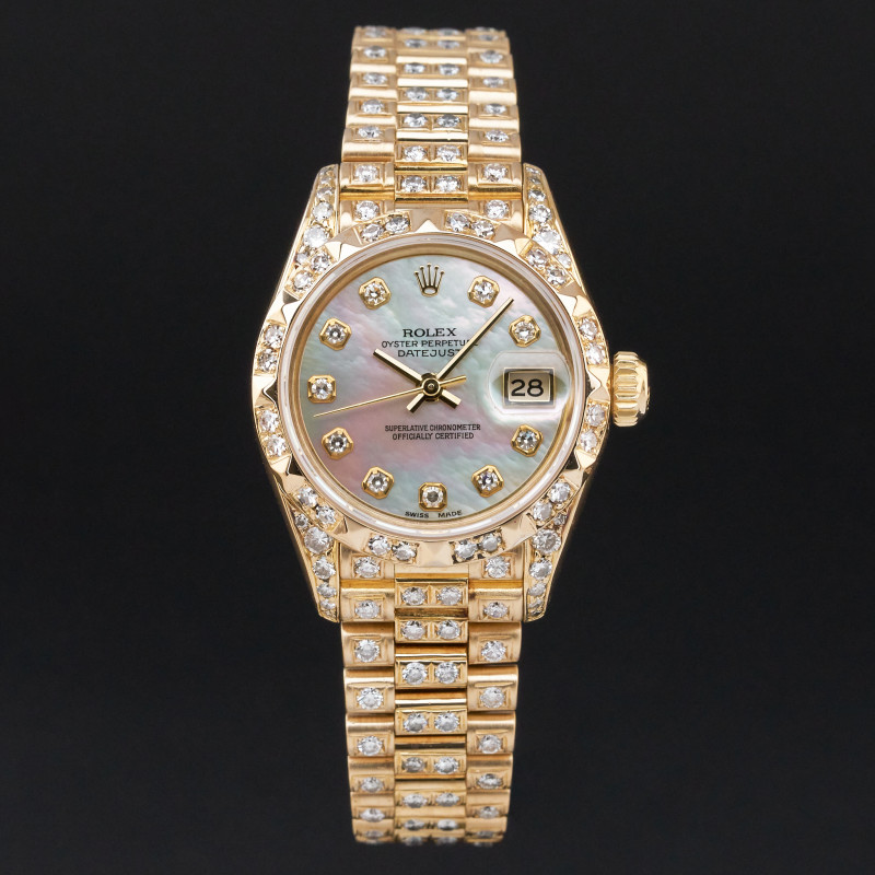 This Rolex Lady-Datejust 69178 features a Mother of pearl big diamond dial and is crafted from 18K yellow gold, with a production year of 1993. Bezel, case and bracelet are original, but have aftermarket diamond setting.