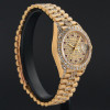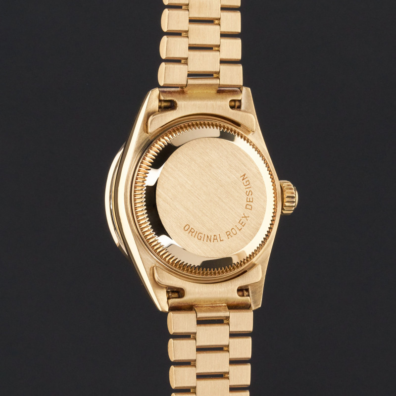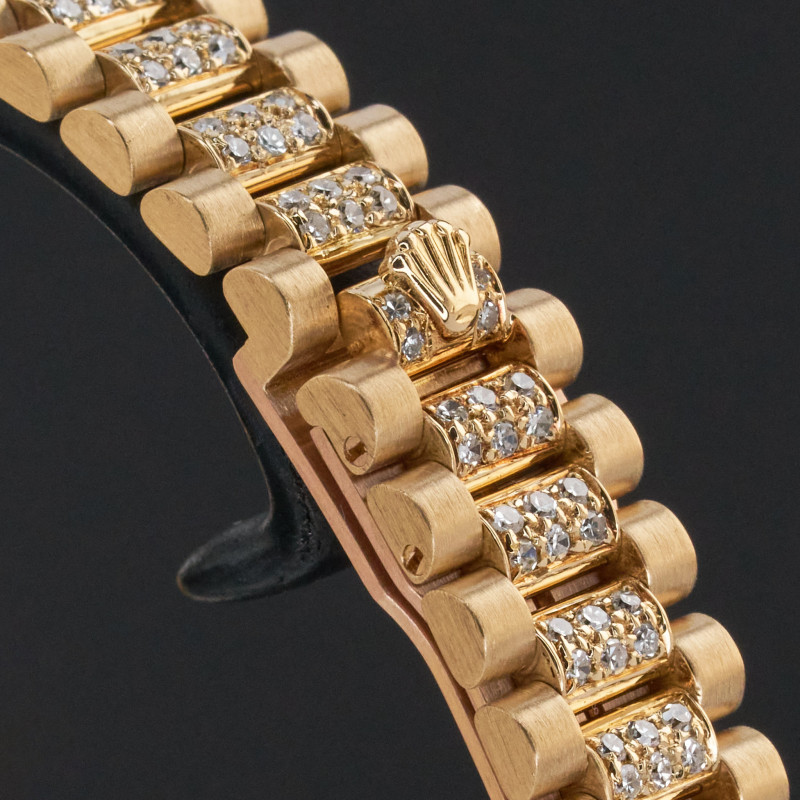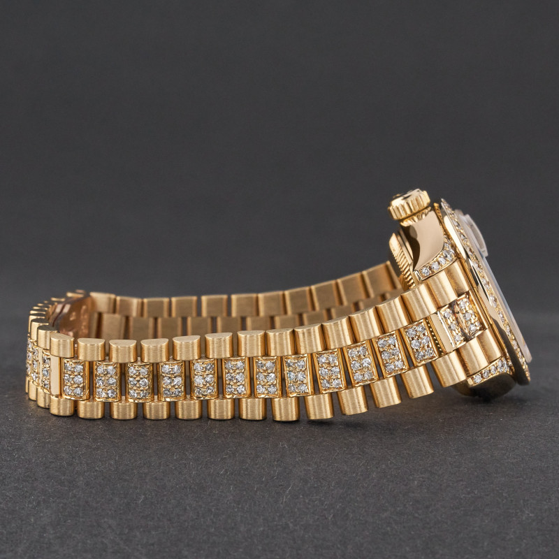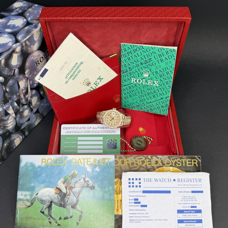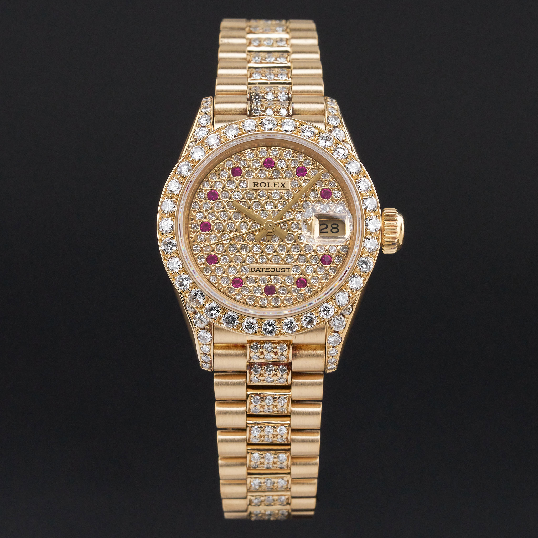 This Rolex Lady-Datejust 69178 features a Pave ruby diamond dial and is crafted from 18K yellow gold, with a production year of 1995. Dial, bezel, case and bracelet are original, but have aftermarket diamond setting.