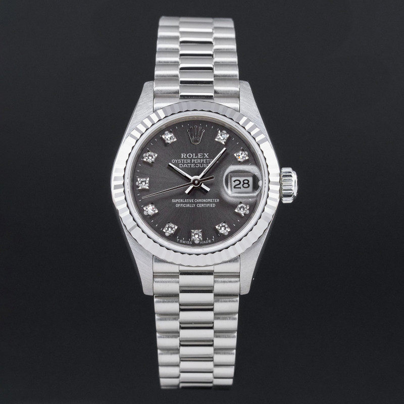 This Rolex Lady-Datejust 69179 features a Grey small diamond dial and is crafted from 18K white gold, with a production year of 1988.