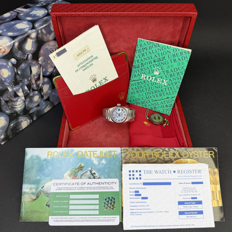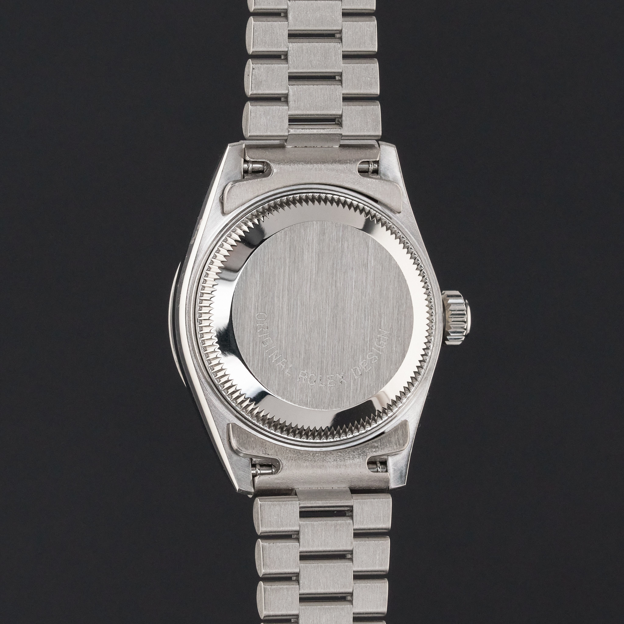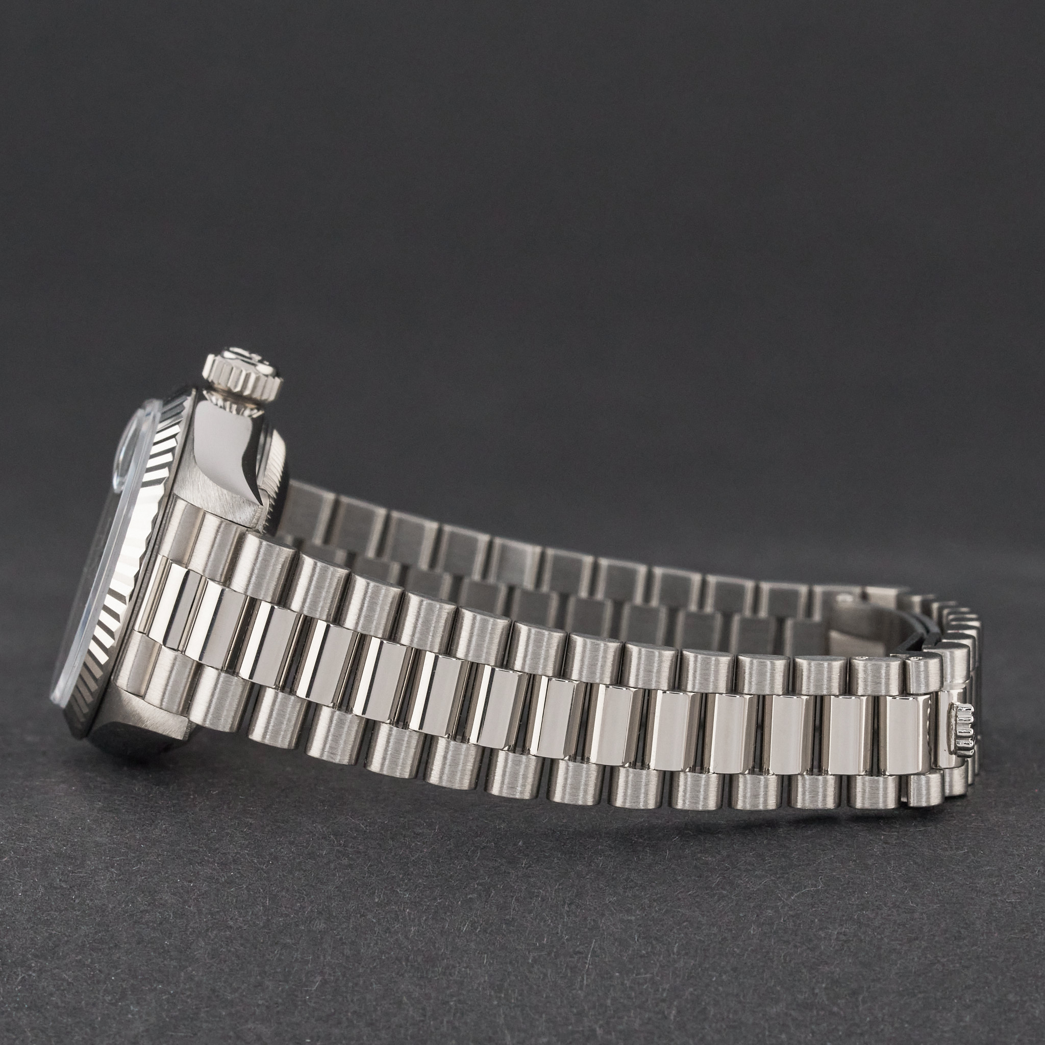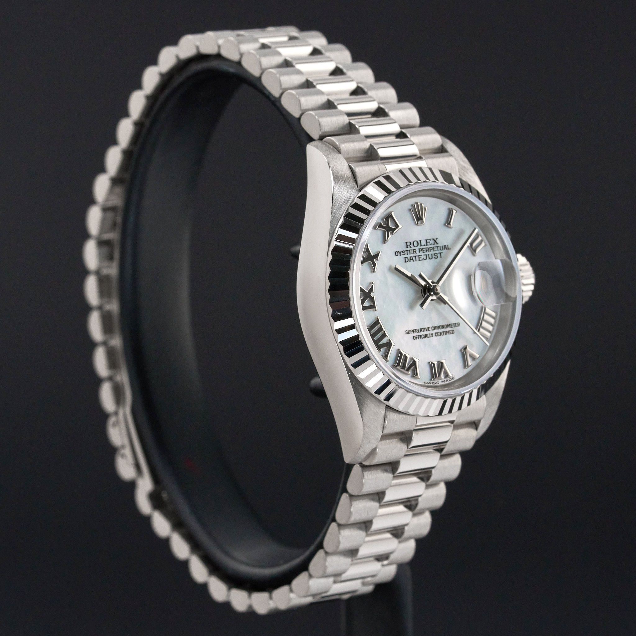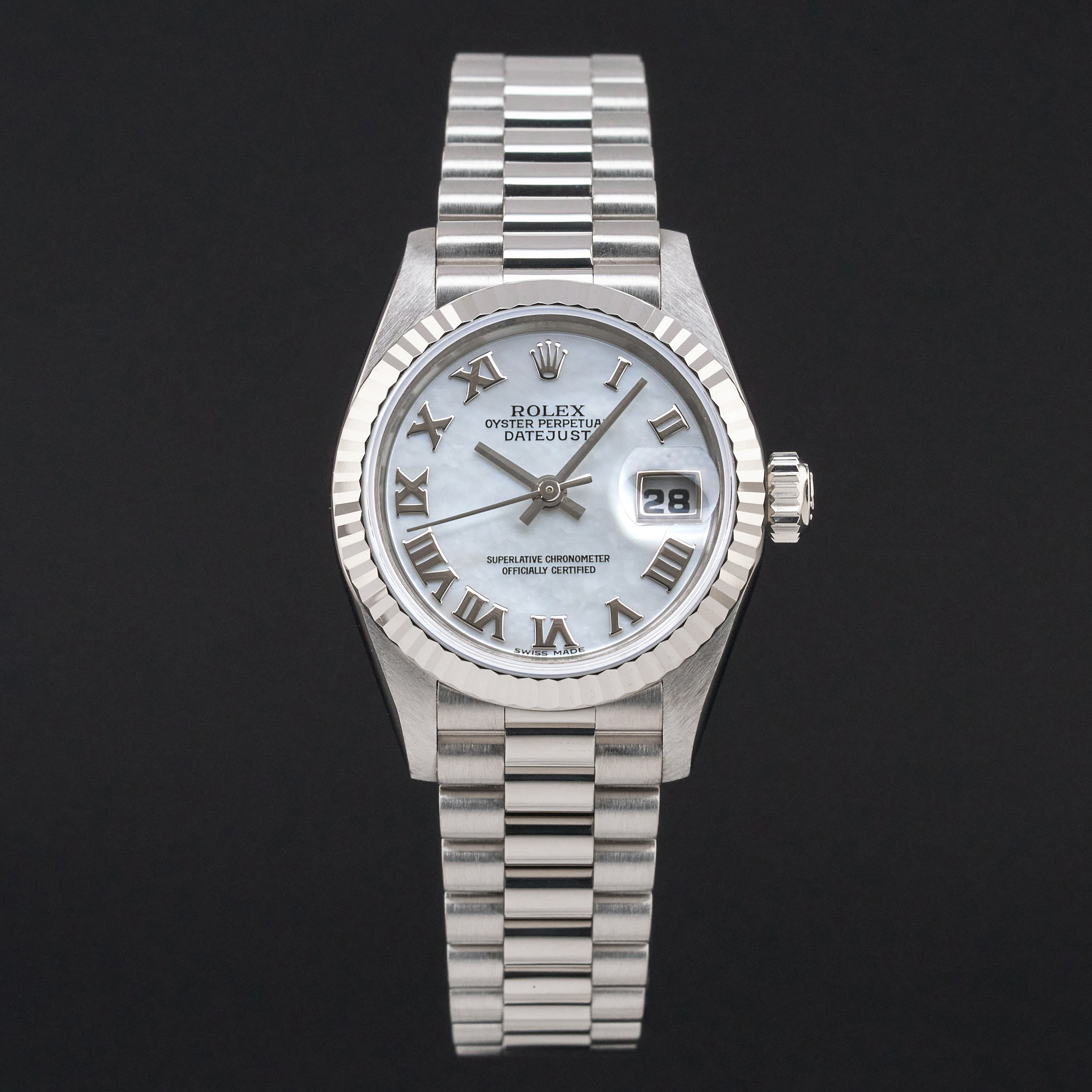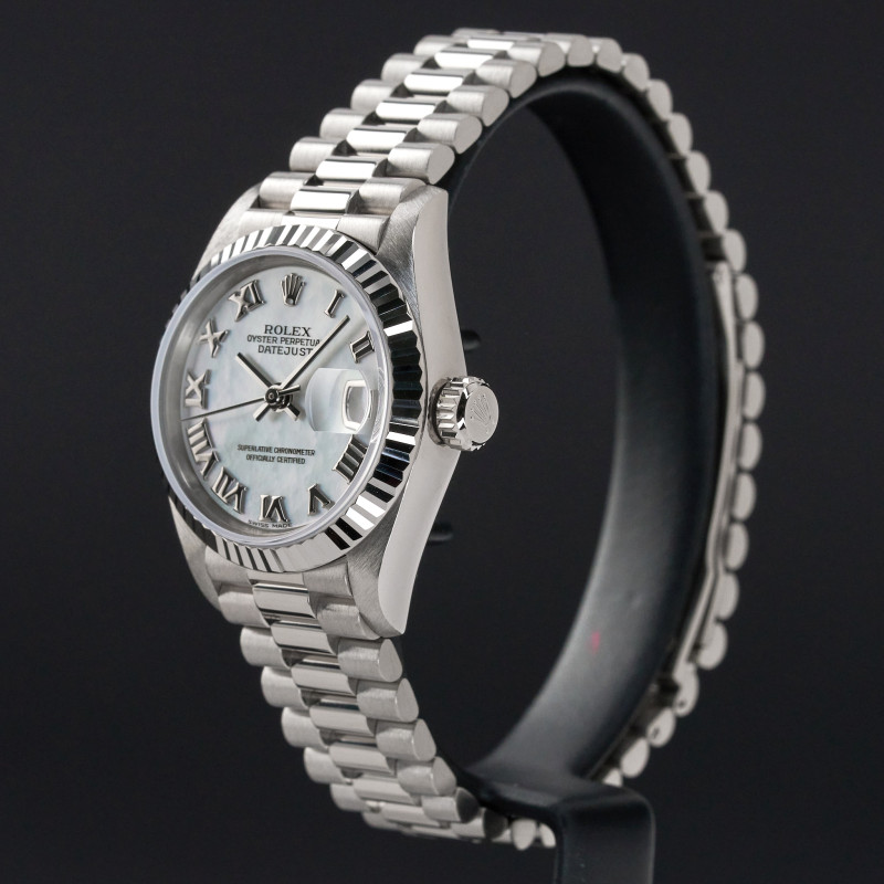 This Rolex Lady-Datejust 69179 features a Silver mother of pearl Roman dial and is crafted from 18K white gold, with a production year of 1993.