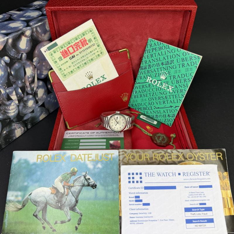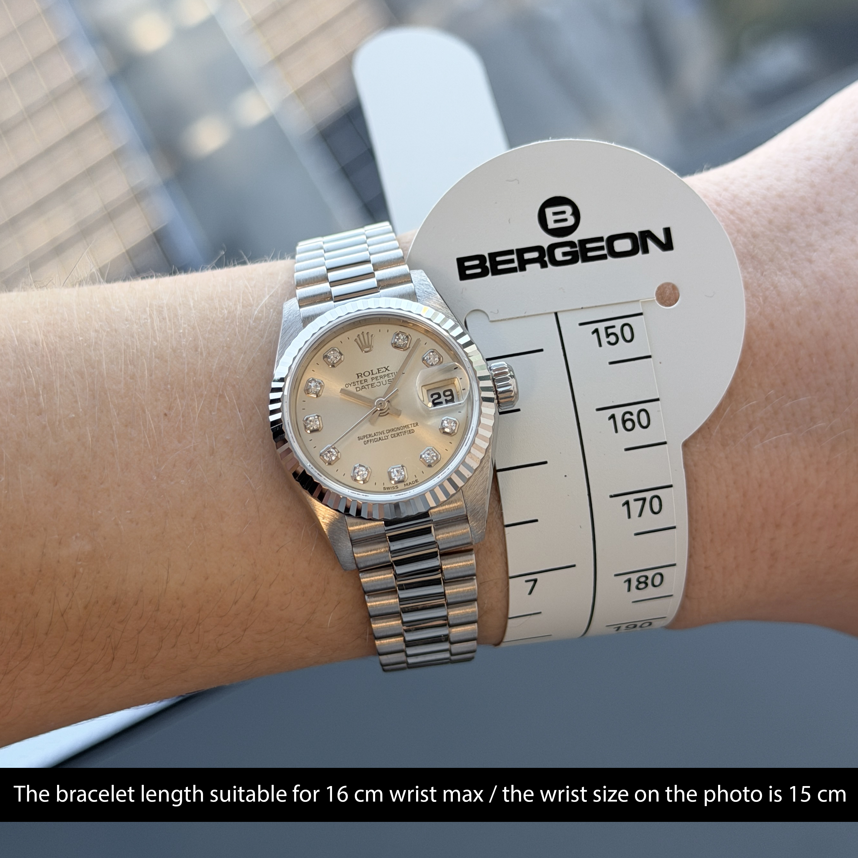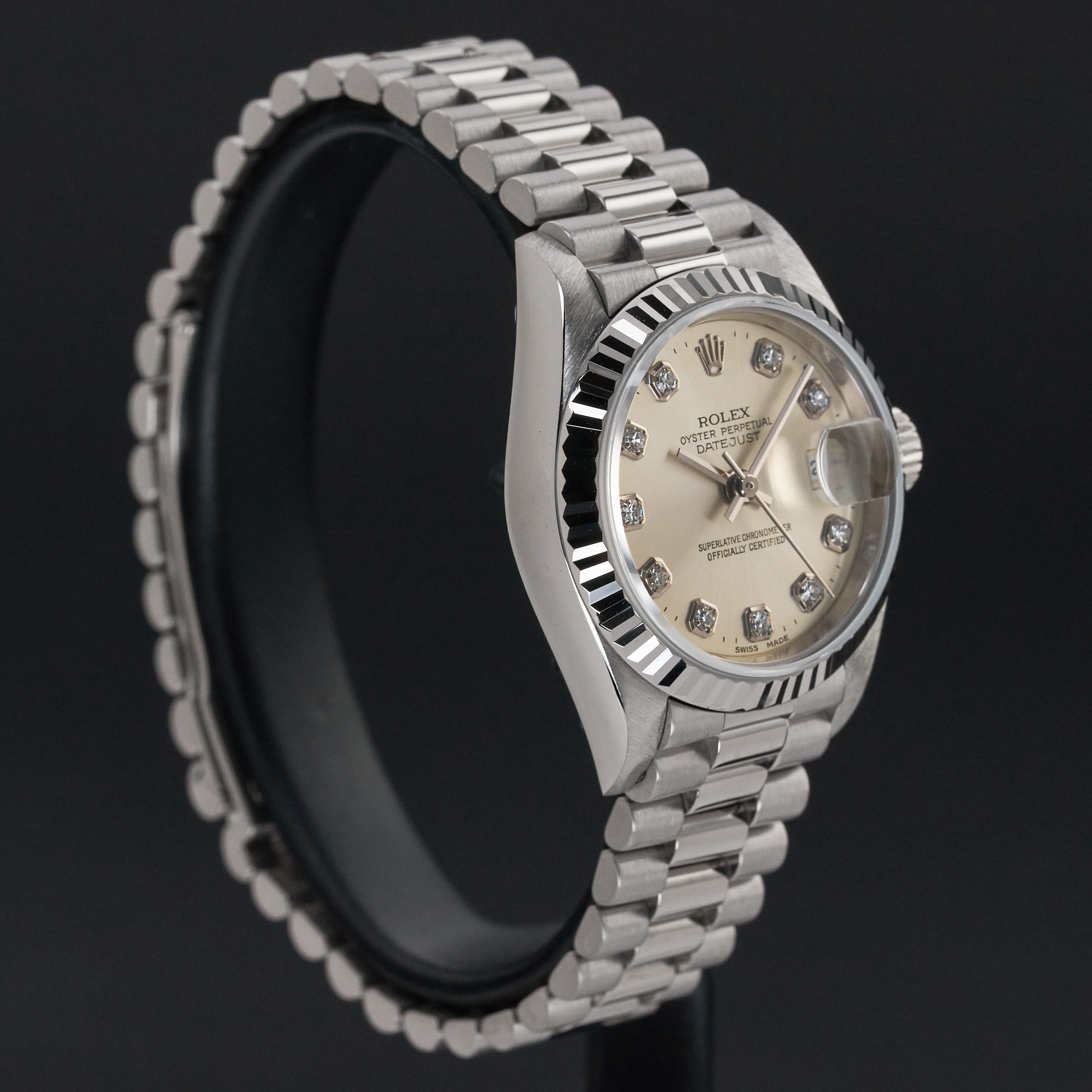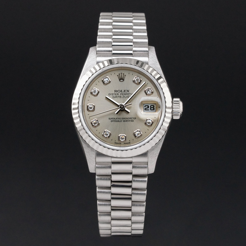This Rolex Lady-Datejust 69179 features a Silver big diamond dial and is crafted from 18K white gold, with a production year of 1995.
